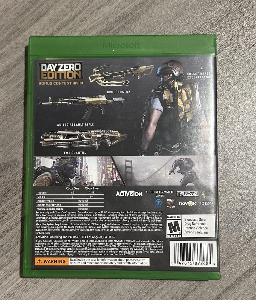 The Call of Duty: Advanced Warfare -- Day Zero Edition for Microsoft Xbox One is a 2014 release by Activision, known for its action-packed shooter gameplay. As part of the popular Call of Duty franchise, this edition offers an immersive gaming experience with intense combat scenarios and advanced weaponry. With a mature rating, players can expect a thrilling and intense gaming experience tailored for older audiences. The NTSC-U/C (US/Canada) region code ensures compatibility with consoles in that region, making it a must-have for fans of the series looking for a new and exciting adventure. 12-16-25