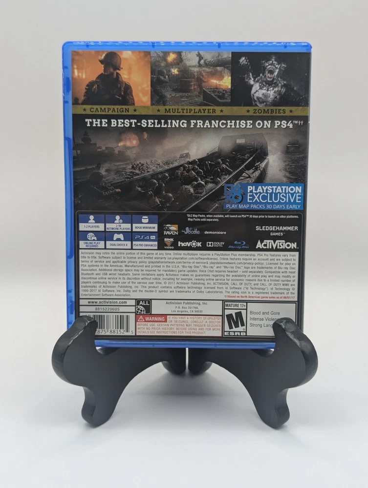 Publisher:Activision ClassicsRating:M - Maturegtin13:047875881082Sub-Genre:Action & Adventure, Call of Duty, First Person Shooter, WWIIRelease Year:2017UPC:047875881082Game Name:Call of Duty: WWIIRegion Code:Region FreeMPN:NAPlatform:Sony PlayStation 4Country/Region of Manufacture:United StatesFeatures:Complete Edition, Multiplayer, Online Playability, PS4 Pro EnhancedGenre:Action & Adventure, Shooter, WarVideo Game Series:Call of Duty