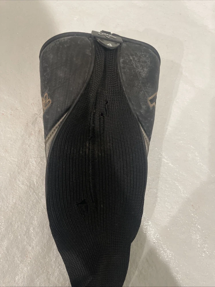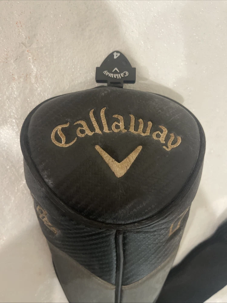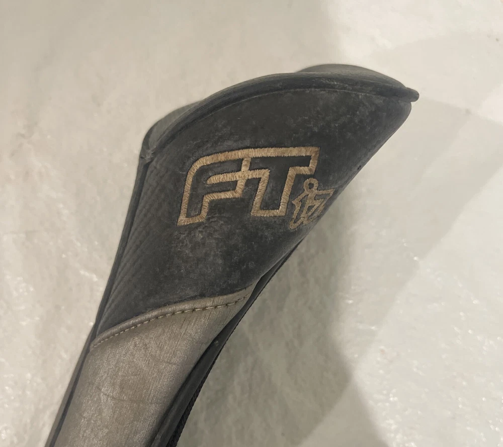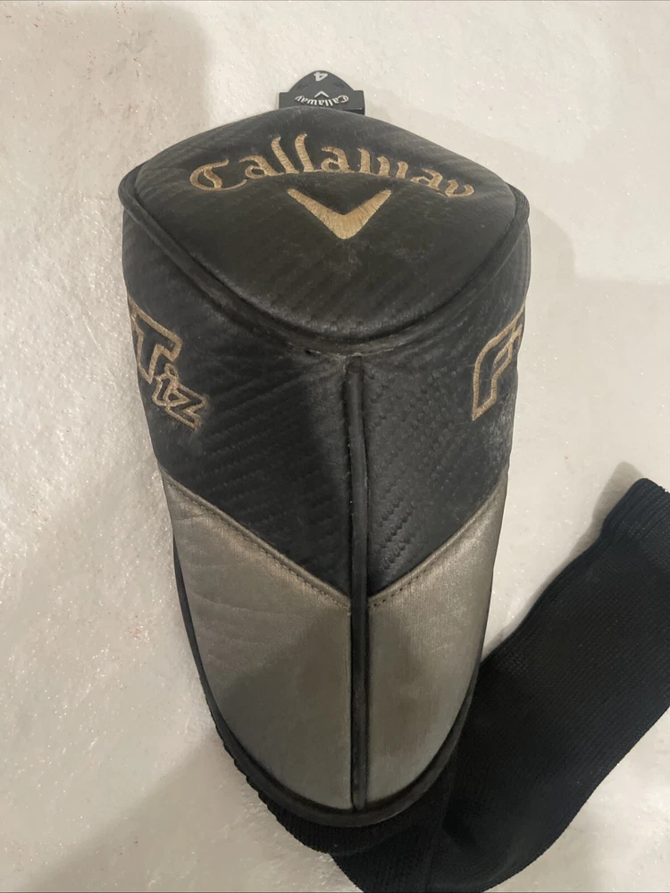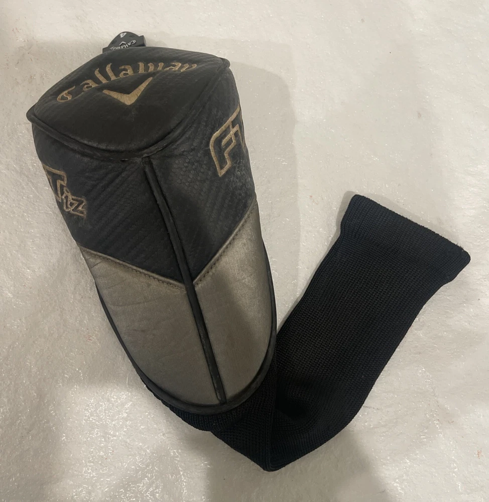The Callaway FT iz Fairway Wood Headcover is a black cover made of vinyl and nylon, designed for golfers to protect and identify their fairway wood. It features easy identification, simple usage, and includes numbers for customization. This headcover is designed for a wood club from the Callaway brand. Great for golf enthusiasts looking to keep their club in top condition on the course. Used in Average Condition.