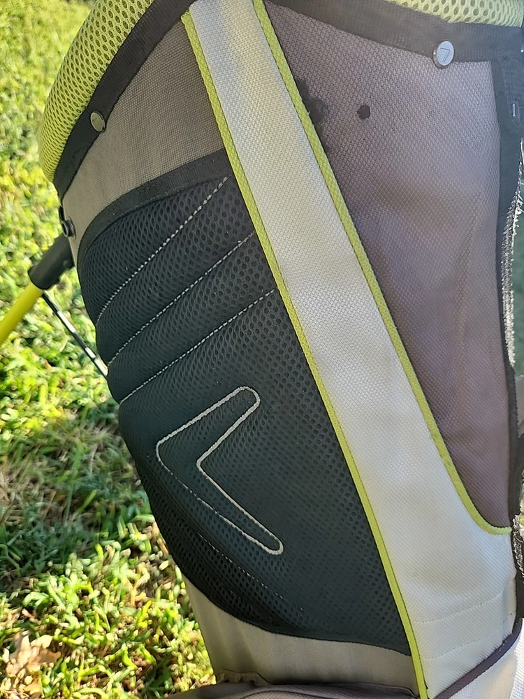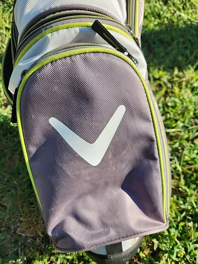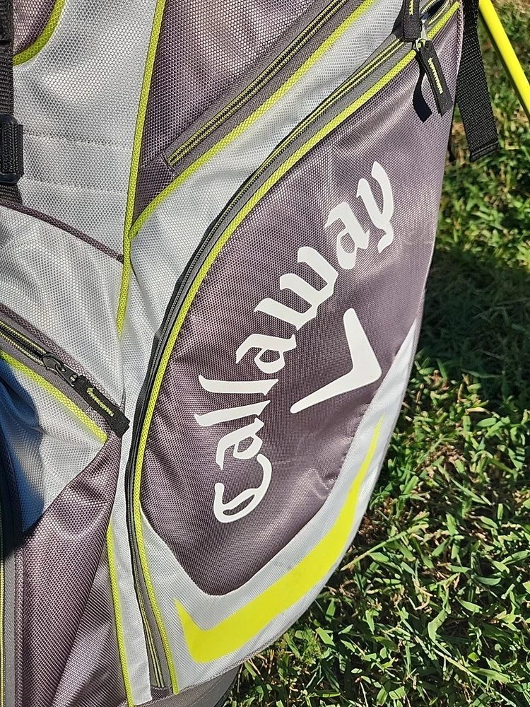 The Callaway Golf 6-Way Cart Bag in gray and green is a large, spacious golf bag. With 6 different dividers, this bag provides plenty of storage for all your golf clubs. The zip closure ensures your clubs stay secure while on the course, and the 5 pockets offer additional space for storing essentials like tees, balls, and snacks. The sport theme and high-quality Callaway branding make this bag a stylish and functional choice for any avid golfer.