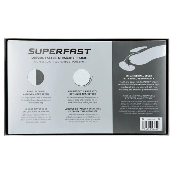 About this item Callaway Golf Superfast 2022 Golf Balls, White, 15 Pack Enhanced ball speed with Total Performance Hybrid Cover features an innovative PARALOID™ Impact Modifier produced by DOW Maximizes distance from high launch and low spin while promoting soft feel and durability Exceptional distance and speed through the bag with High Speed Core Consistently long with optimized trajectory HEX Aerodynamics reduces drag and enhances lift for increased carry and higher flight Product details Callaway Superfast 2022 Golf Balls, White, 15 Pack Callaway Golf Superfast 2022 Golf Balls, White, 15 Pack Enhanced ball speed with Total Performance Hybrid Cover features an innovative PARALOID™ Impact Modifier produced by DOW Maximizes distance from high launch and low spin while promoting soft feel and durability Exceptional distance and speed through the bag with High Speed Core Consistently long with optimized trajectory HEX Aerodynamics reduces drag and enhances lift for increased carry and higher flight Specifications Features No features description available Brand Callaway Manufacturer Part Number 643095915 Assembled Product Dimensions (L x W x H) 5.50 x 7.60 x 1.70 Inches