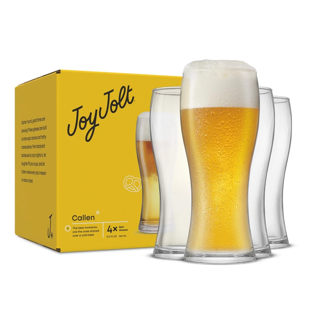 THAT 'BAR’ FEELING! Treat yourself, your mates, and even those ipa lovers to a tall pilsner, craft or pale ale with a glass that feels like time before social distancing! The Callen, set of 4 Beer Drinking Glasses feature a comfy 2.75” wide grip that feels like your brew was poured straight from the tap. A 12OZ WITH ROOM TO FOAM: Callen Craft Beer Glasses hold up to 15.5oz of your favorite Pilsner, IPA, Craft, Lager, Ale, Bitter or Home Brew! So you can pour it like a 12 oz beer glass with a handsome head, or go for the foam-free way of life and treat them like 16 oz beer glasses. But don’t spill it now! LOVES AN ICY COLD BREW: Made from thick glass with a 1.75oz heft and no imperfections or bubbles, you can safely pop these pilsner glasses in the freezer for an ice cold, thirst-quenching brew. And when you’re done, into the dishwasher for easy washing up. At 7.25” tall, they’ll fit just fine! BEER TASTES BETTER: There’s nothing more disappointing than taking that first cold sip from a cheap, thin rim. You’re a man, and you need something you get your manly face into! We crafted each pilsner beer glass with a thick, rolled rim so each drink you take, feels and tastes like a “real” beer! SECURELY BOXED: The Callen Set of 4 Beer Glasses comes securely bubble-wrapped in a thick box, so any plans for gifting will be success! Affordably priced for this type of quality, and with a 12 Month Guarantee, they’re an effortless and meaningful gift for anyone who likes to imbibe joy.