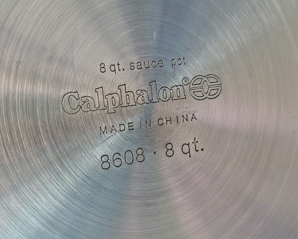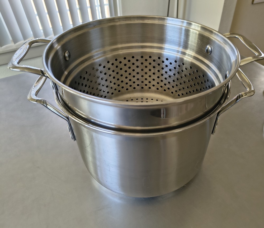 Excellent condition, complete set. The Calphalon 8Qt 8608 Stainless Stock Pot is a high-quality, four-piece set that includes a round stockpot, glass lid, steamer insert, and a capacity of 8 quarts. Made of durable stainless steel, this pot is compatible with both electric and gas stoves, and features a flat-bottomed design and double handles for easy use. It is easy to clean, dishwasher safe, and has a sleek silver color that looks great in any kitchen. Perfect for cooking a variety of dishes, this stockpot is a versatile and reliable addition to any home cook's collection.