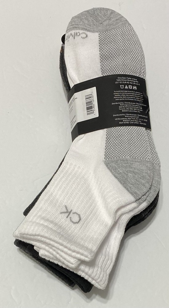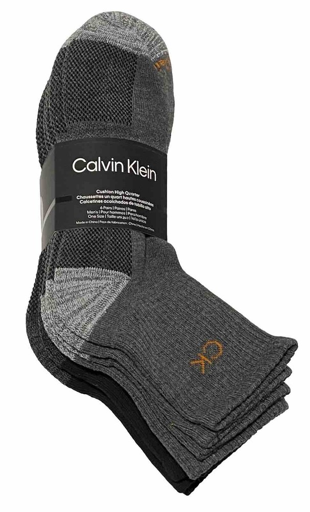 Calvin Klein Men's 6-Pair Cushion High Quarter Socks Assorted Black/Gray/White Calvin Klein Across Sole 97% Polyester 3% Spandex Sock Size: 10-12 fits Shoe Size 7-12