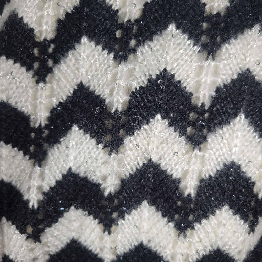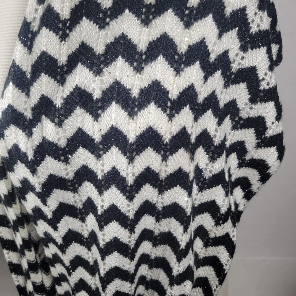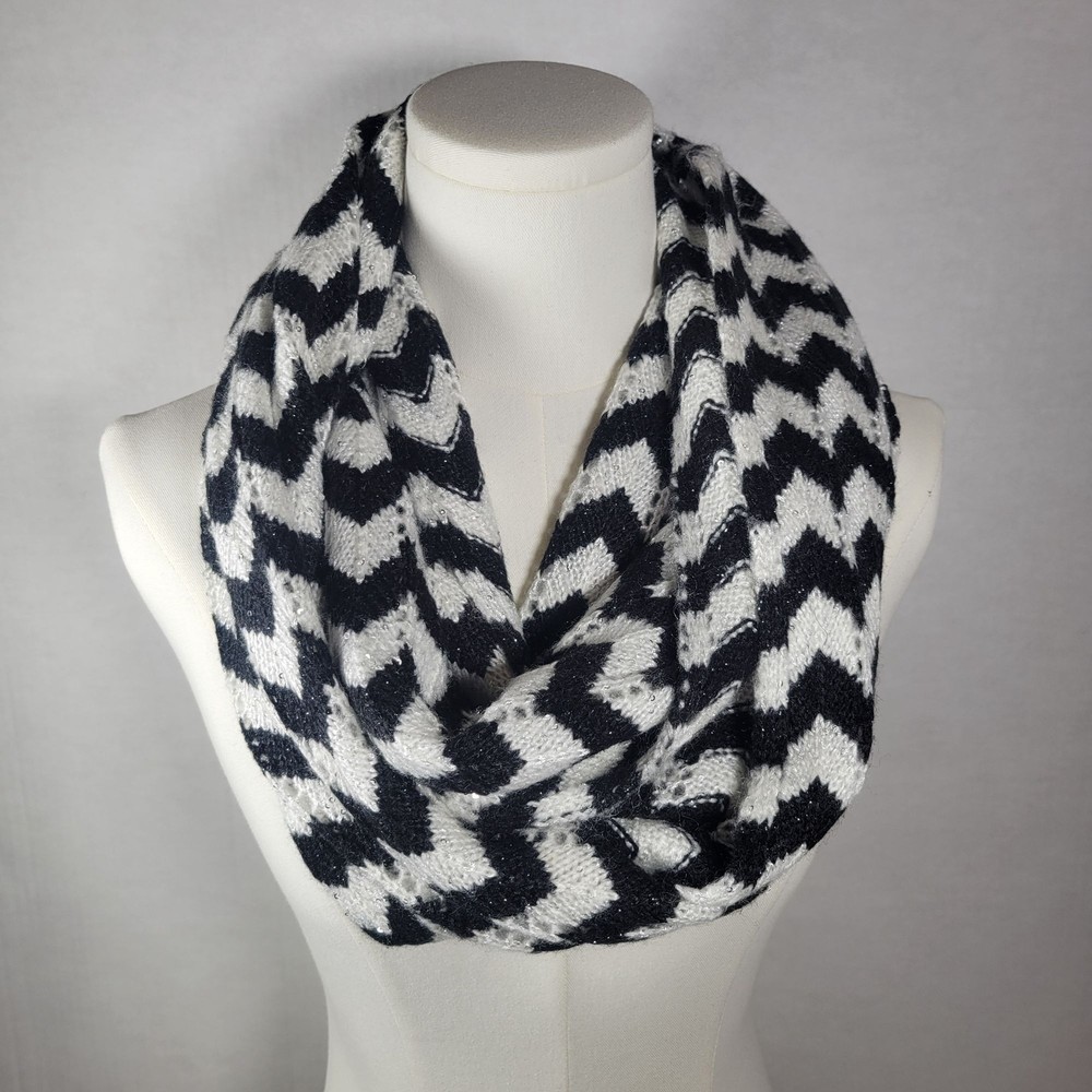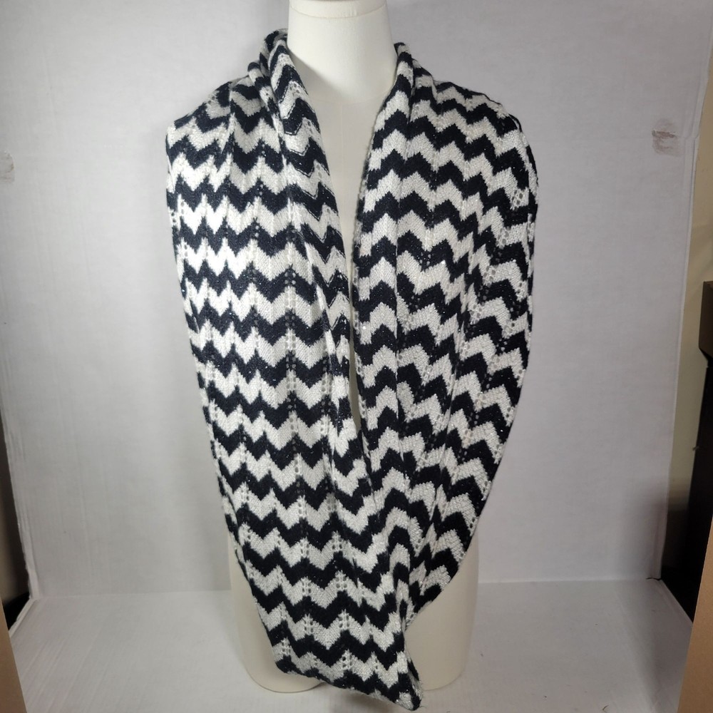 This Calvin Klein infinity scarf showcases a sophisticated chevron pattern in black and white, designed to add elegance to any wardrobe. The knit material provides warmth and comfort, making it a valuable addition to any accessory collection. Its stylish design seamlessly complements both casual and formal outfits. • Chevron pattern design • Infinity style scarf • Soft knit fabric • Elegant black and white colors measures: 64" length 14" width