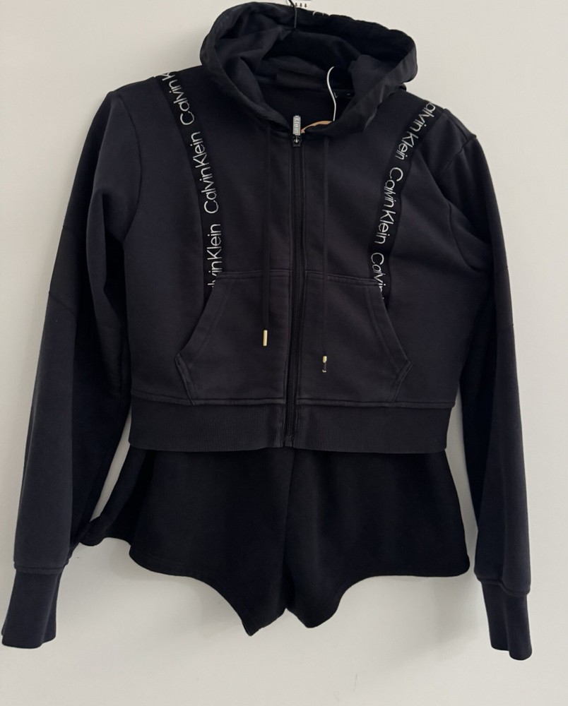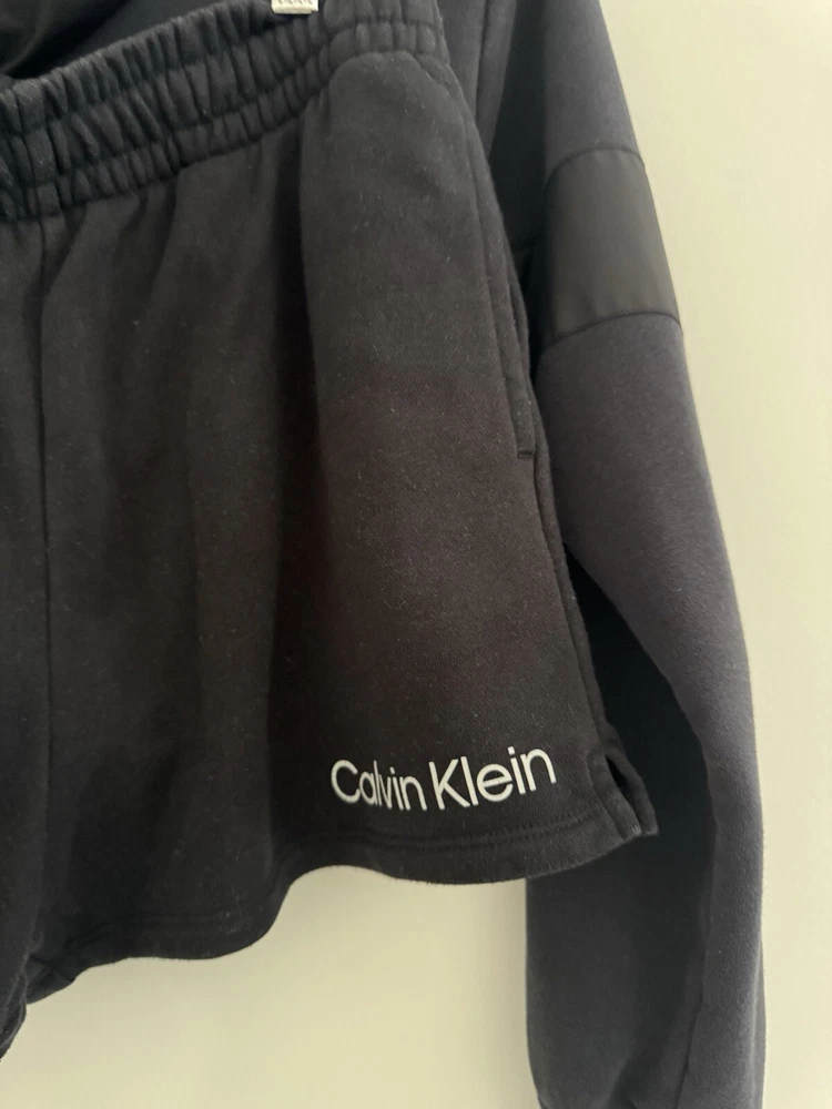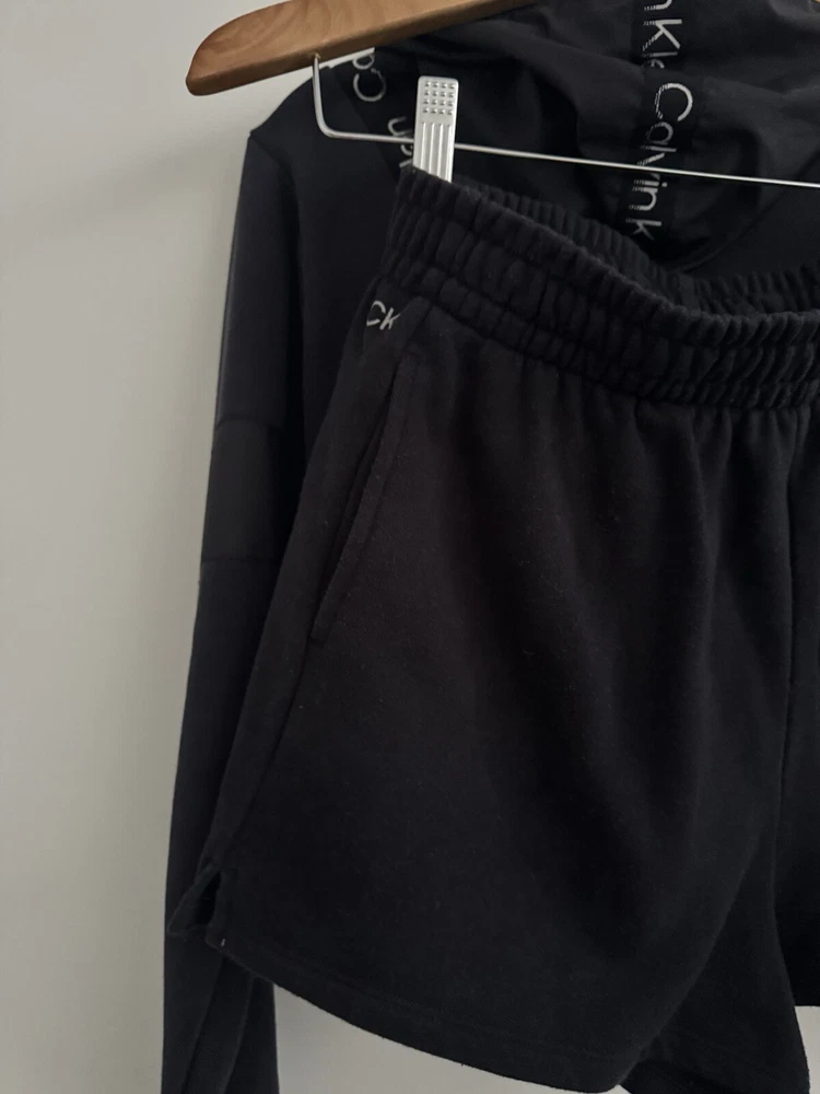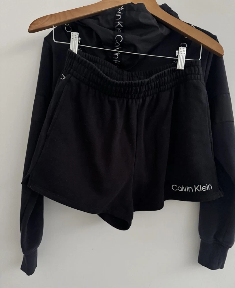 Calvin klein performance woman Calvin Klein Jeans Logo Piping Full Zip Sweatshirt and Matching Short in Black Size Small Woman cotton crop top hoodie & Short Set * side pocket black * Zip * Cotton This beautiful cotton set, purchased in Melbourne, Australia 🇦🇺 Condition: Used, in good condition The hoodie has been washed a few times, which has caused a slight colour difference between the top and shorts.