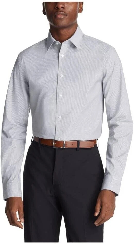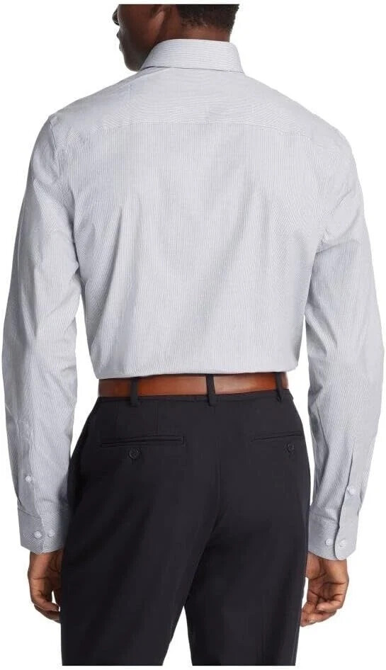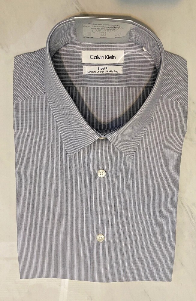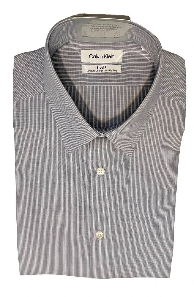Details: Imported Wrinkle free Slim Fit Stretch Steel Machine wash and Dry Wicking: Designed to wick moisture away from the body to help you feel cool and dry. Stretch: Fabric stretches and moves with you for extra comfort. Non-Iron Fabric: resists wrinkles to keep you looking crisp all day; easy care, no ironing necessary. Slim Fit: Modern fit with a tapered body and slimmer sleeves for a sleek look that flatters most body shapes Point Collar: Classic collar thought to lengthen the face & allows for tie knot variety; can be worn with or without neckwear Adjustable Cuff: Two button positions allow for a more customized, improved fit No Pocket: Sleek, streamlined design offers a cleaner appearance.