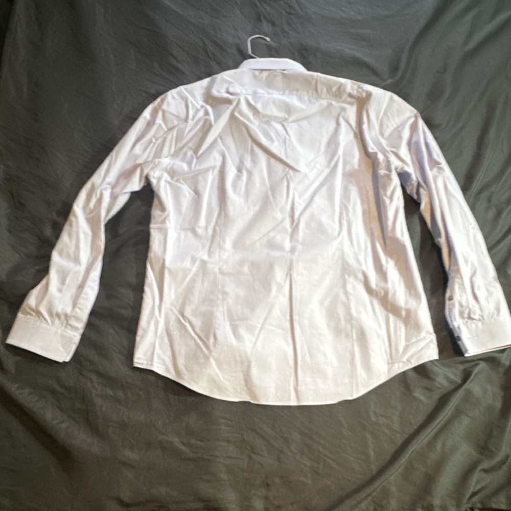 The Calvin Klein Slim Fit Light Purple Stretch Men's Dress Shirt in size 16.5 with a 34/35 sleeve length features a solid pattern, collared neckline, and button closure. Made from woven fabric with a slim fit design, this shirt is perfect for formal and business occasions. Easy to care for with machine washable instructions, it also offers stretch for added comfort. The classic design with accents of button detail and a barrel cuff style make it a versatile and stylish addition to any man's wardrobe.