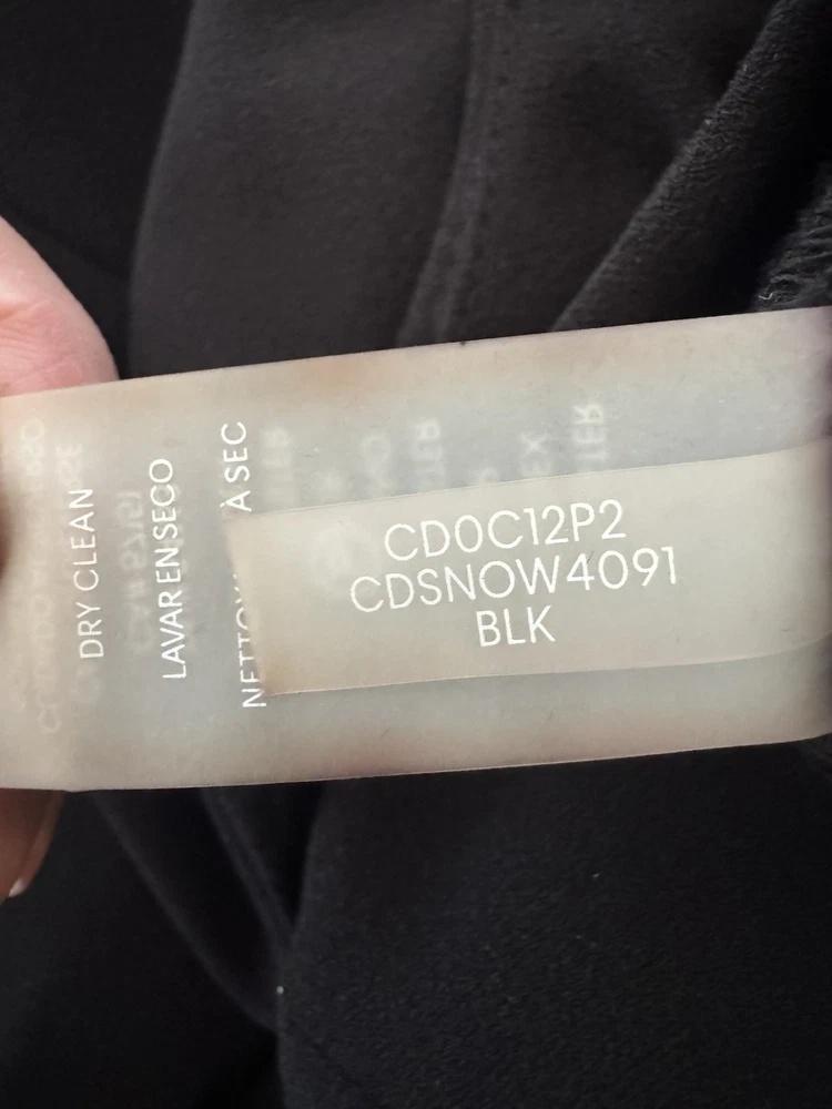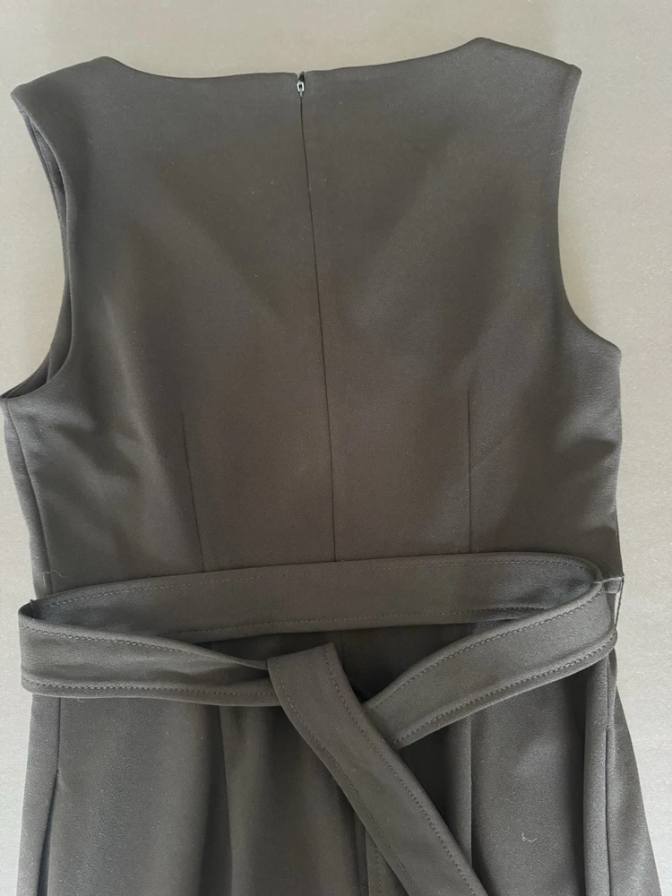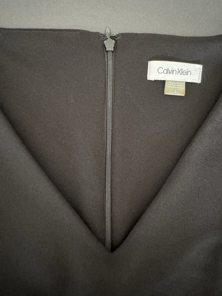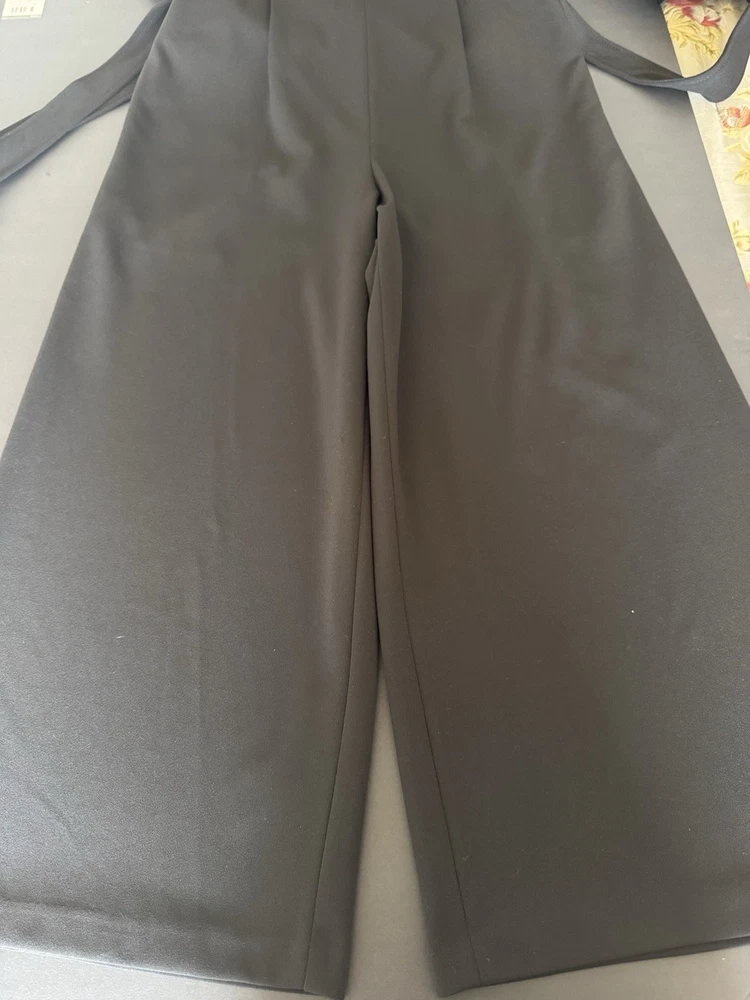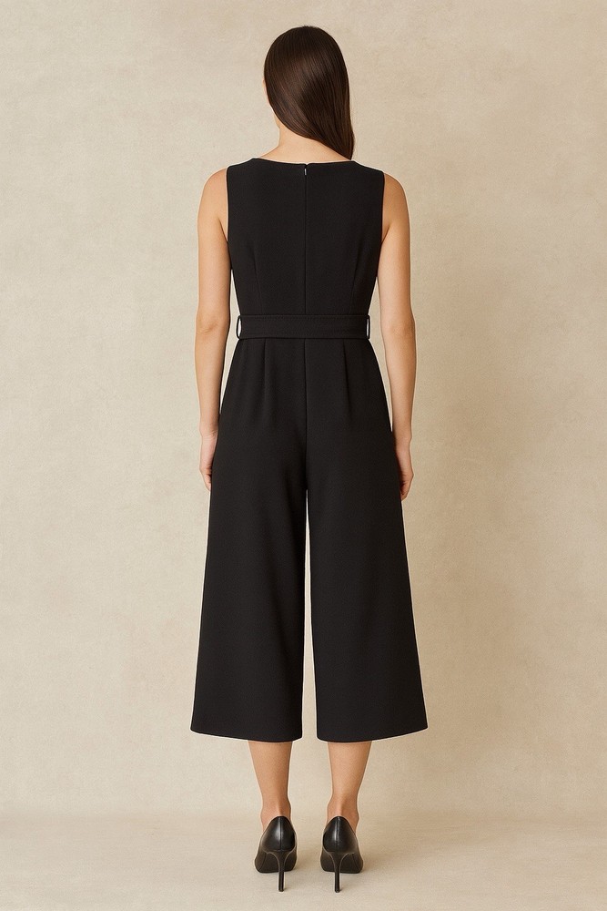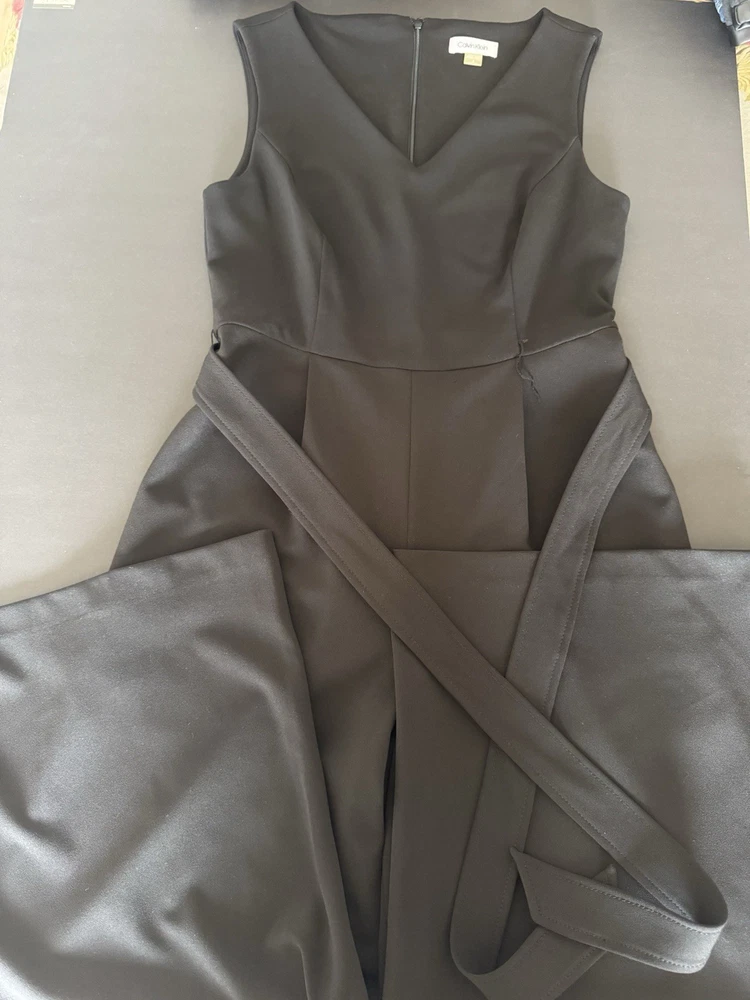 Chic and timeless black sleeveless jumpsuit by Calvin Klein, featuring a flattering V-neckline, waist tie belt, and wide-leg cropped fit that enhances the silhouette with modern sophistication. • Brand: Calvin Klein • Size: 8 • Color: Black • Material: 94% Polyester, 6% Spandex – smooth, slightly stretchy fabric for comfort and shape retention • Closure: Back zipper • Features: • Wide-leg cropped style • Self-tie waist belt • Side pockets • Fully lined • Mid-to-high waist fit • Condition: Excellent pre-owned condition; clean and well-maintained • Care: Dry clean only • Made in: Vietnam • RN#: 54163 • Style Code: CDOC12P2 / CDSNOW4091 BLK Perfect for work, evening events, or a polished day look — pair it with heels and a clutch for a refined outfit.