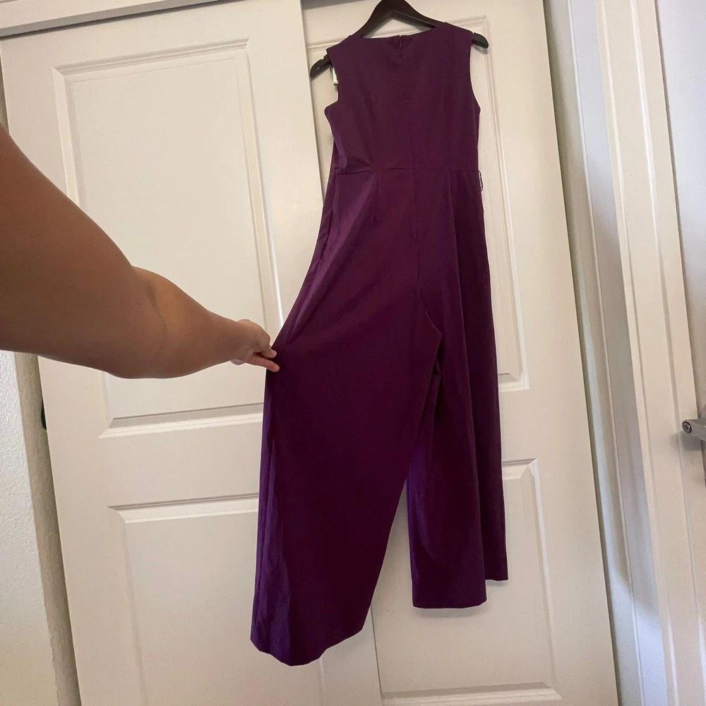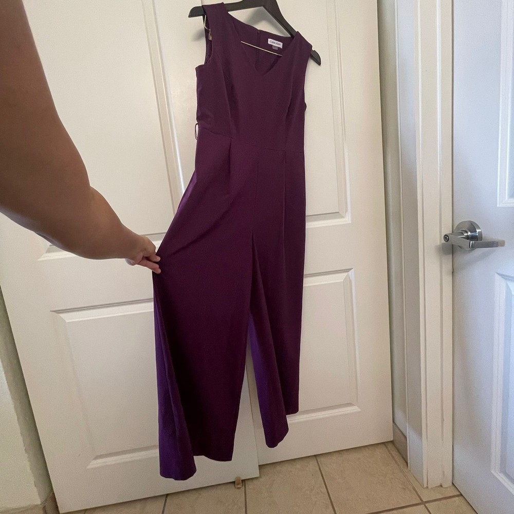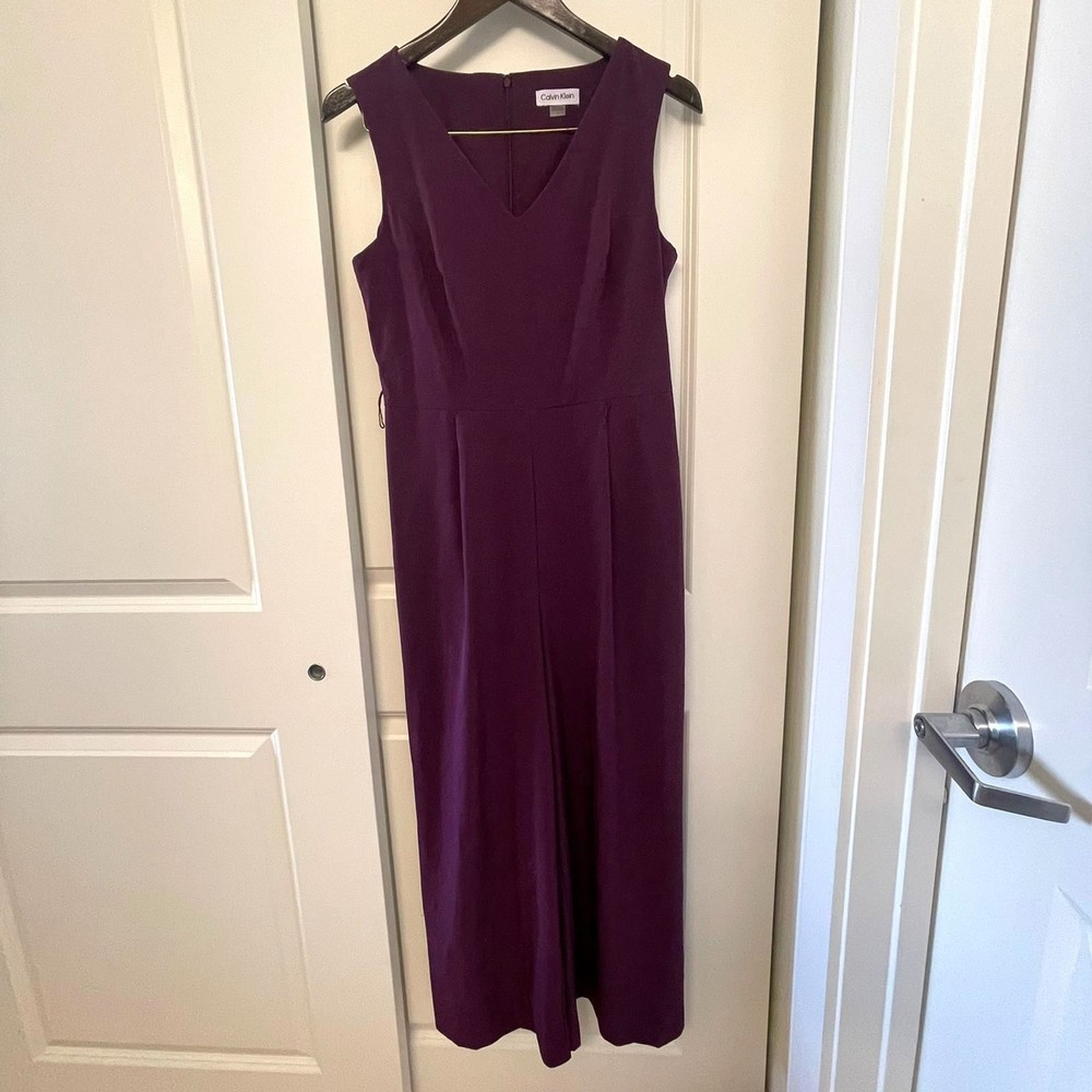 Calvin Klein Women’s Purple Sleeveless V-Neck Wide Leg Jumpsuit – Size 4 Elegant and modern, this Calvin Klein jumpsuit features a flattering V-neckline, sleeveless design, and sophisticated wide-leg silhouette. The rich purple color adds a bold yet refined touch, making it perfect for special occasions, evening events, weddings, or cocktail parties. Designed with clean tailoring for a polished, elongating fit. ✨ Details: Brand: Calvin Klein Size: Women’s 4 Color: Purple Neckline: V-neck Sleeves: Sleeveless Leg Style: Wide leg Closure: back zipper Length: Full length Chic one-piece styling — easy to dress up with heels and statement accessories. 🔹 Condition: Excellent pre-owned condition.