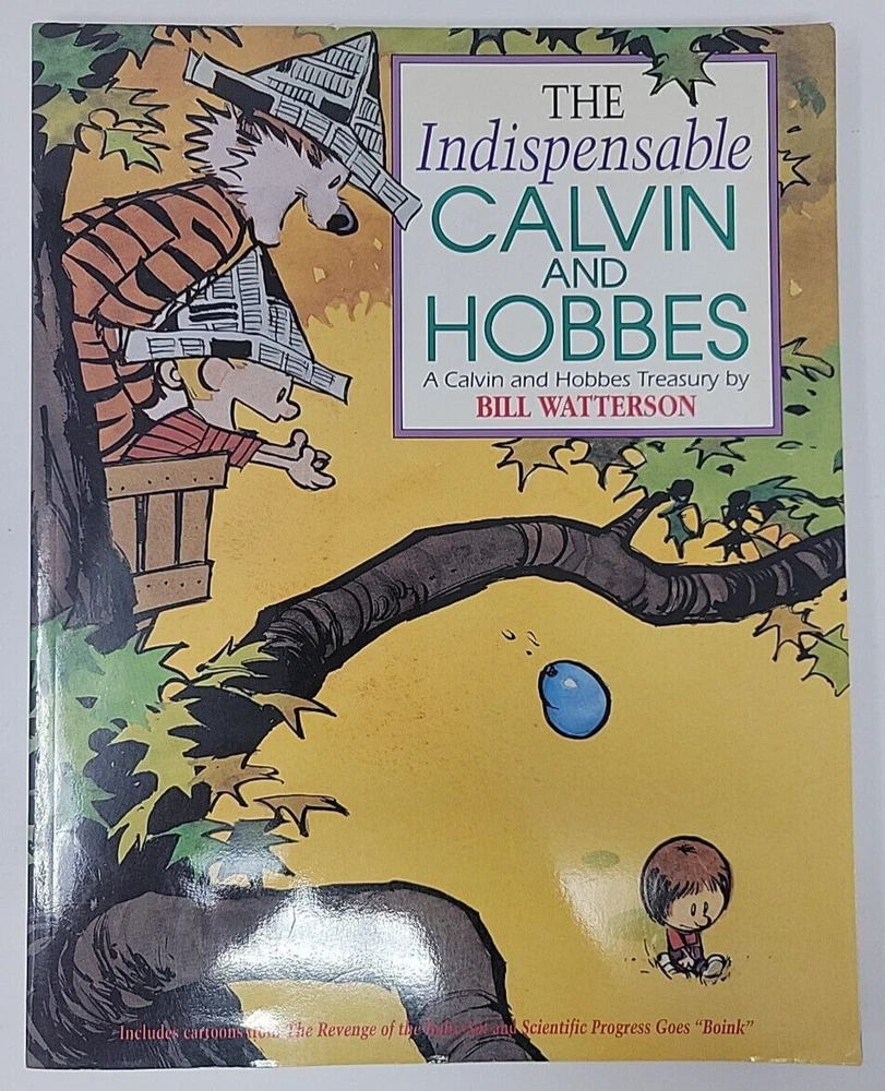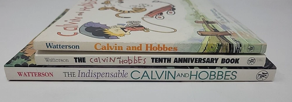 This lot of three vintage Calvin and Hobbes comic book collections is a must-have for any fan of the beloved strip. The tenth anniversary book, The Indespensible Calvin & Hobbes, is included in this bundle, along with two other classic collections. All of the books are in trade paperback format and written in English by author and illustrator Bill Watterson. The comics and humor genre is perfectly embodied in this collection, making it a great addition to any book collection. The books were published by Andrews McMeel Publishing in 1995 and are not personalized or inscribed. The narrative type is fiction, and the books are not ex libris or signed. This lot is perfect for anyone looking to add some vintage charm to their book collection. Includes 1x Indespensible Calvin & Hobbes 1 x Tenth Anniversary Book 1 x Calvin & Hobbes