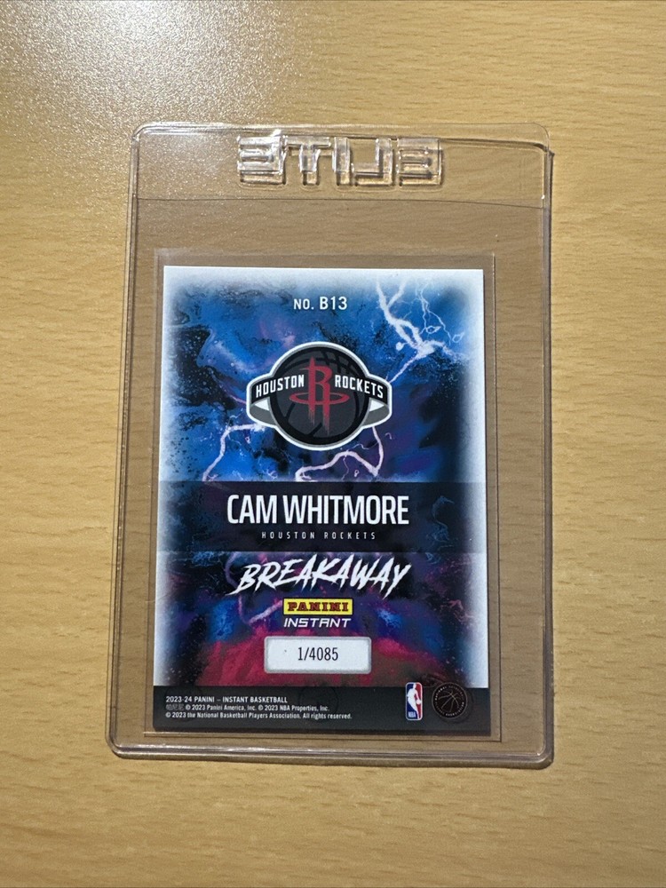 This is a rare and valuable sports trading card featuring Cam Whitmore of the Houston Rockets. The card is from the 2023-24 Panini Instant set and has a print run of 4085. It is a rookie card and has the card number B13. The card is in standard size and is an original licensed reprint from the United States. The card is perfect for collectors and fans of the National Basketball Association (NBA). It is a great addition to any collection and is a must-have for fans of Cam Whitmore and the Houston Rockets. Don't miss this opportunity to own this valuable piece of sports memorabilia.