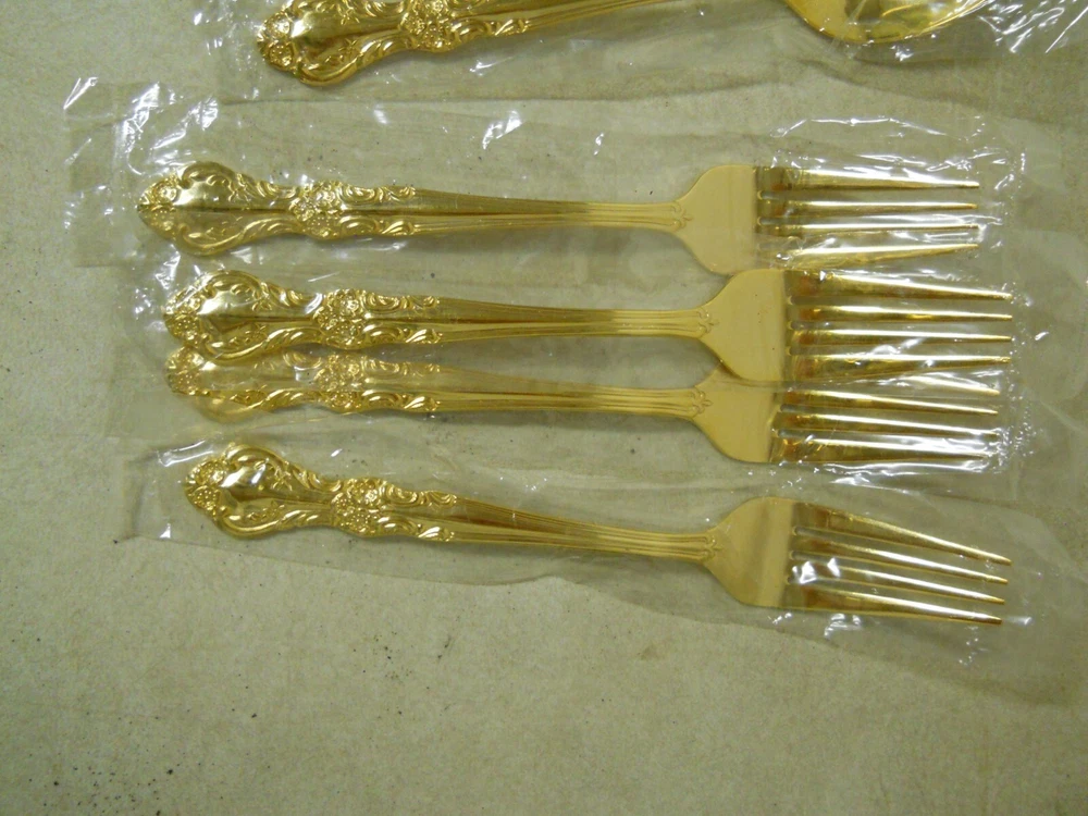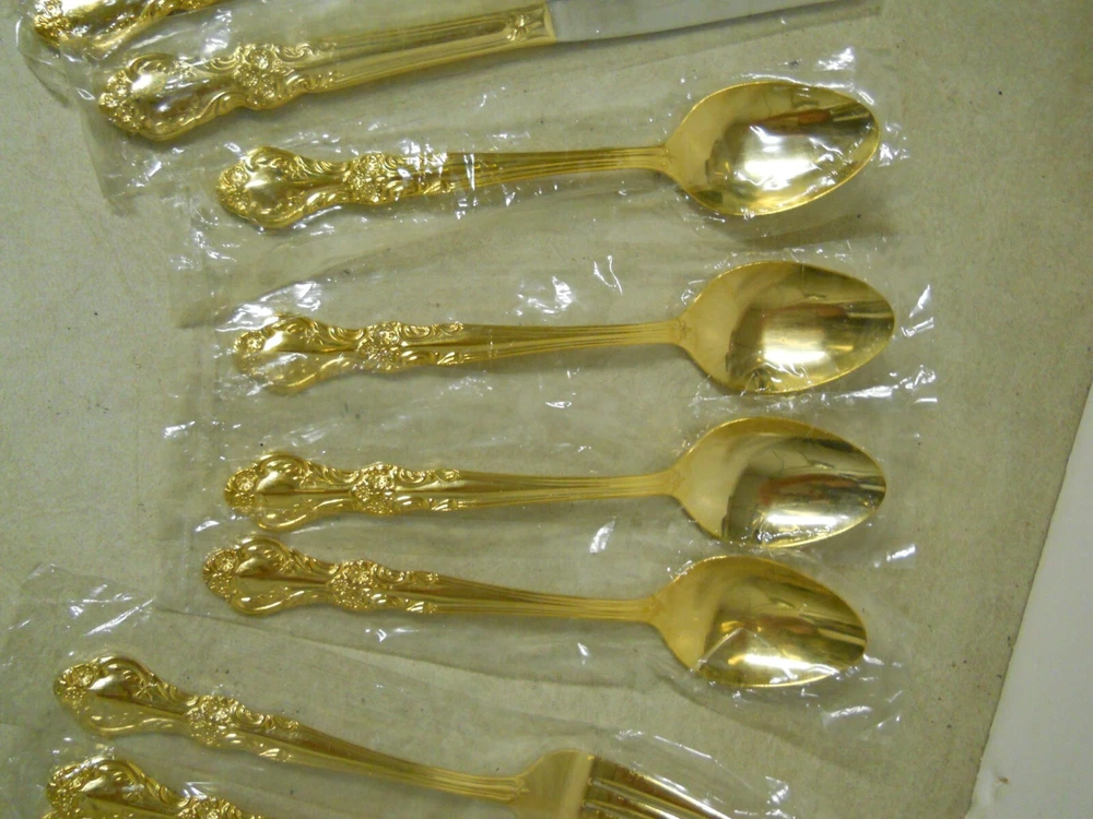 Cambridge Gold Plated Stainless Steel Flatware Replacements Extras Korea New old stock. In original plastic bags. Not sure the name of the pattern. Set includes: 4- Oval place soup spoons 7" 4- Solid handle dinner knives 8-3/4" 4- Dinner forks 7-1/2" Great for replacements or extras for your existing set. ******************************************* *************** PLEASE READ : I buy mostly estates, close outs, shelf pulls, and auction items. As the history of the item is not always known. I will describe all of my items listed to the best of my ability, if there are any flaws to the item it will be noted in the listing and photos of the flaw shown. At times I may miss a flaw, as I am only human. Please contact me and I will make it right and make sure that you are happy with you interaction and purchase from Big Man Tim's Treasures. Please see all photos and ask any qu estions BEFORE purchasing. FREE SHIPPING! Love this item? Check out the other items in my Ebay store! Please check back on a regular basis, as we list new items daily!! 121724EP warehouse