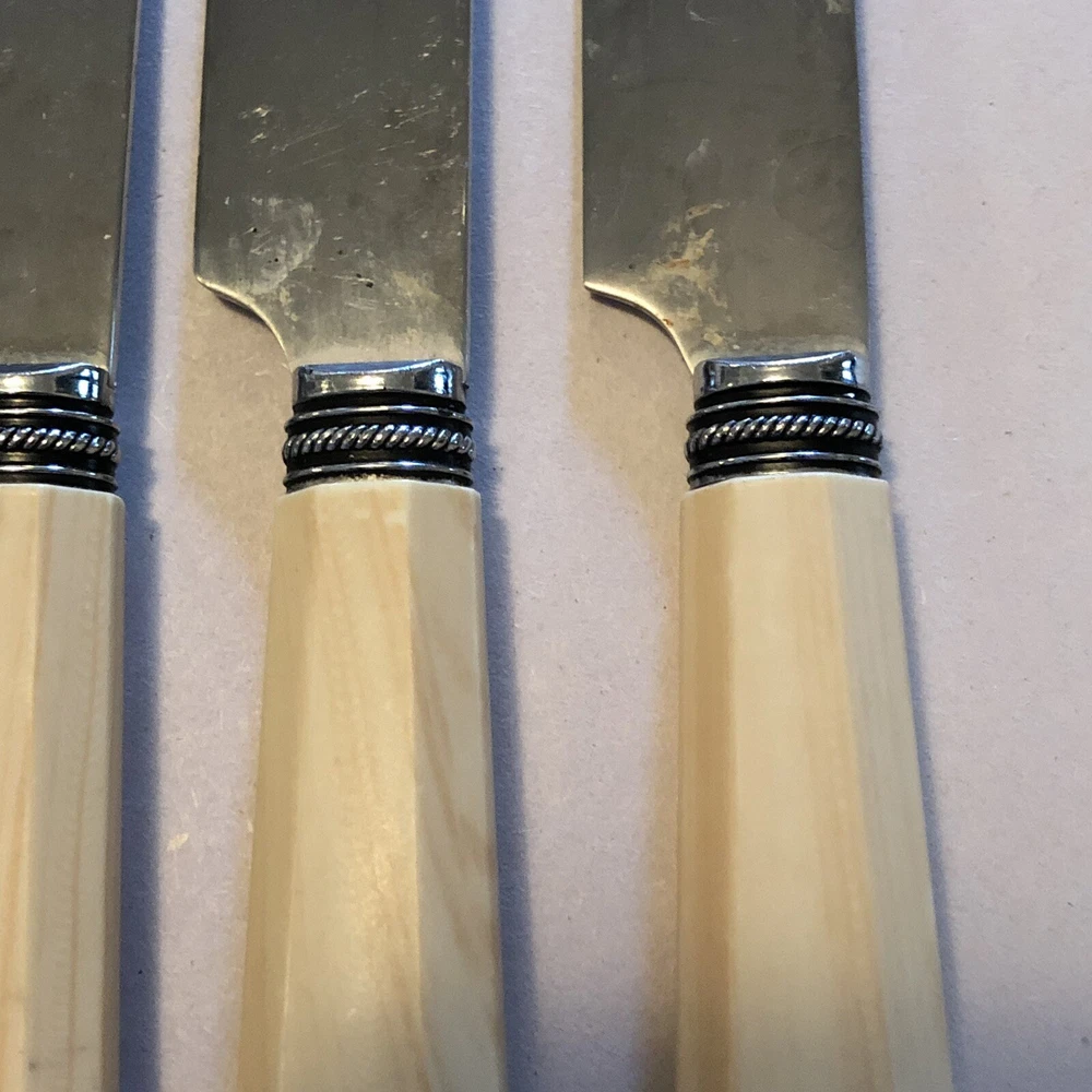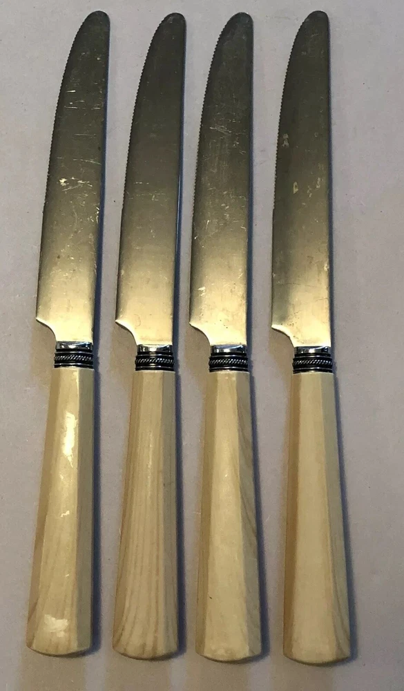 Set of 4 Dinner Knives. Marked on back: Cambridge Stainless China. Each measures approx. 9 1/4" long. Shows signs of light use and may need additional cleaning. Little spotting in places but no dishwasher or disposal damage. Overall very nice condition. Please see pictures for details as this is part of my description.