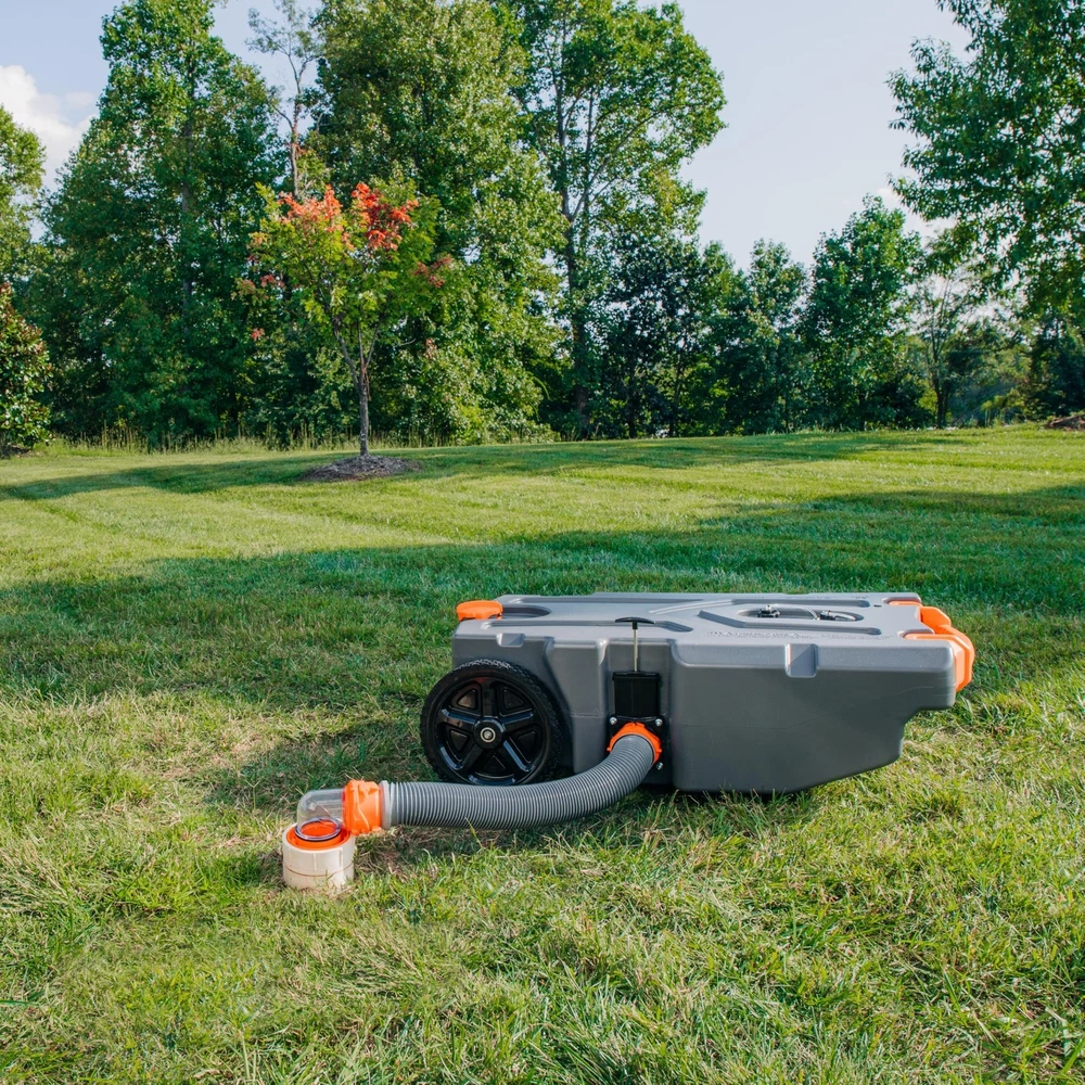 About this item Simplify RV Waste Disposal: Make waste disposal hassle-free with Camco's portable waste tank. Easily transport waste from your RV black water tank to a dump station— perfect for when you're parked far away & your RV sewer hose won't reach. Effortless Transport: Haul your waste with ease with no-flat wheels built for any terrain, an oversized handle for easy maneuvering, & a steel tow adapter for effortless towing behind a truck or golf cart. Tough & Reliable: Measuring 15 ½″ (L) x 25″ (W) x 46″ (H) and weighing 45 lb, this RV essential is constructed from durable, UV-stabilized blow-molded HDPE. It withstands outdoor use without leaks or sun damage. Patented Design Made In The USA: Rhino Tote Tanks are proudly manufactured in the USA with premium materials for unmatched durability. The patented design ensures exceptional craftsmanship and quality. RV Tote Tank Features: Rhino’s 36-Gallon Tote Tank is equipped with (2) oversized wheels, a large handle, tank rinser, ladder hook, and gate valve for easy use. Kit Accessories: This kit includes (1) tote tank, (1) 3' sewer hose w/swivel fittings, (1) 15″ female/female grey water hose, (1) clear elbow w/4-in-1, (1) clear double bayonet elbow, (4) storage caps, (2) caps w/lanyards, & (1) steel tow adapter. Easy To Clean: This RV camping must-have comes with a built-in gate valve for quick emptying. The smooth interior makes cleaning a breeze and the integrated tank rinser ensures a thorough cleanse with minimal effort. Simple To Store: Hang the portable waste water tank on your camper ladder using the ladder hook. Secure the Camco tote with tie-down straps that fit into grooves on the tank body. The 3' sewer hose compresses for storage.