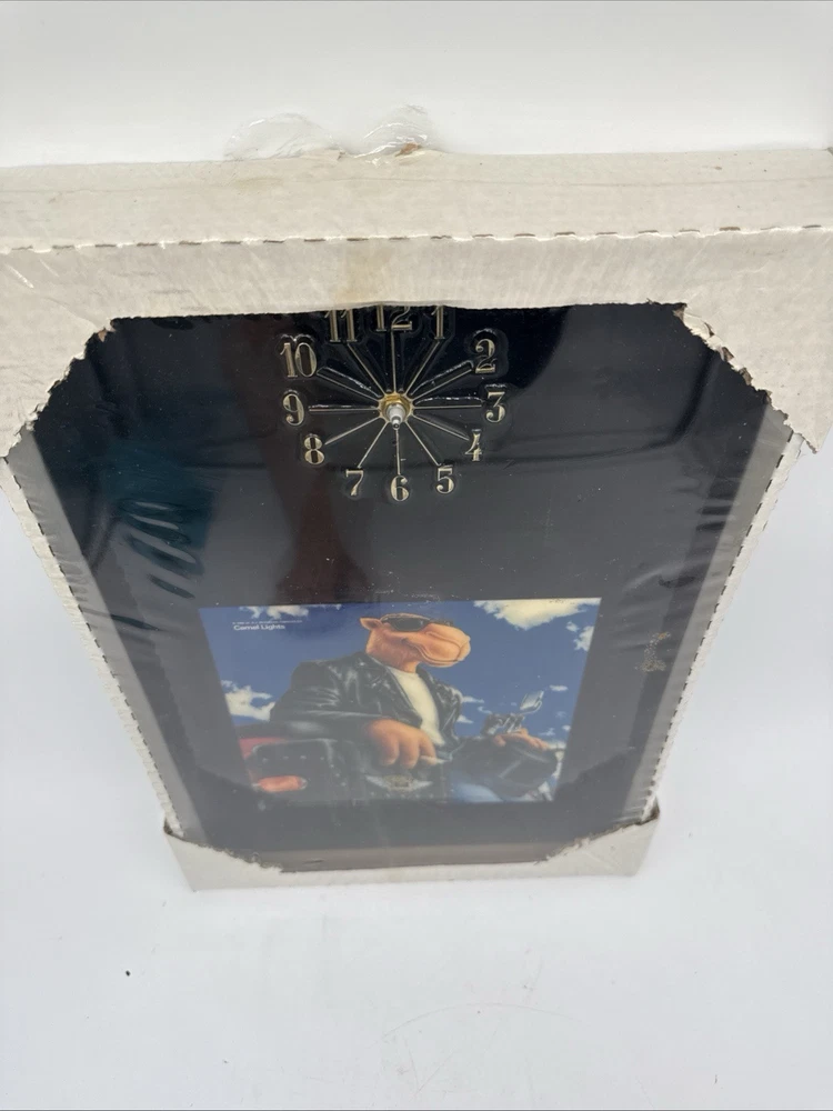 Approx 19"x12". Enhance your space with a sleek, timeless piece that combines functionality with a touch of vintage flair. The Camel Lights Wall Clock is a newly revealed old stock item, featuring a classic black design that effortlessly complements any room. Its distinctive Joe Camel Leather Jacket Motorcycle theme adds a unique appeal, making it a standout addition or a thoughtful gift for collectors and enthusiasts alike. Crafted with precision, this clock is a testament to the enduring legacy of the Camel brand. Its unbranded versatility allows it to blend seamlessly with various decor styles, from rustic to modern. The clock's rich history and iconic branding make it more than just a timekeeper; it's a statement piece with a story.