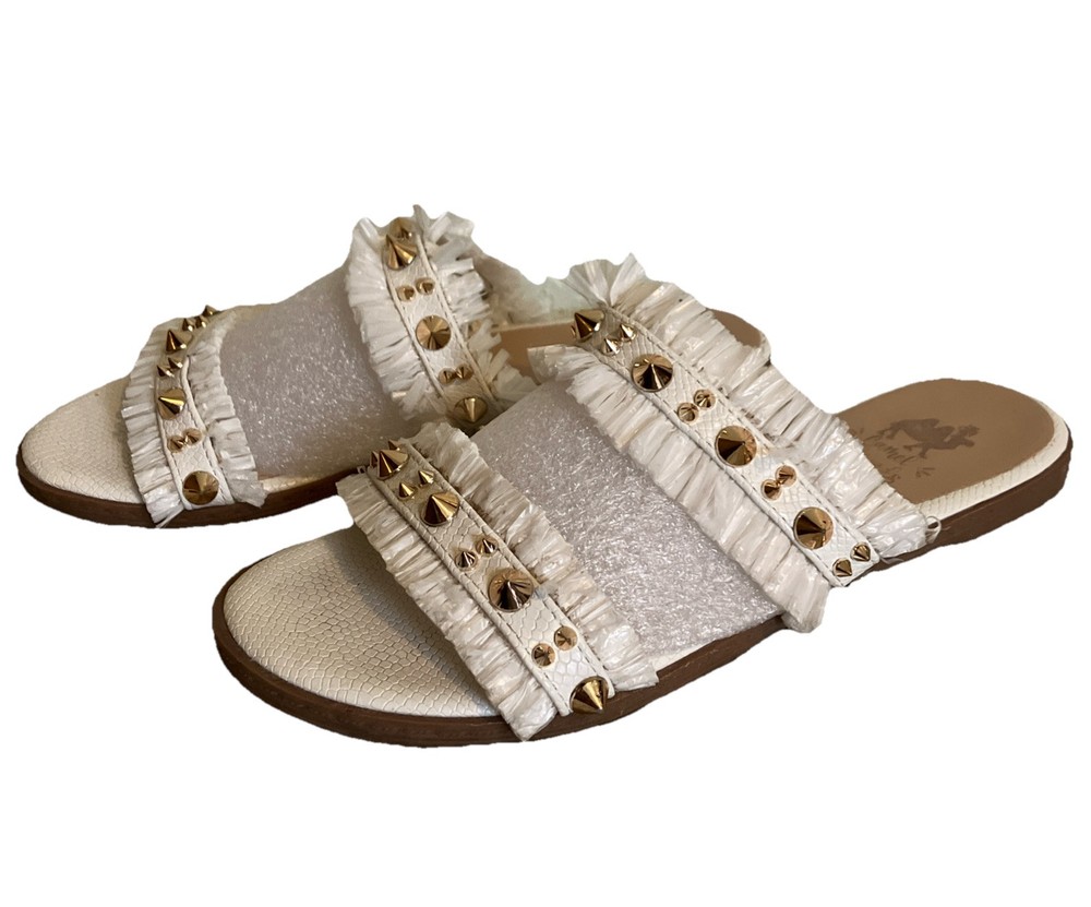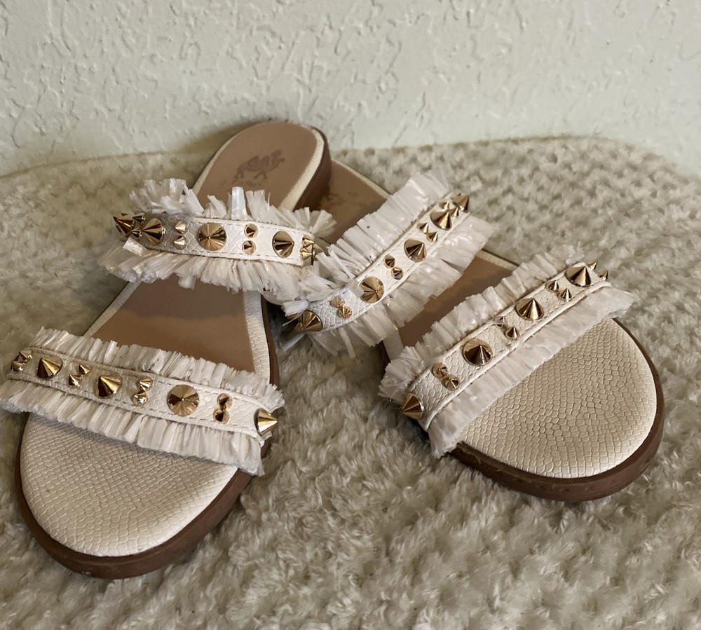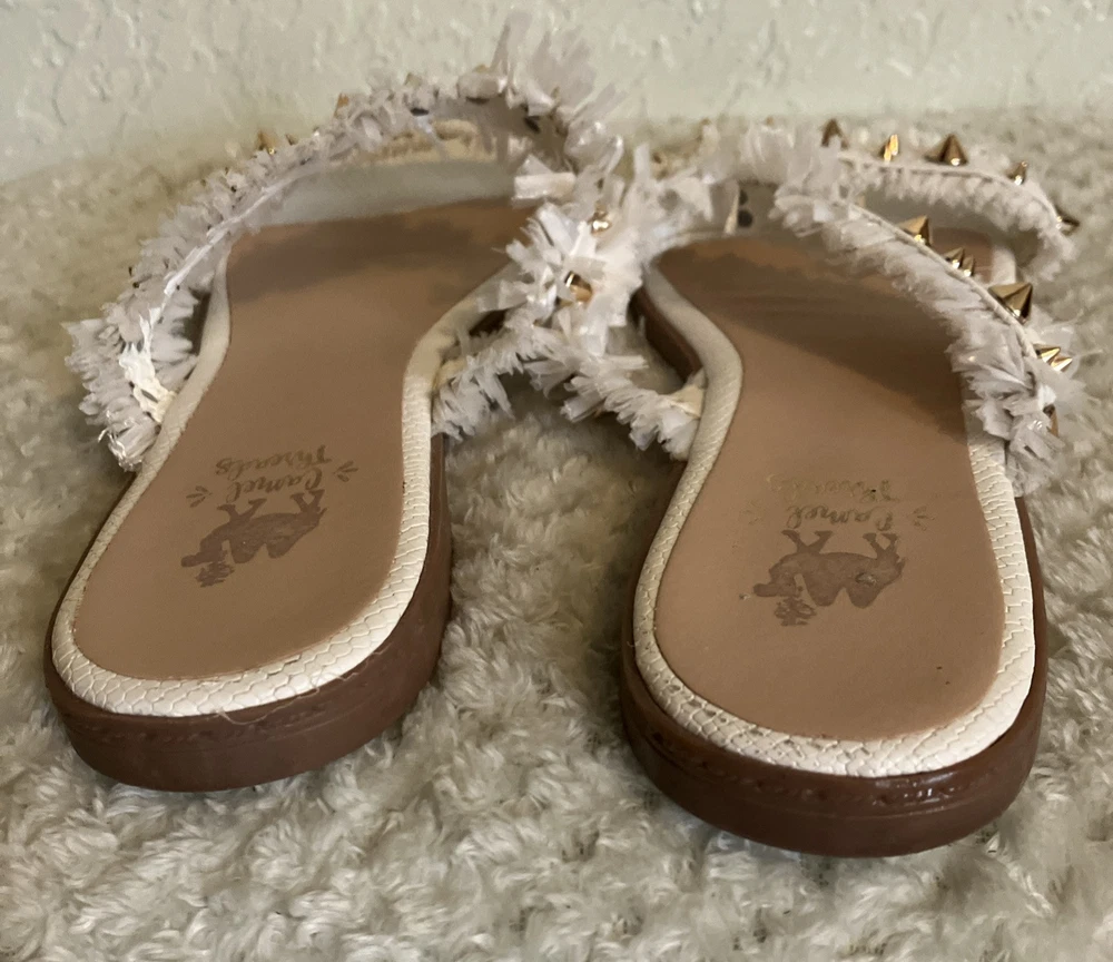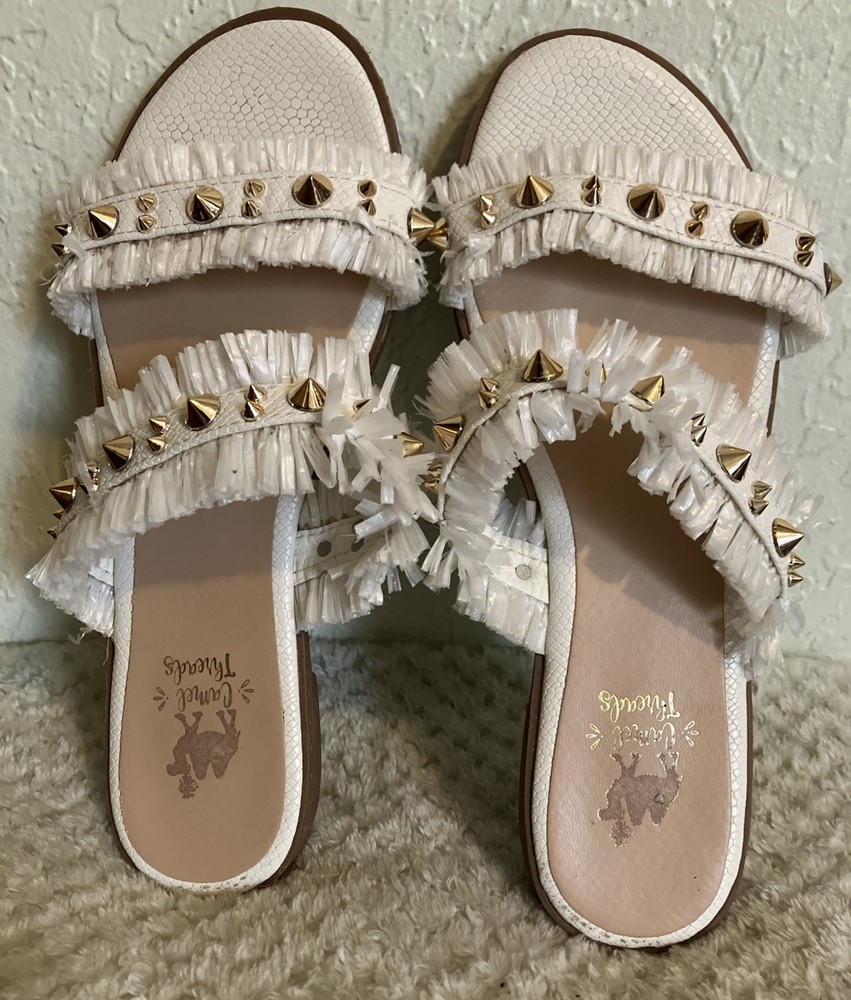 Camel Threads Women's Size 7.5 Blair Pearl Fringe Gold Spike Sandal Measures 9.5”x 3.5 Looking for a sandal that's chic, stylish, and unique? Then you need the Camel Threads Blair Double Strap Sandal in your life! This sandal features two straps adorned with gold studs, as well as intricate straw details in a beautiful white hue. Whether you're dressing up for a special occasion or simply want to add a touch of glamour to your everyday look, these sandals are perfect. Plus, they're ultra-comfortable so you can wear them all day long without issue. Don't miss out on this must-have style - grab a pair of Camel Threads Blair Double Strap Sandals today! If you are in between sizes, we suggest sizing up. Measures 9.5x3.5 Details: • Gold Studded • White Straw Double Straps • Cushion insoles