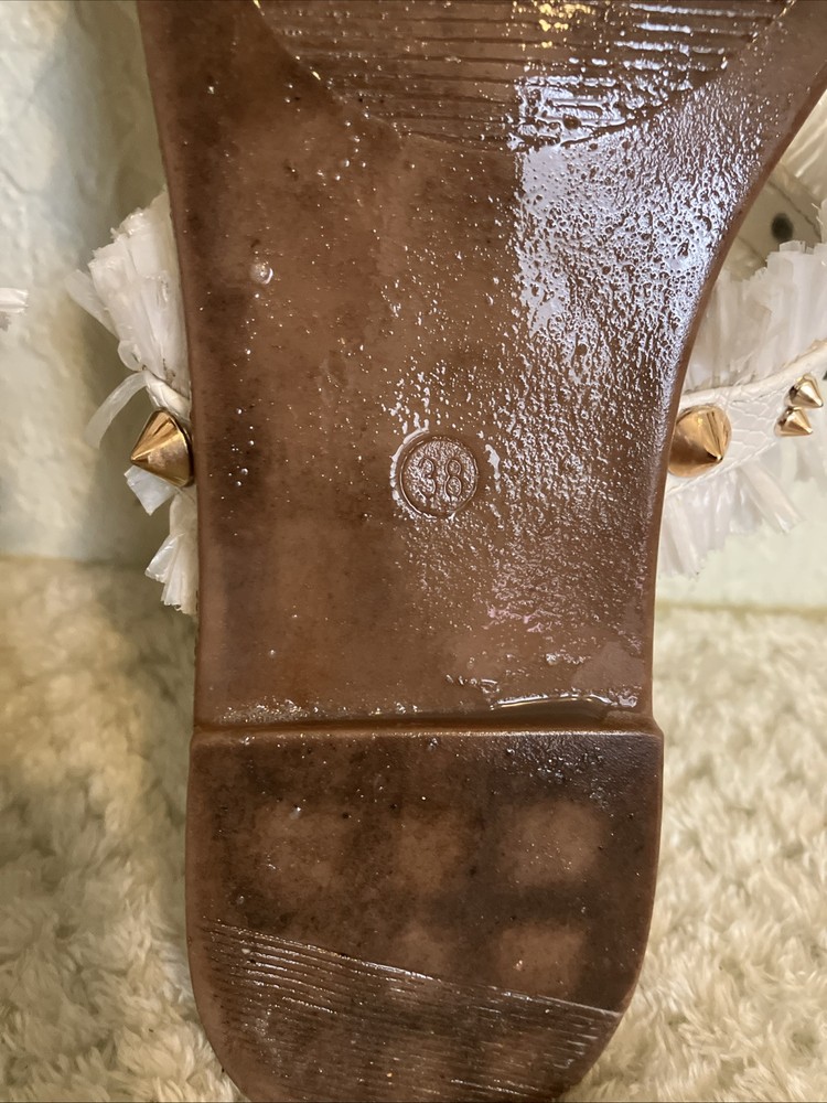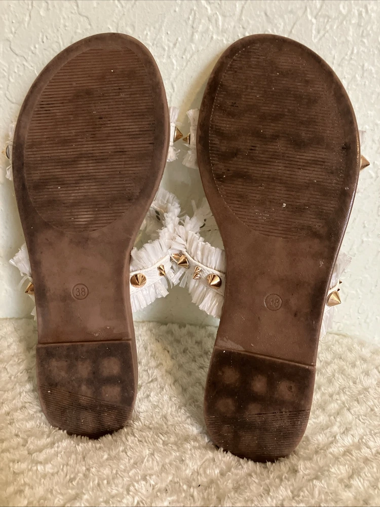 Type: Sandal Closure: Slip On Features: Spikes US Shoe Size: 7.5 Brand: Camel Threads EU Shoe Size: 38 Style: Slide Theme: Metal Department: Women Color: Pearl Upper Material: other Character: Spike Heel Height: Low (1-1.9 in) Size Type: Regular Heel Style: Flat Model: Blair Accents: Fringe