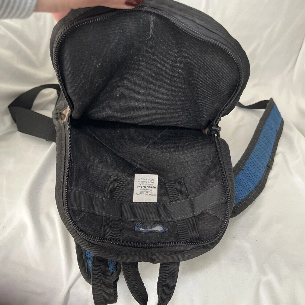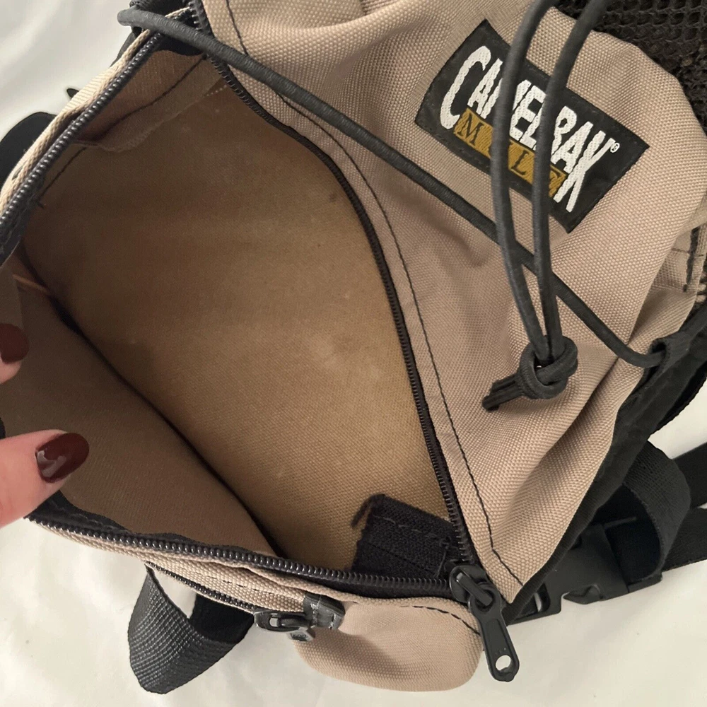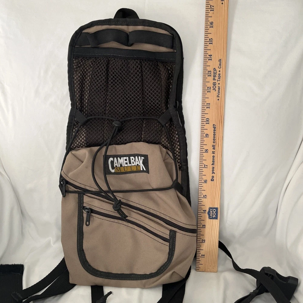 The CamelBak MULE Hydration Backpack is designed for hiking and backpacking, suitable for both men and women. It features a 100 oz. hydration pack in a military tan color, although the bladder is not included. The backpack has a zip closure and comes in black, beige, and blue colors. It offers padded straps, adjustable sizing, and external pockets for added convenience during outdoor activities. This CamelBak backpack is a practical and comfortable choice for staying hydrated on the go. Great, preowned condition. Some wear, but plenty of life left.
