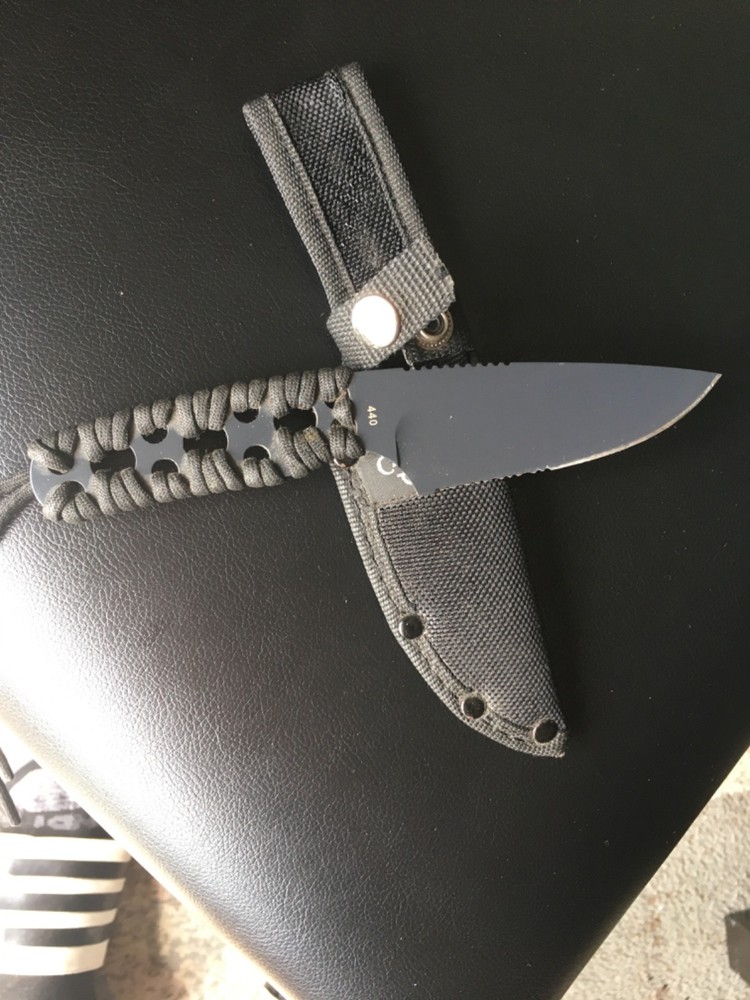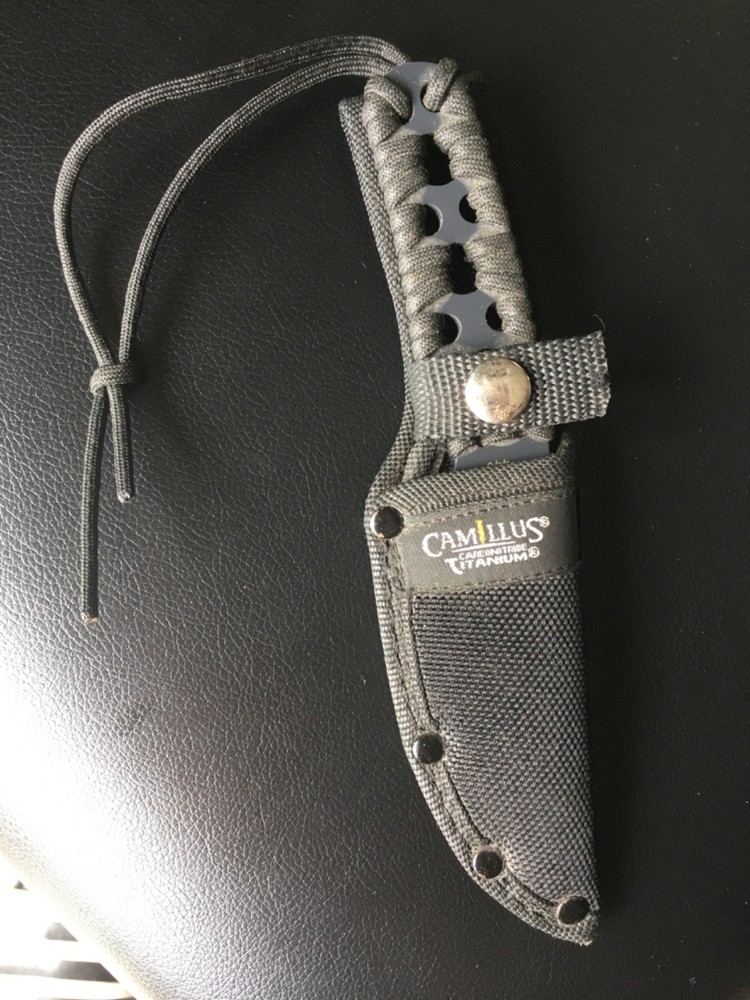 Camille’s fixed blade knife paracord wrap handle 440 steel blade serrated nylon sheath. Like new