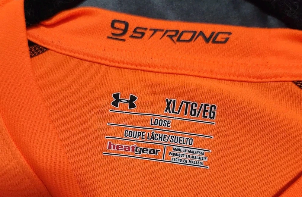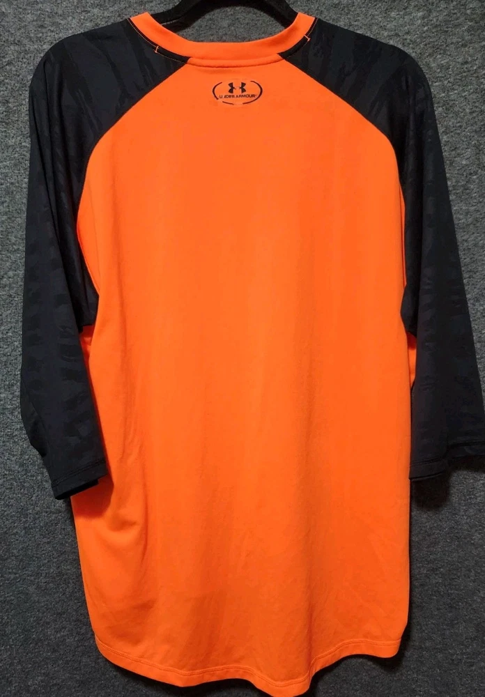 This men's Under Armour shirt is a size XL in orange color, designed with a 3/4 length sleeve style. It is a casual jersey featuring breathable fabric, ideal for activities like gym training, walking, baseball, cross-training, CrossFit, and running. The shirt is part of the Under Armour Baseball product line, making it a reliable choice for athletic wear.