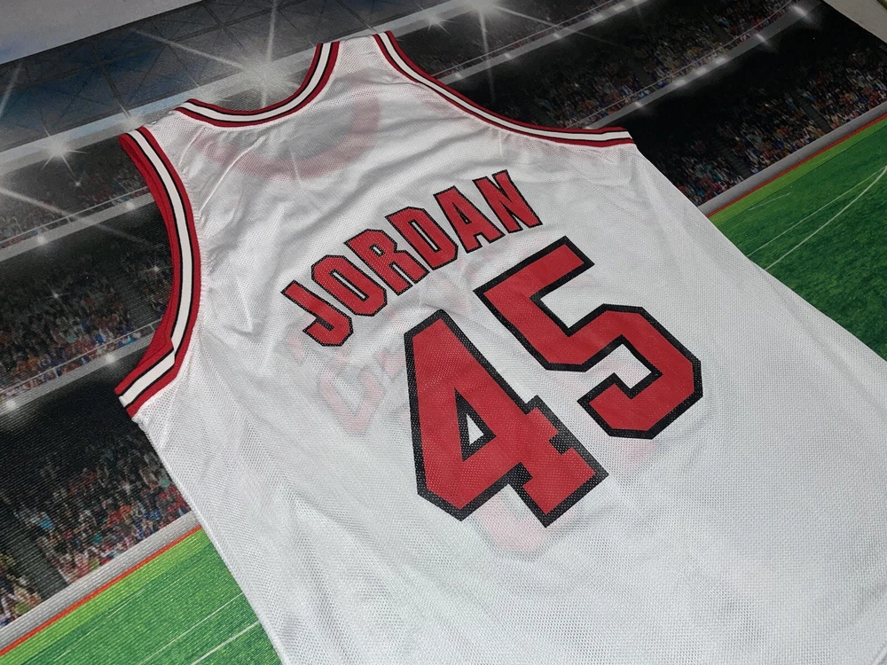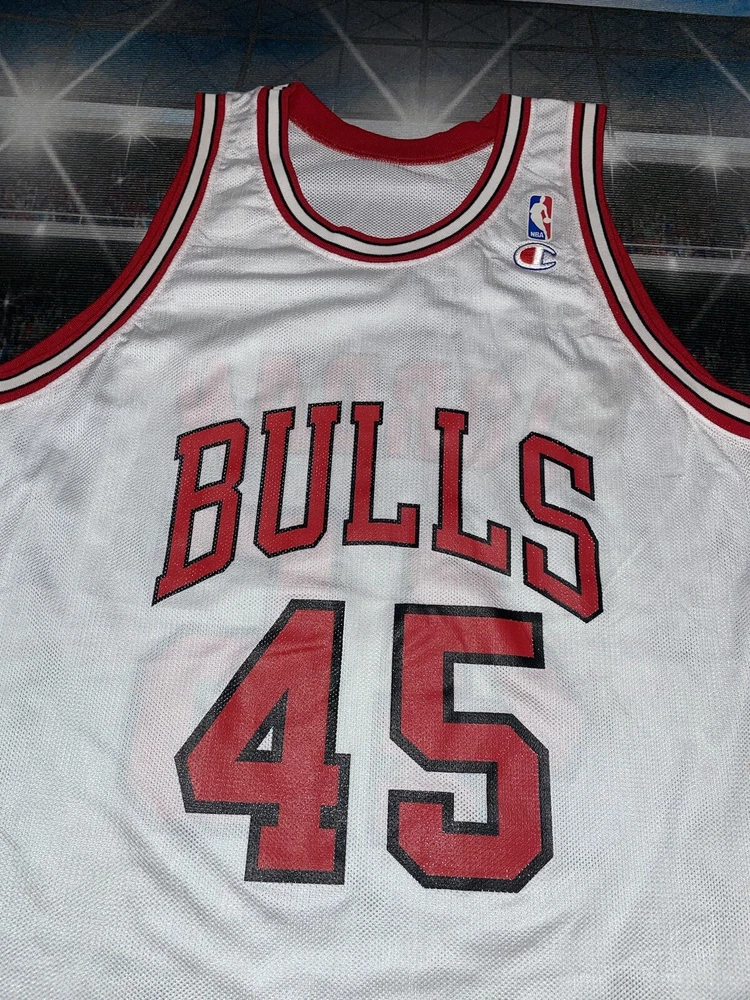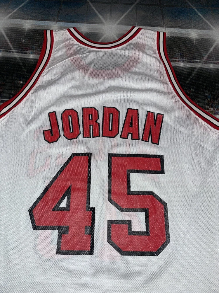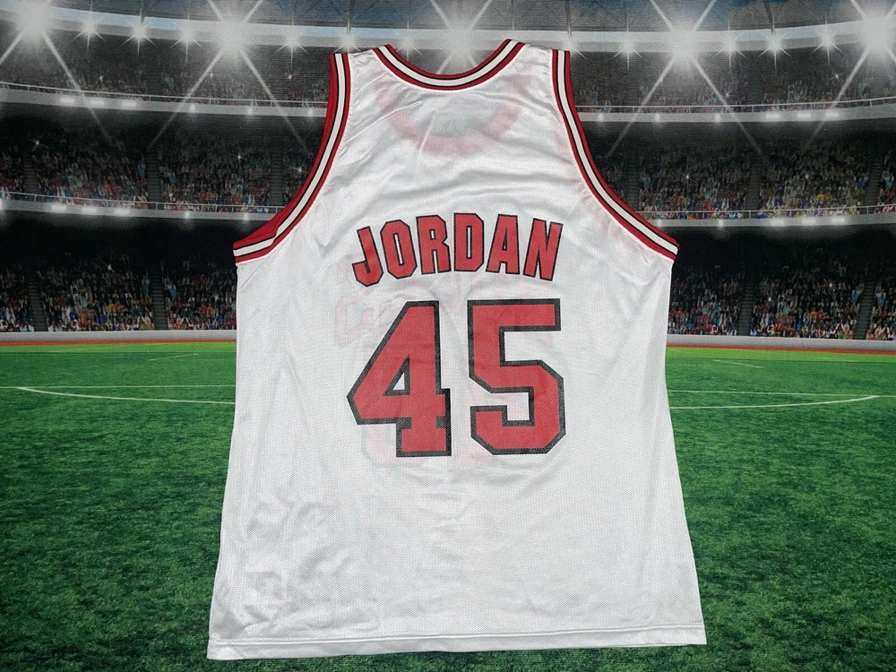 Nice and clean The product is a vintage Champion jersey of Michael Jordan from his time playing for the Chicago Bulls, specifically featuring the number 45. This basketball jersey is white in color and comes in a size 48. It is an authentic NBA item, made in the United States, and is a coveted piece for fans and collectors alike. The jersey represents a piece of basketball history, as it is associated with one of the greatest players in the sport and a legendary team in the NBA.