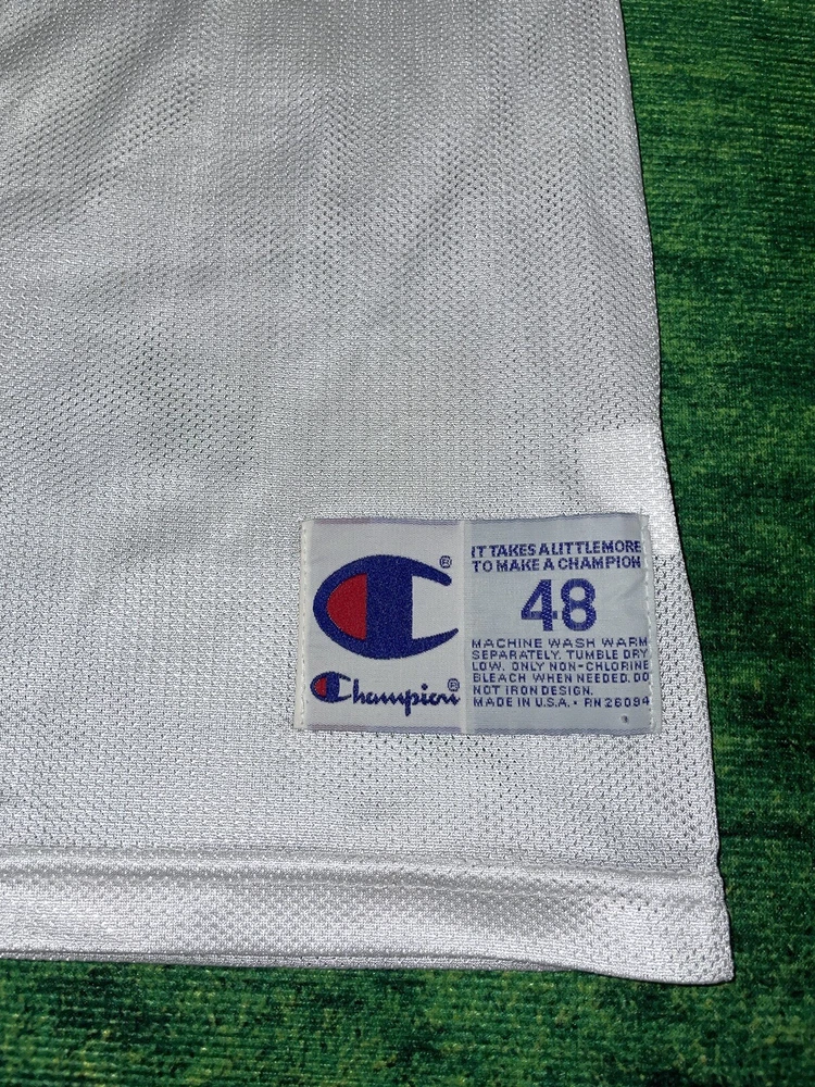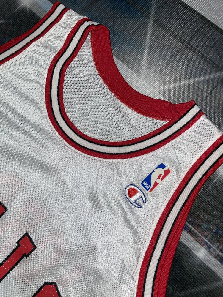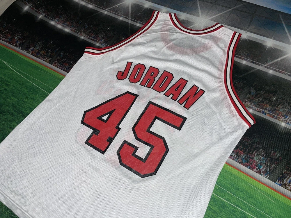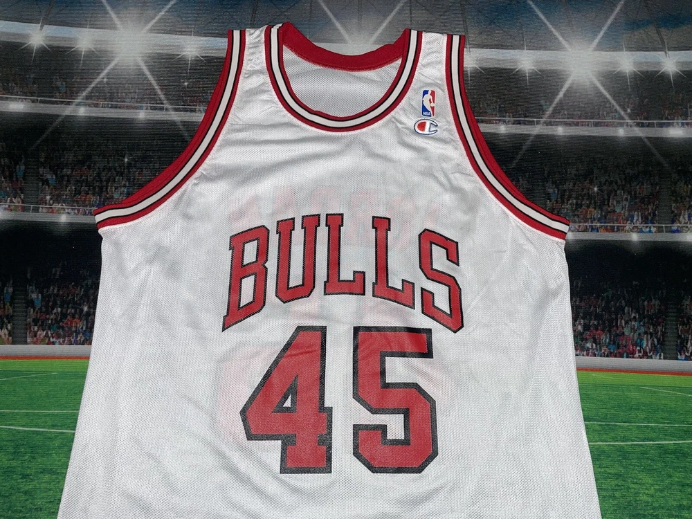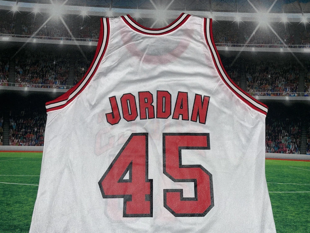 Nice and clean The product is a vintage Champion jersey of Michael Jordan from his time playing for the Chicago Bulls, specifically featuring the number 45. This basketball jersey is white in color and comes in a size 48. It is an authentic NBA item, made in the United States, and is a coveted piece for fans and collectors alike. The jersey represents a piece of basketball history, as it is associated with one of the greatest players in the sport and a legendary team in the NBA.