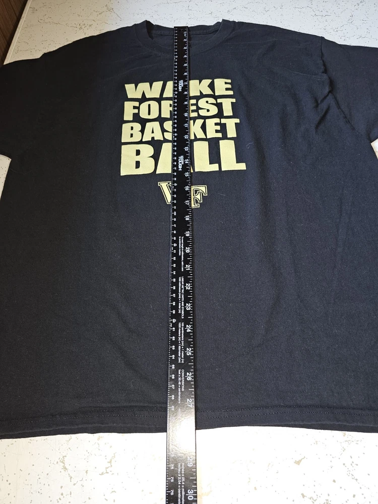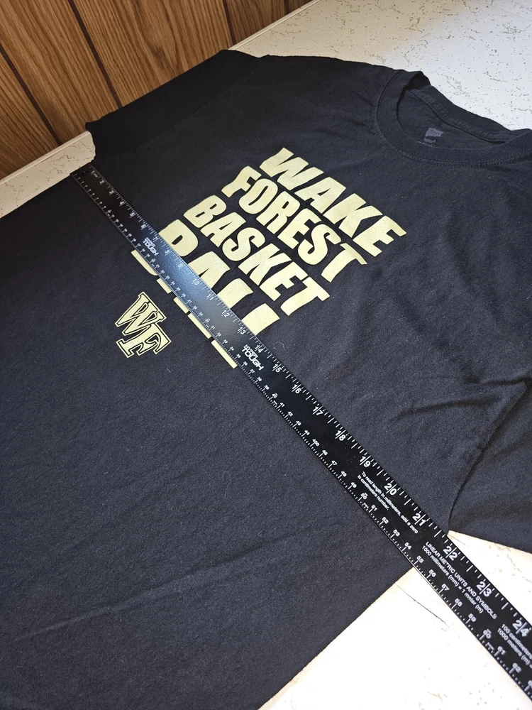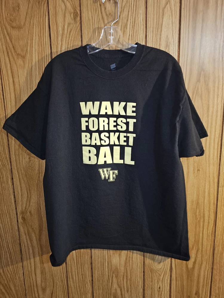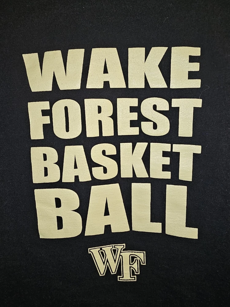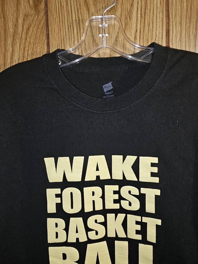 Show your support for the Wake Forest Demon Deacons with this black graphic logo t-shirt. This older style XL men's shirt is perfect for basketball fans who want to represent their team during the regular season. Made by Hanes and officially licensed, this t-shirt is a must-have for any Wake Forest fan. The shirt is made in the Dominican Republic and features the team's logo on the front. Wear it to games or as part of your everyday wardrobe to show your team spirit.