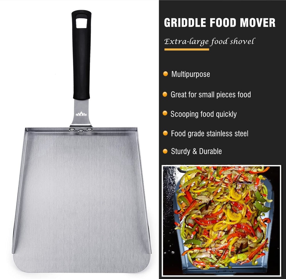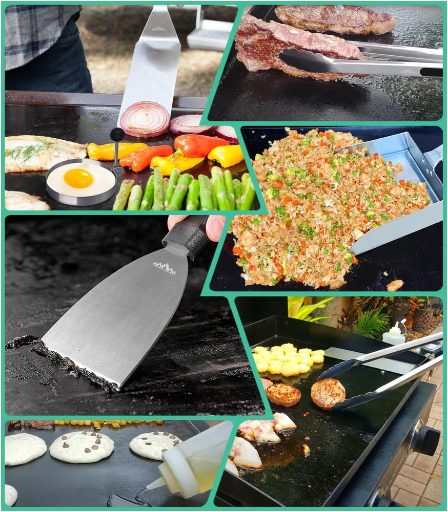 Featured Cooking Accessories Set- Contains 2 spatulas, 1 wide scooper, 1 tong, 1 meat fork, 1 straight shank scraper, 2 16 oz squeeze bottles, and 2 egg ring Multipurpose Cooking Utensil Set - Great for indoor outdoor cooking on flat top griddle, skillet, hibachi and teppanyaki Unique Accessory Combination for Flat top griddle- 2 Oversized spatulas, great for flipping beef cubes, burgers, pancakes, vegetables, and all other barbecue applications, 1 extra-large stainless steel wide shovel for scooping large quantities of food, 1 BBQ meat fork, 1 food tong, 1 straight shank scraper keeps your hands off the hot cooking surface, making it safer to clean the cooking surface, 2 16 oz squeeze bottle and 2 egg ring Premium Stainless Steel- Excellent durability for commercial applications, made of stronger & thicker stainless steel, maintenance free Easy to Clean & Dishwasher Safe- After all the cooking is done, you can prevent rust by simply washing the surface of food debris and juices with soapy water, or simply put them in the dishwasher. No other additional maintenance measures are required Great Gift Choice - Ideal griddle gift choice for Fathers Day, Thanksgiving or Christmas. Desirable gift for barbecue and camping enthusiast