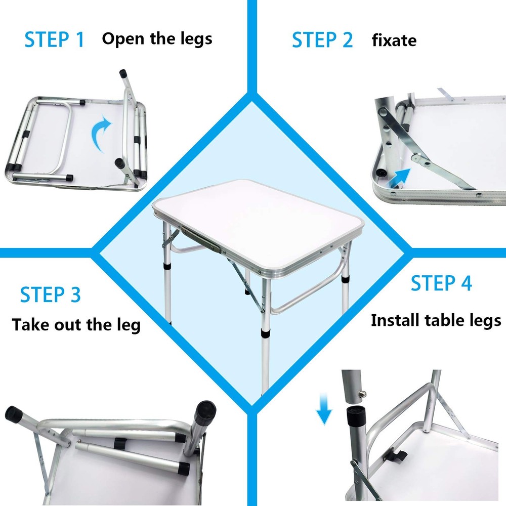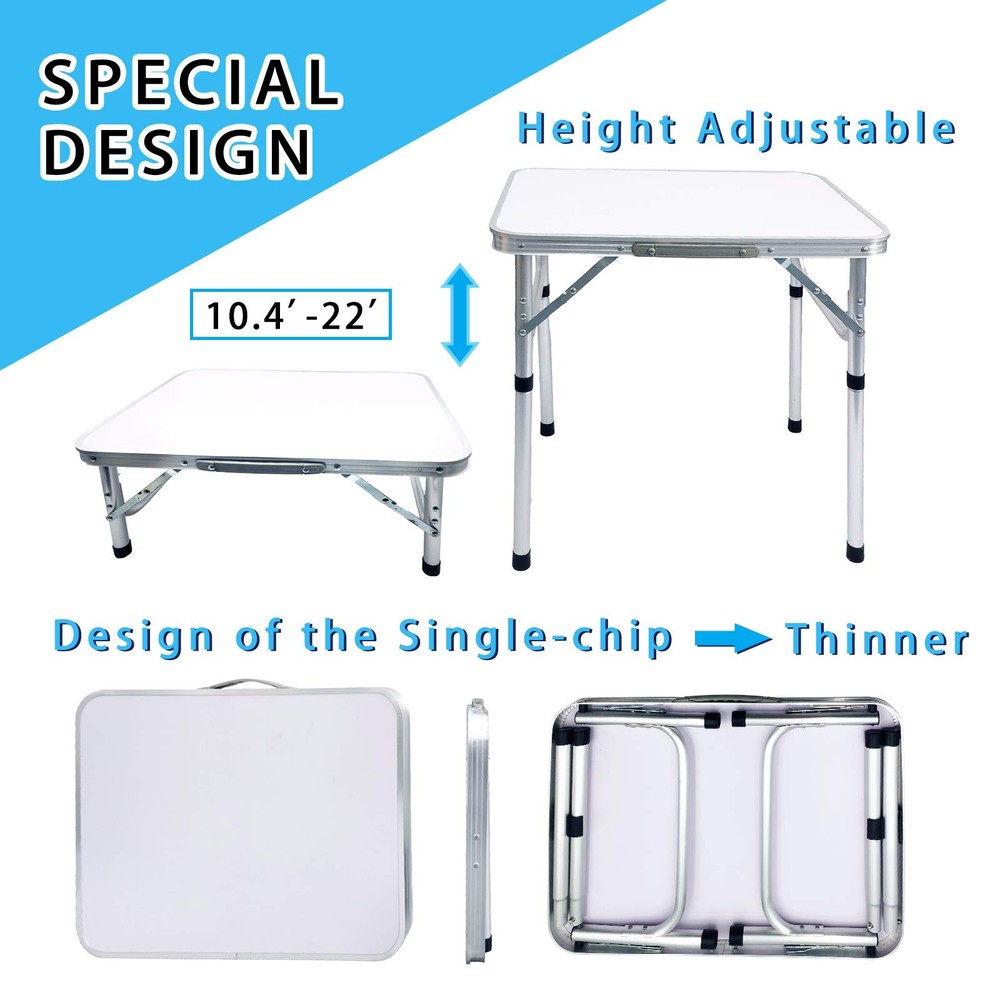 Aluminum Folding Small Table, Adjustable Height Lightweight Portable Camping Table for Picnic Beach Outdoor Indoor Easy to use :No Assembly Required, set up and fold in seconds. Two adjustable height : High height-21.6’’, Low height-10.6’’ Setup dimension:23.6''x17.7’’x21.6’’ /10.6''. Folded dimension:23.6''x1.3''x17.7''. This camping table is made of medium density fiberboard and upgrade aluminum alloy. which is stain-resistant, heavy-duty & lightweight, sturdy & durable. Versatile and practical: Whether you need a place to cook, eat, or play games, this foldable camping table is a must-have accessory for any outdoor adventure. Its compact size and lightweight construction make it easy to bring along wherever you go. Multiple Uses: Use this camp table as a picnic table, or to hold your lantern and other camping gear. It's suitable for all your outdoor activities.