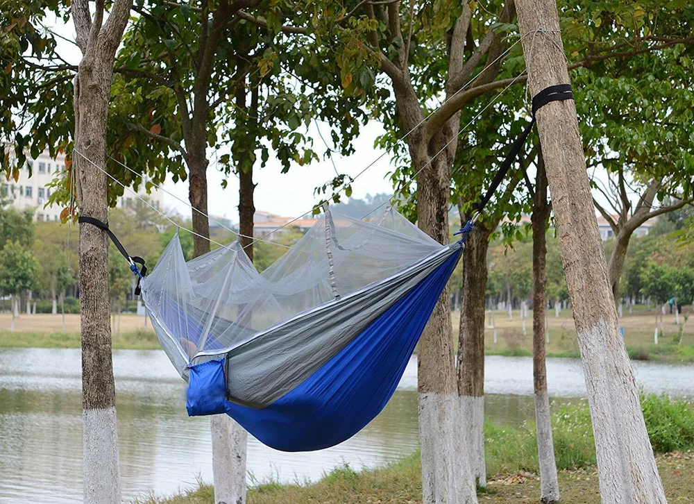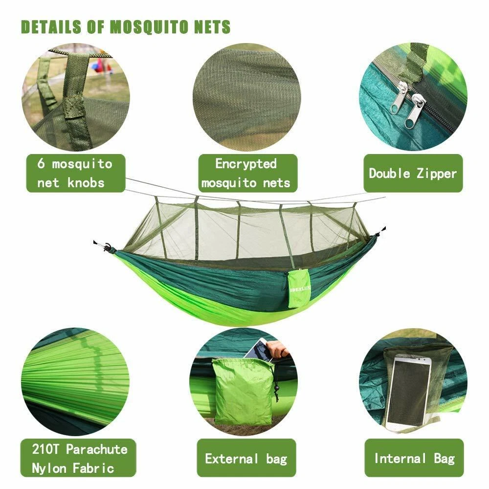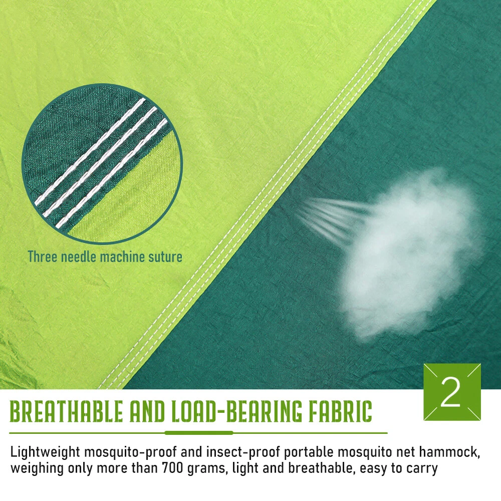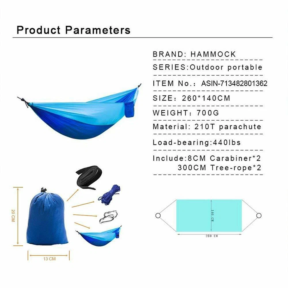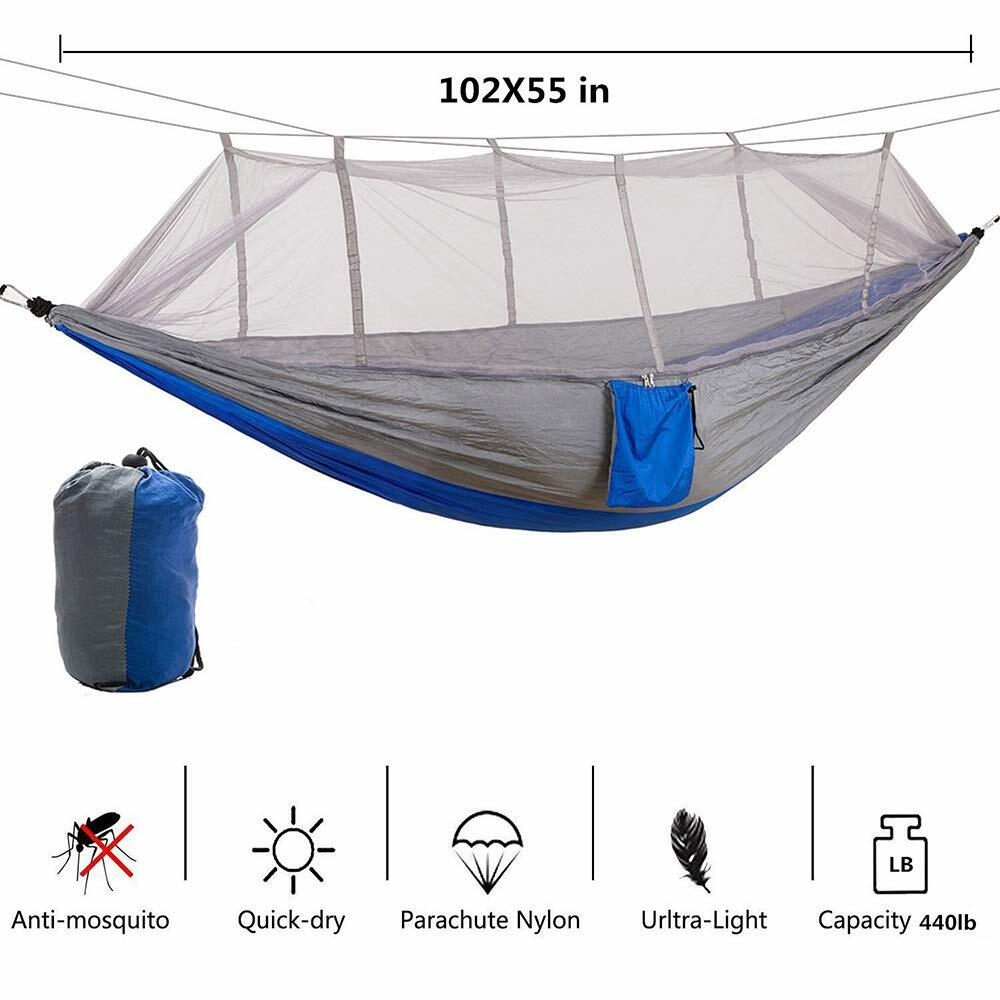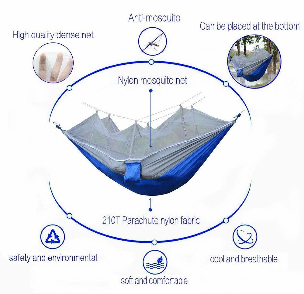 Mosquito Net Nylon Tent Features : *Soft and Comfortable -- Soft and silky tactility, lightweight and appropriate size, it's softer & stronger than most other hammocks.Great for sports and outdoors. *Perfect Mosquito Prevention -- Mosquito nets protect you from mosquito almost all the time. When you are asleep, mosquitoes have few chance to feed themselves, but imagine if the hammock without mosquito net, you will be drastically snapped, so please pay caution to keep the poisonous insects far away from you in the wild! *Large Size - Packs Down Small -- So you can take it everywhere. Check out our double KEPEAK (2 persons) hammock, which is 8.5 feets long and 4.6 feet wide, weighs only 25ounces.Perfect For Camping, Hiking, Backpacking, Travel, Emergency Survival And Any Adventures! Takes A Few Minutes To Setup And Packs Away Into A Conveniently Small Integrated Stuff Sack For Anyone On The Go. *Lightweight and Compact -- Professional Strong & Lightweight Breathable Woven 210T Nylon.,Triple-Stitching, And A Quality Pattern That Provides Reliable Support Reducing Pressure Points So You Stay Comfortable For A Great Night’S Slee *Redused to be a Mosquito Meal -- Needle-like meshes and easily-close zippers, mosquito net can keep the bugs out and let you sleep in comfort. Extra mosquito net is not required. Installation Instructions: 1.Find two stable trees or columns. 2.Connect the rope with the tree or column. 3.Pass the nylon rope through the designed hole on the top of the mosquito net and tie the nylon rope to the branch or column. 4.The distance between the rope and the ground is suggested to more than 5 feets. 5.Connect the hammock with the rope. 6.Hammock to be chair height (12-18 inches) from the ground. Specifications: Size : 260*140cm/102.4*55.1 inch Material: 210T parachute nylon material Item Weight: 640g /1.4lb Package List: 1 * Hammock 2 * Nylon Rope 2 * Tree straps 2 * Carabiners Note: This hammock has a maximum load of 440 pounds. Do not exceed this limit. Please choose a safe place to install the hammock. For example, between two trees that are strong enough. Avoid scratching hammocks with sharp objects, which can easily tear cloth and cause you to fall.