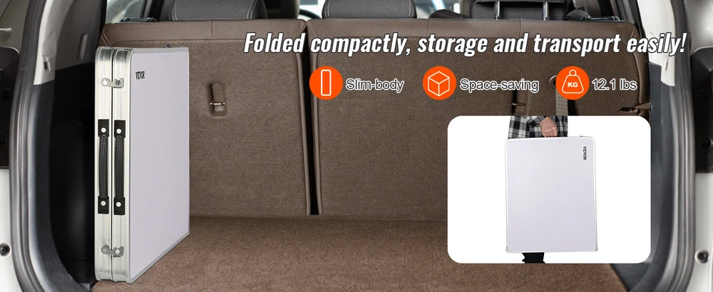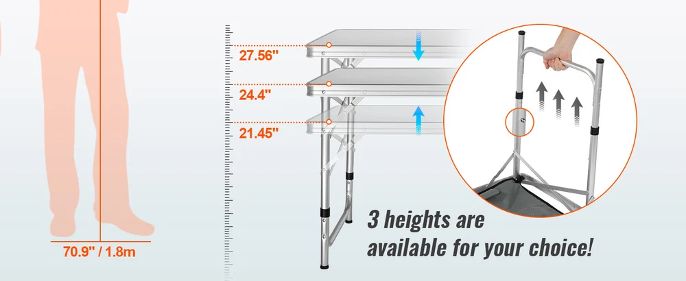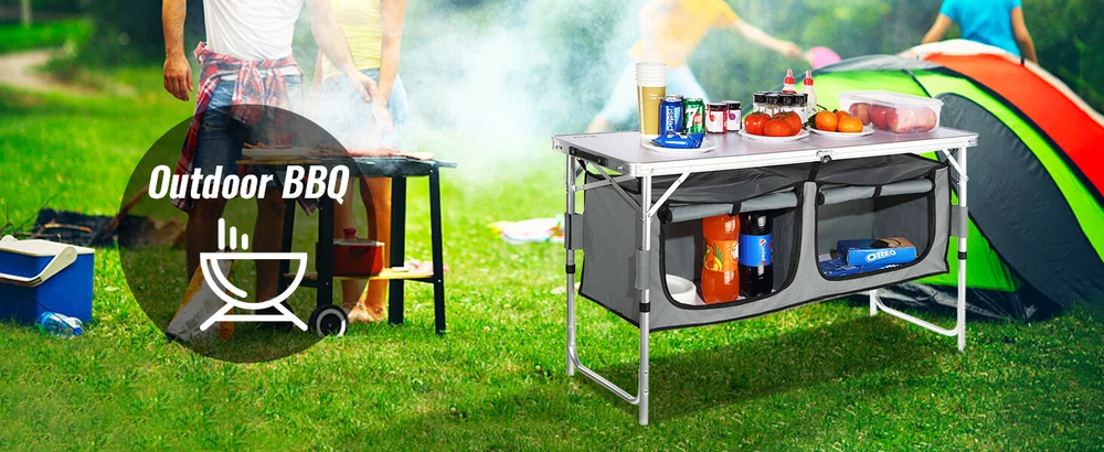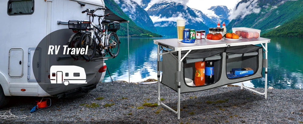 Features & Details Setup in Seconds: You can easily unfold and pack the portable cook station up, and it can be taken apart in less than several minutes without any tools. The slim-fold table is only 2.8 inches (7 cm) thick, so it won't take up too much space. Great Space Management: Our camping kitchen table is designed to take your kitchen outside! You can organize your food, stoves, grills, and cookware in an orderly manner on the tabletop, and zippered storage compartments. Marvel at its Quality: Our camping cooking table is built to last thanks to its powder-coated aluminum tubes and a high-quality MDF countertop. Its durability is further enhanced by the four iron side tables that can withstand prolonged use. And cleaning up is a breeze. 3 Levels Adjustable Heights: The camp kitchen features an adjustable height of 21.45", 24.4", and 27.56". Three-height settings suit no matter for adults or children. It is designed with a reinforced X-shaped structure, which provides better stability and security during operation. Ready for Any Adventure: Whether you're RV traveling, camping, picnicking, hosting a backyard BBQ, or just enjoying a night under the stars, our camping table is the ideal solution for all your outdoor needs. It provides a sturdy surface for placing and storing items while enhancing your overall outdoor experience.
