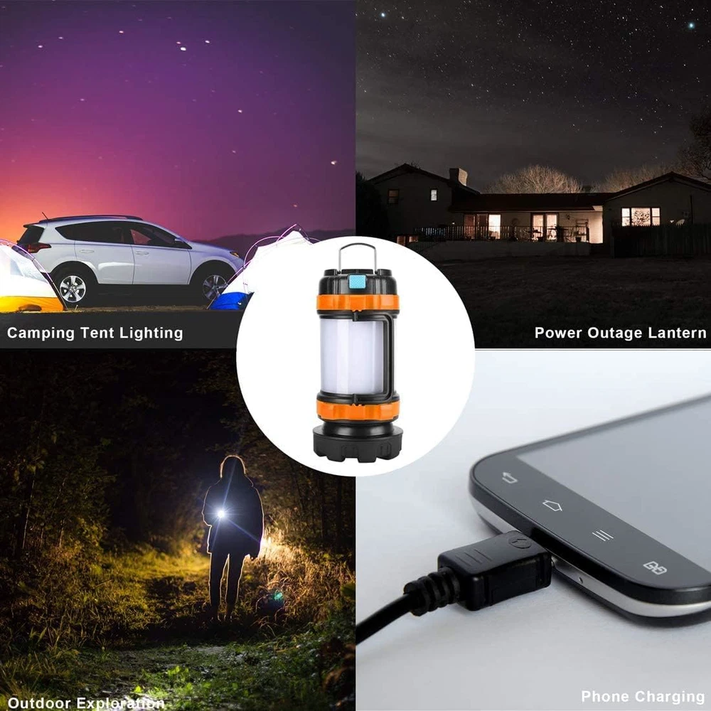 RECHARGEABLE AND 4000 Capacity POWER BANK: Camping flashlight rechargeable with 4000 capacity lantern flashlights rechargeable can be used as a power bank to charge Android, ios and other smart devices. There is no need to worry about missing important calls and information during the trip with camping flashlight lantern DESIGN AND MULTI-FUNCTION 6 IN 1 : Camping lantern has 6 differents modes: Low/high modes flashlight & lantern and two red light modes (steady and strobe red light), the 360 ?? super-light lantern flashlight. It is 800 lm rechargeable flashlight, can bring you enough brightness to prepare for darkness, power outage,hurricane and emergency situation PORTABLE AND HANGING: LED camping lights has a handle and two-way hook, which can be held on foot trip or conveniently hang on a tree branch, roof of a car or top on the tent for lighting, also be hung high for help in case of emergency. Maximum lumen 800 lm and max distance 350 m is bright enough to be easily found around to get help WATERPROOF AND DROP-RESISTANT: Lantern camping rechargeable IPX4 waterproof can withstand splashing rainwater in all directions, it can also hang outside and inside of tents to extend illumination dimension or scare wild animals out when you are camping, hiking, night riding and exploring etc CUSTOMER SERVICE: We promise to provide 24 hours per day customer service. If you have any questions, please contact us. Note: a usb C to usb C cable won't recognize the alpswolf device. You will need to use a usb A to usb C cable to charge the lantern