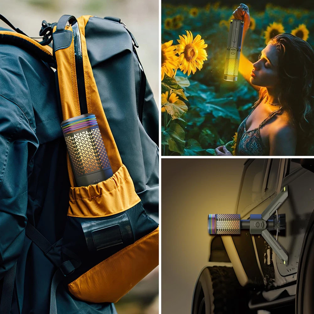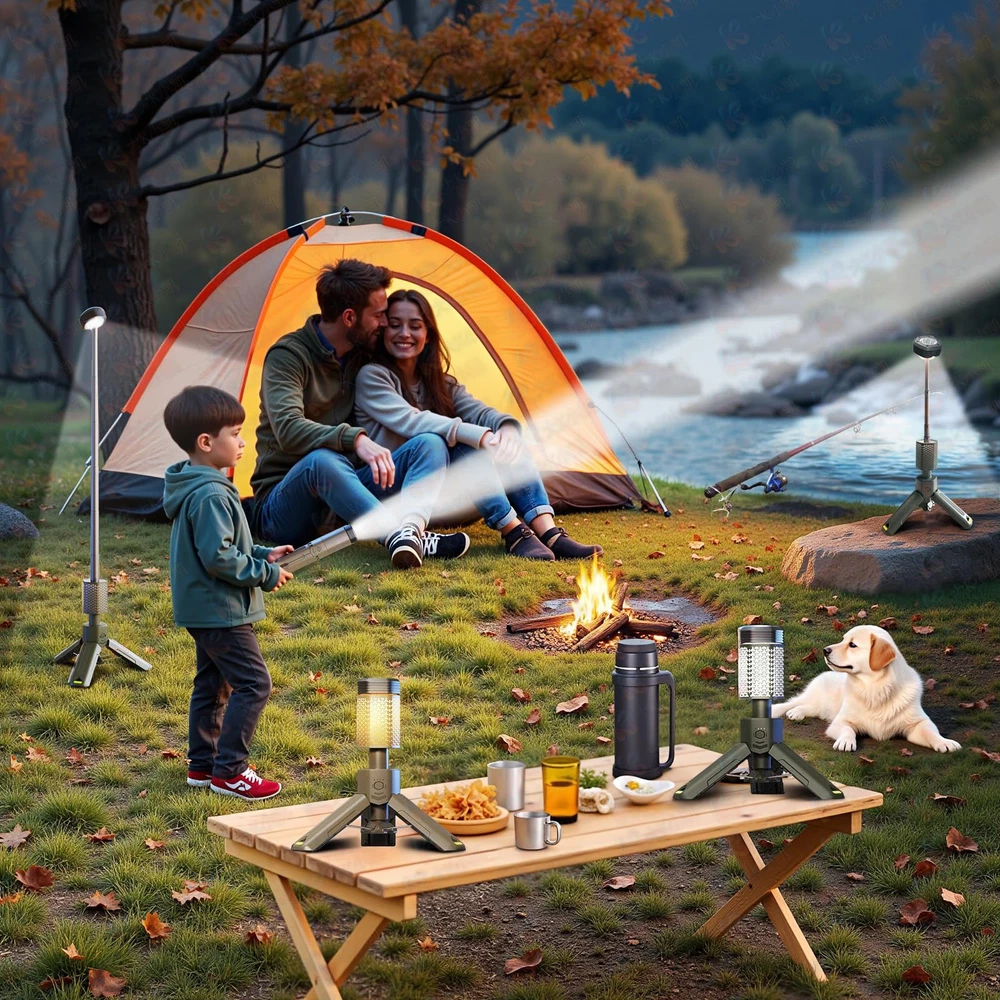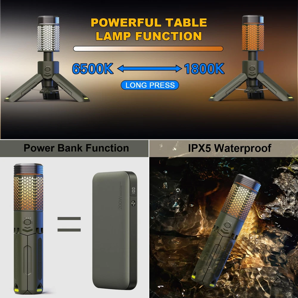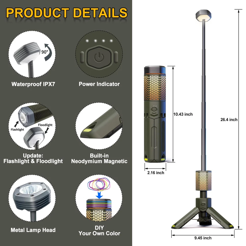 MULTI-FUNCTIONAL: Four-in-one lighting function design, one-click control of various functions, can be used as camping lights, ambience lights, flashlights, SOS warning lights. Three levels of brightness can be adjusted steplessly, the color temperature also can be adjusted steplessly between 1800K-6500K, in addition, the long-distance direct flashlight mode and SOS warning lamp mode can be switched at will NEW DESIGNED LAMP SHADE: With a large Angle lighting design and a lighting Angle is up to 240°, this camping lantern has a much larger lighting range than its competitors, bringing you more safety and convenience. This telescoping camping light features a retractable pole and foldable tripod base, which you can freely adjust as needed. Meanwhile, it uses a regular hexagonal cross-section design, placed on the slope of the ground will not cause trouble due to rolling EMERGENCY POWER BANK: This camping light has a built-in 10500mAh large-capacity rechargeable battery, which can ensure enough lighting time, so that you don't have to worry about the problem of insufficient power in the outdoors. At the same time, this telescopic camping light comes with a Type-C charging port, which can be used as a charging bank to charge your phone, tablet or wireless headphones in an emergency ALL-WEATHER USE: This camping light is designed with a high grade of water resistance and has passed stringent water resistance tests. The waterproof level of the lamp head reaches IPX7, and the waterproof level of the lamp body part reaches IPX5. It works well even in extreme weather environments such as heavy rain and snow. The complimentary ground pin can secure the tripod to the ground and can ensure that the camping lamp will not be blown over by strong winds. Also included are premium waterproof storage bags tailored for camping lights. Escort your wonderful hiking, camping, outdoor adventures and more RAINBOW RUBBER BAND FOR DIY: The complimentary rainbow rubber ring can be used for the personalized decoration of the lamp holder, you can choose your favorite color and style to hand put on the lamp holder (DIY), so that you can get a more distinctive camping lamp EXCELLENT AFTER-SALES SERVICE: We provide 1 year quality guarantee and 7 days 12 hours online customer service for this camping lamp, if you have any questions about the product, please leave a message on our page and we will reply you and give a solution within 12 hours