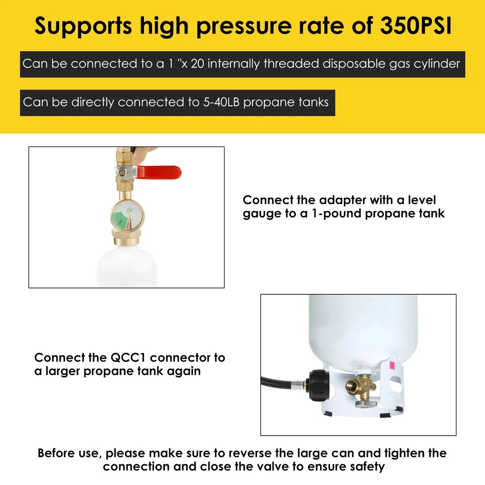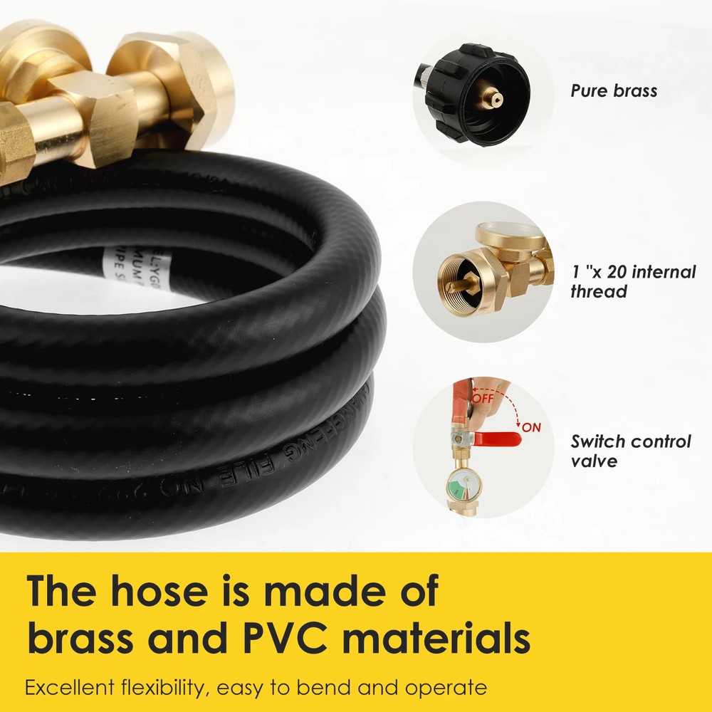 Copper and PVC Construction: The propane tank refill hose is crafted from copper and heat resistant PVC, it offers excellent flexibility for easy bending and handling during use. Convenient Installation: The propane refill hose easily connect to a 1 lb propane tank, attach the QCC1 connector to a larger tank, and organize the process with the control valve. Versatile Compatibility: The propane tank hose supports up to 350 PSI and connects to 1" x 20 internal thread cylinders, suitable for refilling 1 lb camping bottles or connecting to 5 to 40 lb propane tanks. Suitable for Outdoor and Home Applications: The propane tank extension hose is suitable for portable grills, camping stoves, tabletop grills, and heating equipment, making it an essential for camping, picnics, heating, or outdoor cooking.