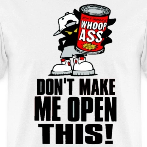 Don't make me open this! Show folks you mean business with this can of whoop ass, ready for action. Can Of Whoop Ass Men's T-Shirt by Spreadshirt™ Men's T-Shirt This is our best seller for a reason. Relaxed, tailored and ultra-comfortable, you'll love the way you look in this durable, reliable classic. - Brand: Fruit of the Loom | Product ID: 3930 - 100% pre-shrunk cotton that is USA grown and sustainably sourced. (heather gray color is 90% cotton/10% polyester, light heather gray is 98% cotton/2% polyester, heather black and safety yellow are 50% cotton/50% polyester) | Fabric Weight: 5.0 oz (mid-weight) - Double-stitched seams at shoulder, sleeve, collar and waist - Tear-away label for added comfort - Imported; processed and printed in the U.S.A. - Size 3XL available for colors: white, black, navy, royal, bright green, red, light heather gray, forest green, orange, burgundy, purple, heather gray, charcoal, heather black, turquoise, denim, yellow, aquatic blue - Size 4XL available for colors: white, black, navy, royal, red, light heather gray, forest green, orange, heather gray, charcoal, heather black, denim, yellow, aquatic blue - Size 5XL and 6XL available for colors: white, black, navy, royal, red, light heather gray, forest green, heather gray, charcoal, heather black Don't make me open this! Show folks you mean business with this can of whoop ass, ready for action. Model number: S93439-A7680680 Your satisfaction is our greatest concern! If you are not completely happy with your purchase, please contact us and we will make every effort to remedy the situation. We accept returns within 30 days for a refund of the purchase price. 100% Secure Ordering Ships Within 2-3 Working Days Easy 30-Day Return Policy 100% Satisfaction Guarantee Detailed Product Type Images To make your purchase as smooth as possible, please refer to the following: Buying 1 item Click the 'Buy It Now' button at the top of this listing to immediately purchase the item and proceed with the checkout and payment process. Buying Multiple Items Click 'Add To Cart' at the top of this listing and your item will be added to your shopping cart. You may continue purchasing additional items from our fixed price listings or eBay store by clicking 'Add To Cart'. When you're done, all of your purchases will be consolidated into one checkout! Payment We accept all payment types offered through eBay. This is fast, secure and guarantees you the best customer experience possible. Quality Control We inspect all items and packages before shipping. In case you receive a damaged or incorrect item, please contact us before returning it, so we can correct the issue properly. Shipping and Delivery We charge a flat shipping rate per basket of goods, not per item. Economy shipping is free. Handling We will ship all orders within 2-3 working days of payment. Delivery Delivery may take an additional 3–8 days to arrive. Tracked shipping is available to all 50 states, P.O. Box, APO and Puerto Rico. Please see the shipping and payments tab above for details. Return Policy We accept returns within 30 days for a refund of the purchase price. Buyer is responsible for return shipping . Feedback We take our reputation very seriously. If you are unsatisfied by your order, please contact us and we will make every effort to remedy the situation.