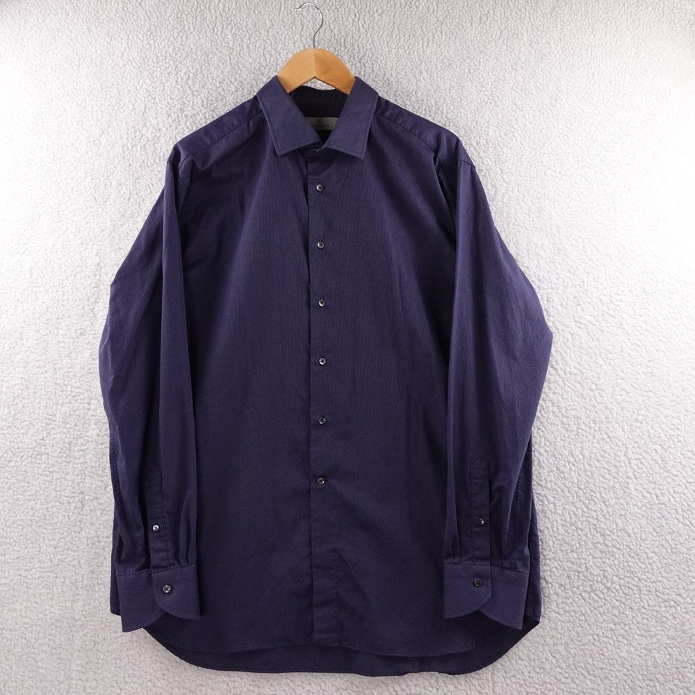 Elevate your professional wardrobe with this exquisite Canali 1934 dress shirt. Crafted in a rich navy blue, its subtle textured pattern adds a touch of sophisticated dimension. The crisp collar and precisely stitched buttons speak to the impeccable Italian tailoring, ensuring a sharp and polished appearance. Experience the luxurious feel of pure cotton designed for comfort and enduring style. Perfect for important business meetings, elegant dinners, or sophisticated evening events. Department: Men Neck Size: 18 in Fit: Slim Sleeve Length: Long Sleeve Type: Dress Shirt Pattern: Geometric Collar Style: Point Material: 100% Cotton Top Cuff Style: Barrel Cuff Features: Easy Care Neckline: Collared Closure: Button Fabric Type: Woven Accents: Button Occasion: Business, Workwear Chest Size: 46 in Keywords: Canali, dress shirt, menswear, Italian tailoring, textured fabric, formal shirt, business attire, luxury shirt, button down, smart casual, evening wear, premium cotton, tailored fit