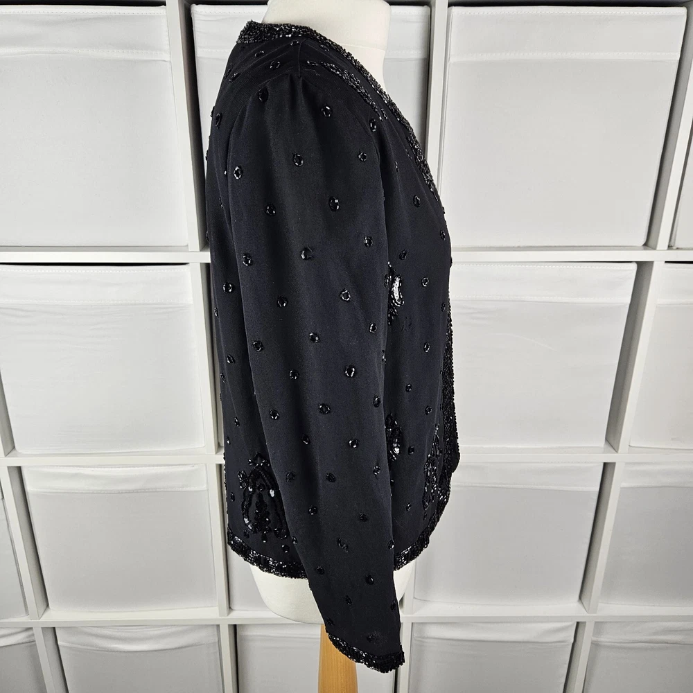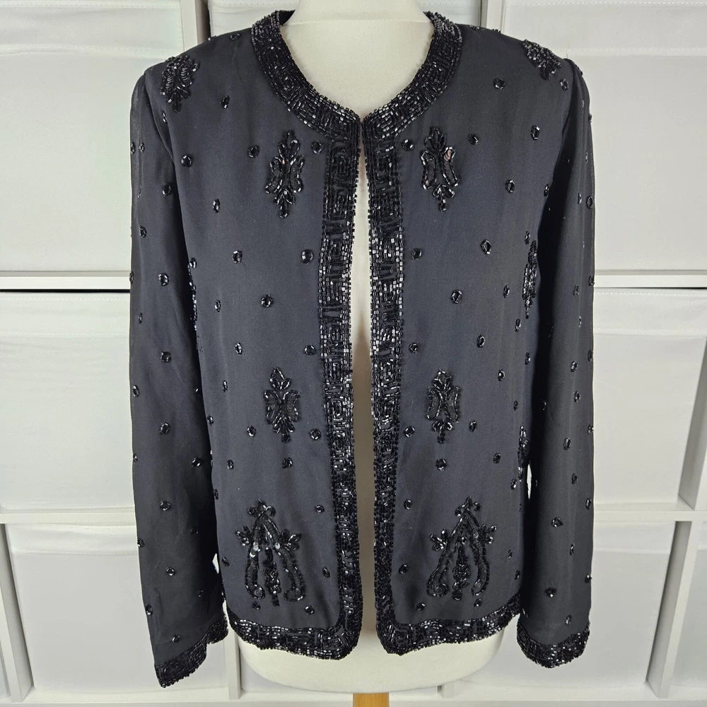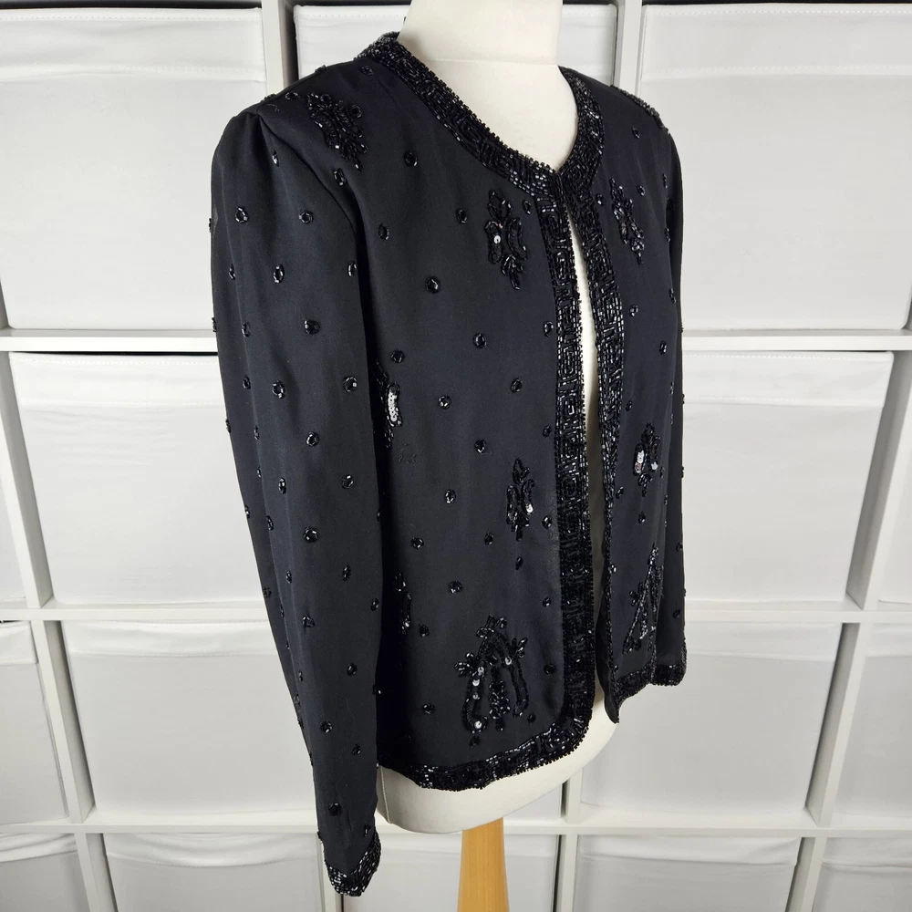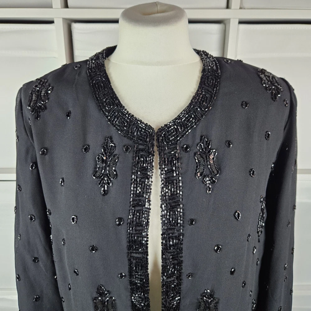 Canda black beaded formal jacket, size 12. Vintage C&A, really pretty beading detail, with a top hook and eye fastening. Long sleeves. Has shoulder pads, these could be taken out if wanted. Fully lined. Perfect special Occasion jacket. In good used condition, some missing beads as pictured. Approximate Measurements in inches: Armpit to armpit: 20 Length: 23