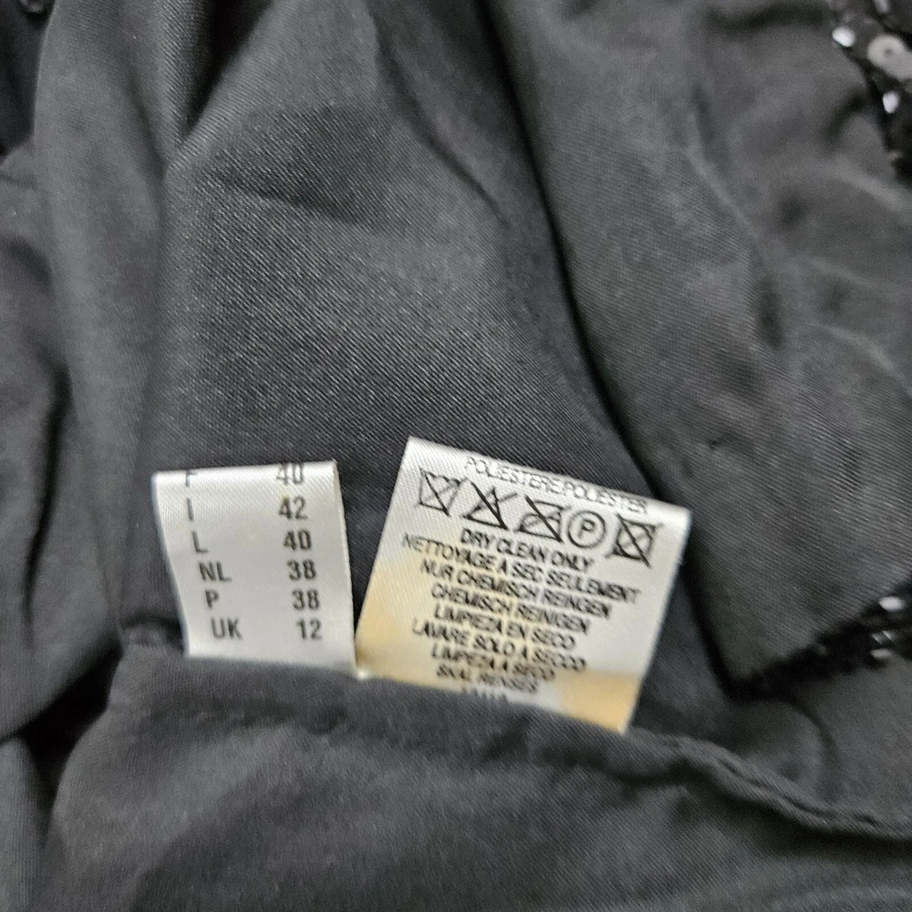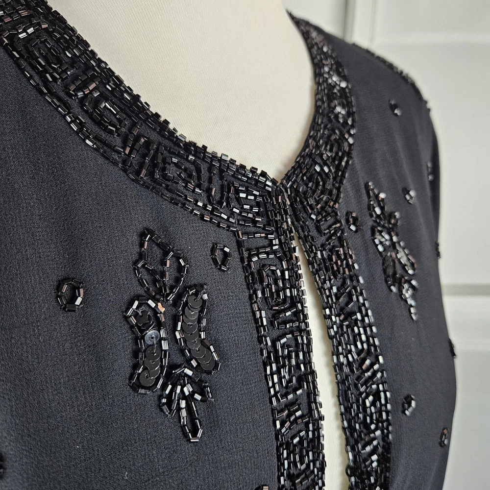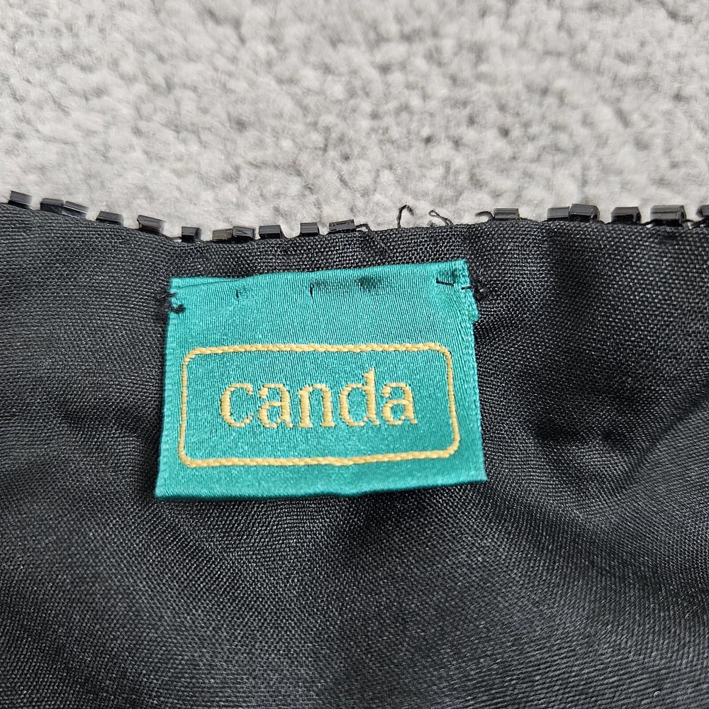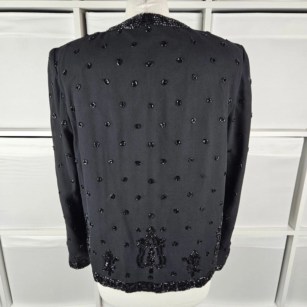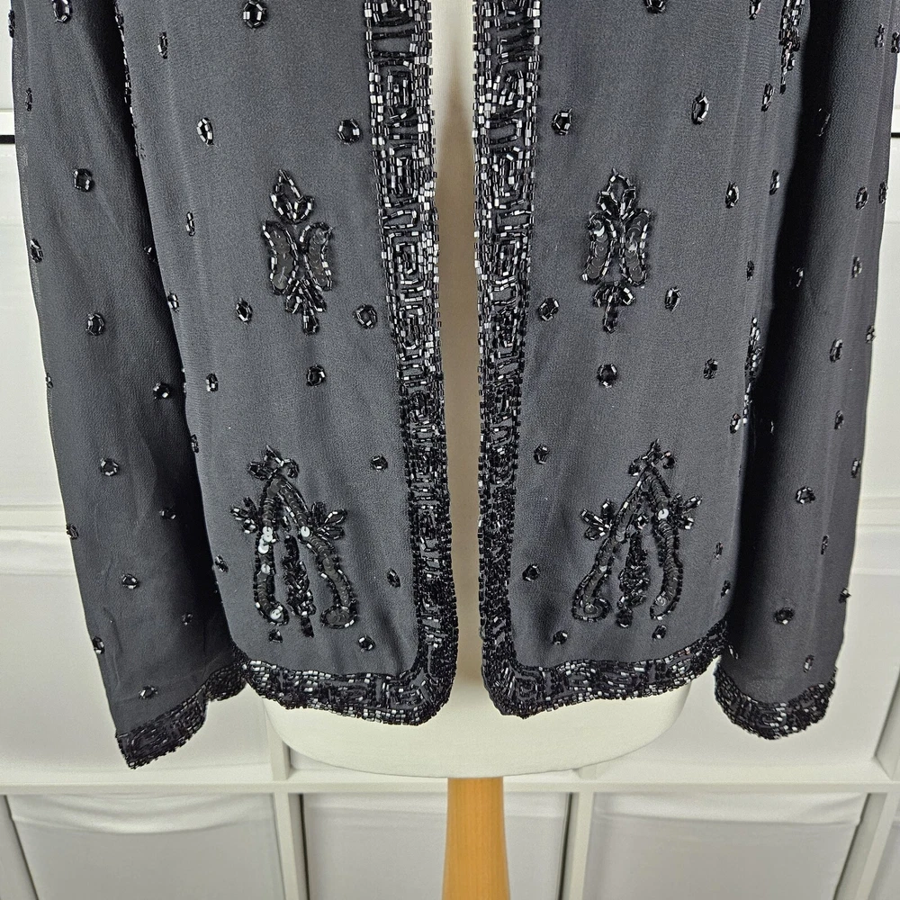 Canda black beaded formal jacket, size 12. Vintage C&A, really pretty beading detail, with a top hook and eye fastening. Long sleeves. Has shoulder pads, these could be taken out if wanted. Fully lined. Perfect special Occasion jacket. In good used condition, some missing beads as pictured. Approximate Measurements in inches: Armpit to armpit: 20 Length: 23