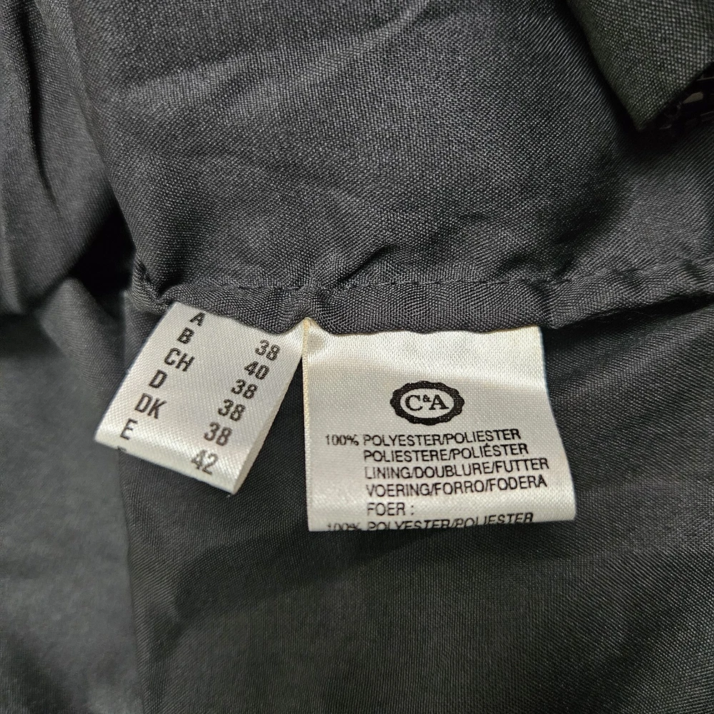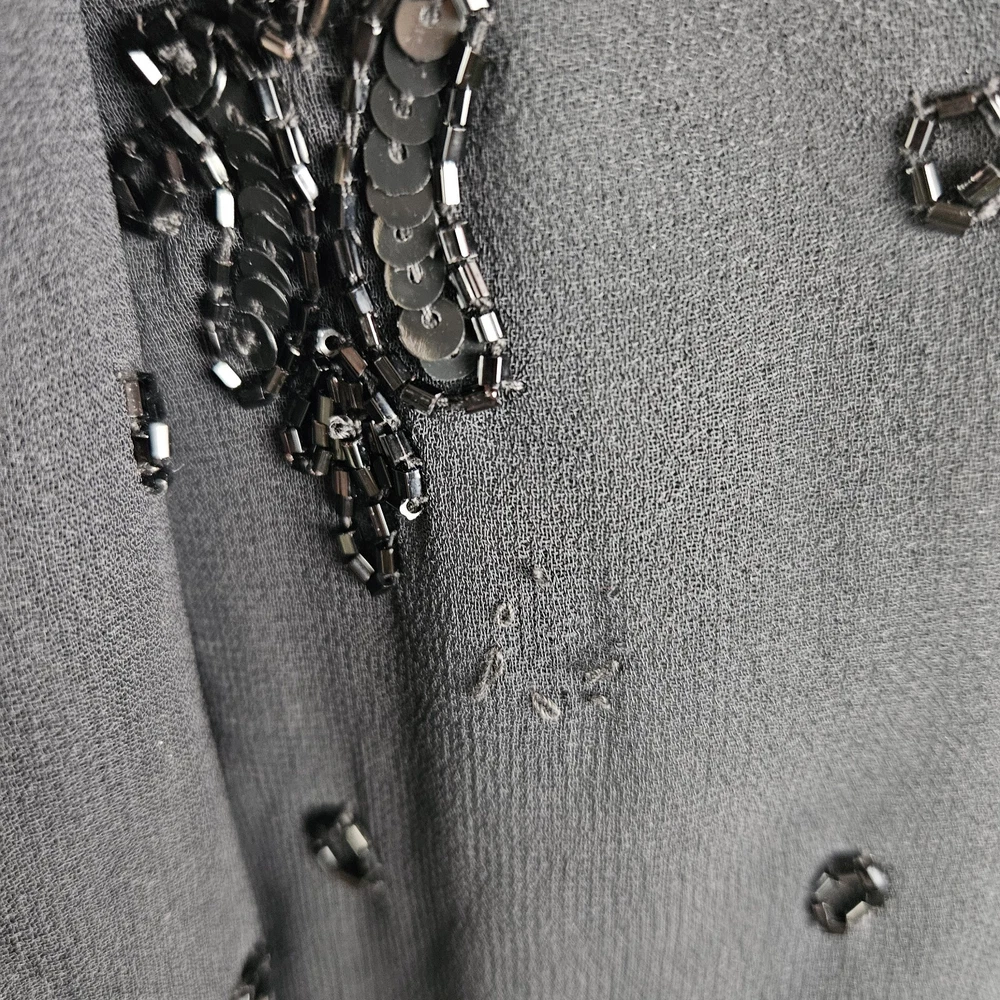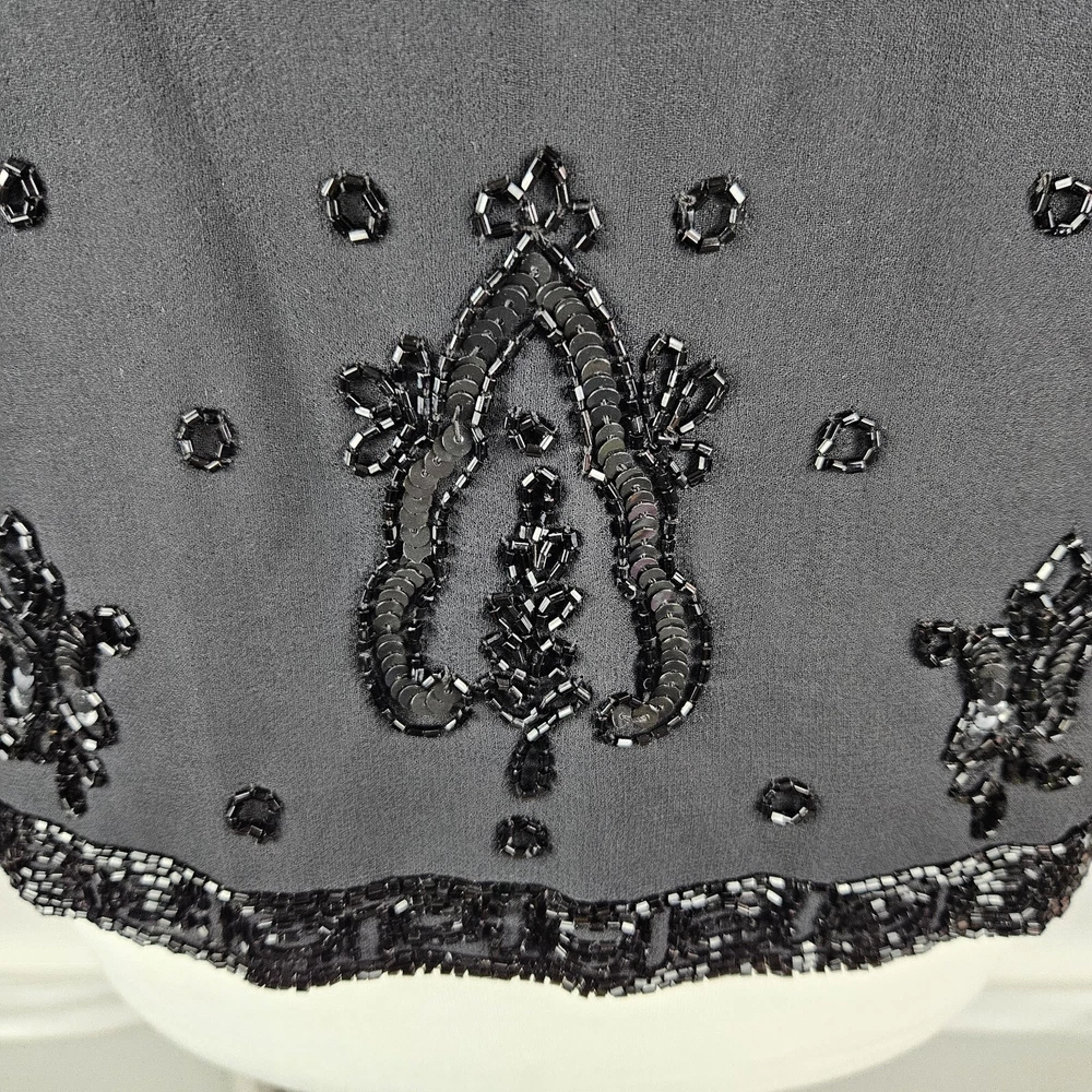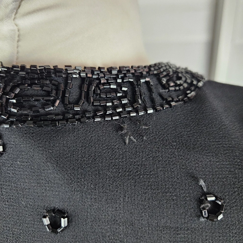 Canda black beaded formal jacket, size 12. Vintage C&A, really pretty beading detail, with a top hook and eye fastening. Long sleeves. Has shoulder pads, these could be taken out if wanted. Fully lined. Perfect special Occasion jacket. In good used condition, some missing beads as pictured. Approximate Measurements in inches: Armpit to armpit: 20 Length: 23