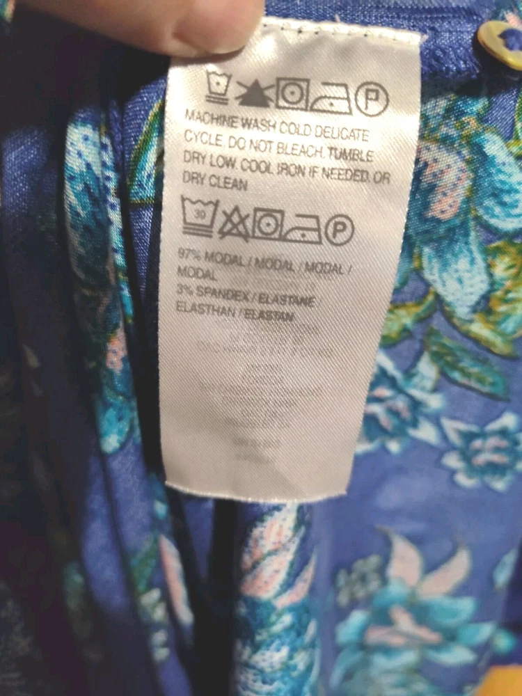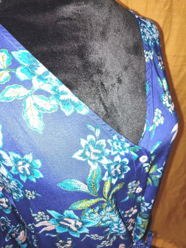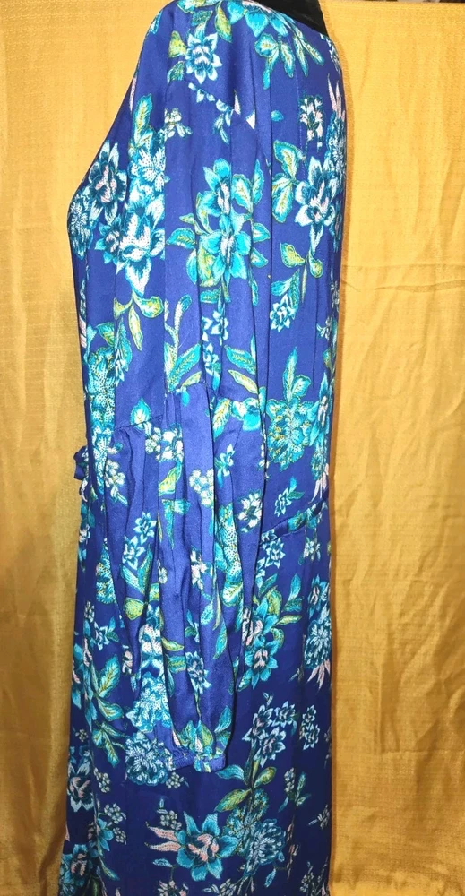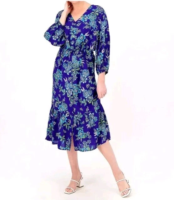 This Candace Cameron Bure dress features a beautiful floral pattern in a stunning Clematis Blue color. With a V-neckline and 3/4 balloon sleeves, this dress is perfect for any occasion, whether it's a casual day out or a wedding or travel event. The dress is made from a lightweight, comfortable knit fabric that is a blend of spandex and modal materials. The dress is an A-line style with a knee-length hemline and a button-front closure. It also includes accent buttons and a tie waist to accentuate your curves. This dress is perfect for the spring and summer seasons and is sure to turn heads with its elegant design and comfortable fit. This dress is in excellent condition. No rips, stains, tears, snags, or runs. It is beautiful, bright, and is in new without tags condition!