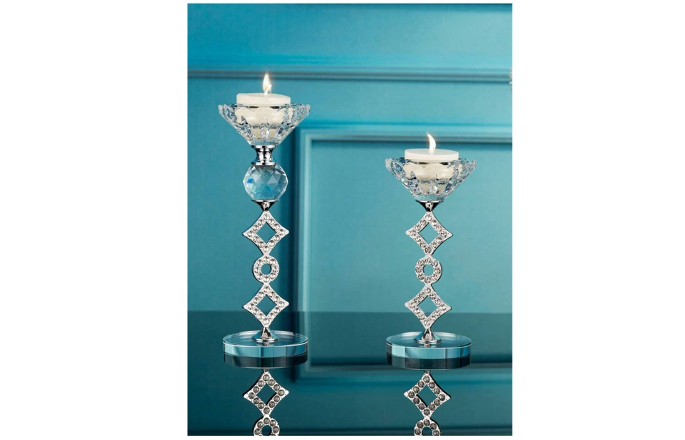 Luxurious candle holders featuring a modern asymmetrical design with sparkling crystals. Suitable for various types of candles, including pillar, tea light, taper, and 3-wick. The large silver holders add a touch of elegance to any space, perfect for creating a romantic or holiday ambiance. Crafted from crystal, these candle holders are a stylish addition to any home decor collection.