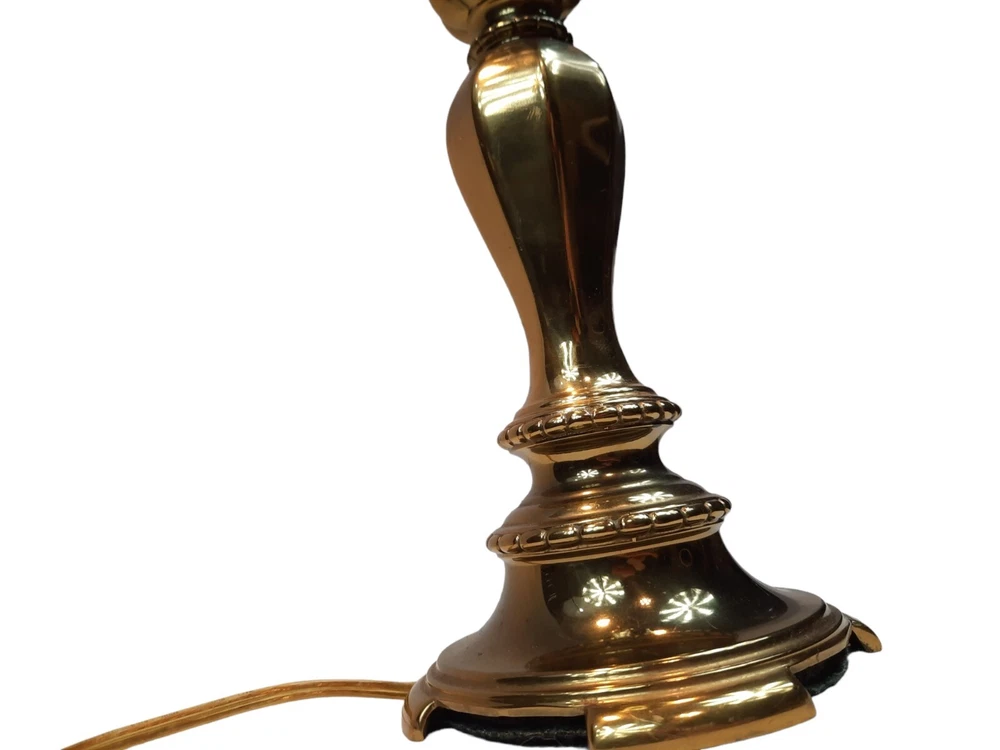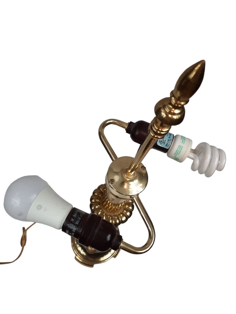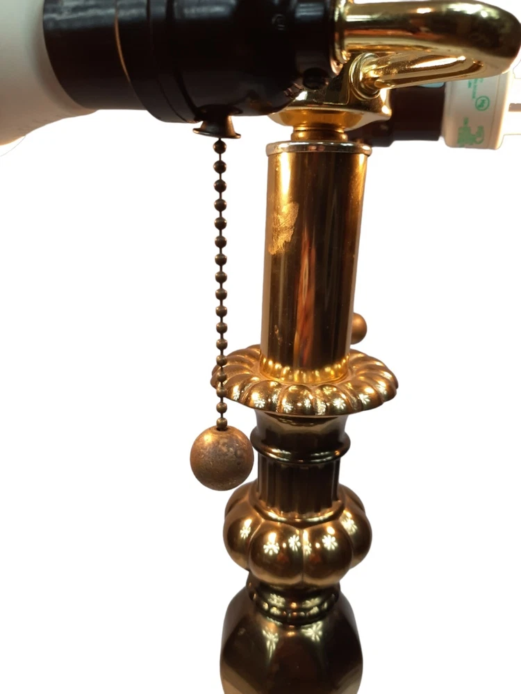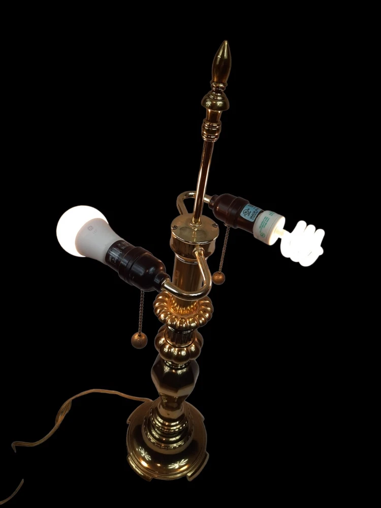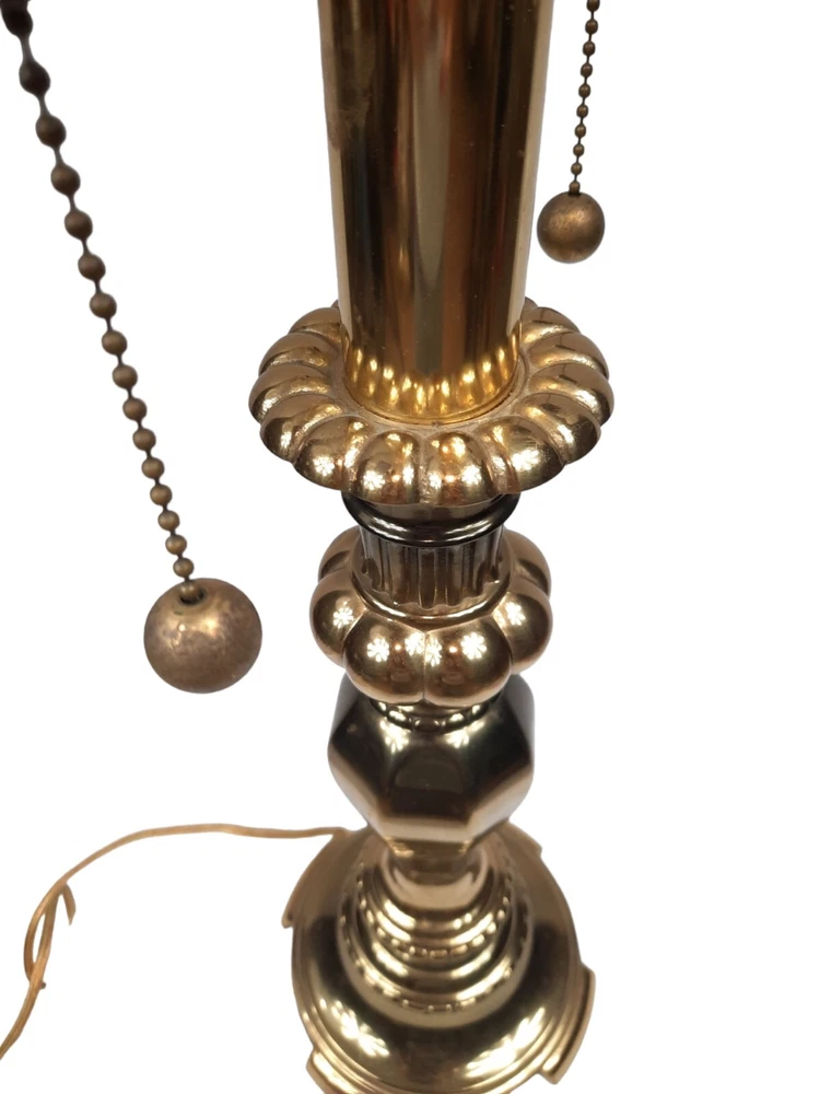 Candle Stick Hollywood Regency Design Tall Vintage Brass & Wood Table Lamp. In excellent condition Brass Candle Stick Lamp Large Hollywood Regency Vintage 1950s. Mid-century Modern, Hollywood Regency brass candlestick table lamp in Vintage bronze finish, with dual bulbs, and brass bell pull strings. Measurements 6.75ʺ W 8.5ʺ D 26.75ʺL STYLES Hollywood RegencyTraditional PERIOD 1950s ITEM TYPE Vintage, Antique or Pre-owned MATERIALS Brass Not included light bulbs or shade. This is a pre-owned item that may show signs of wear. In excellent condition, no flaws.