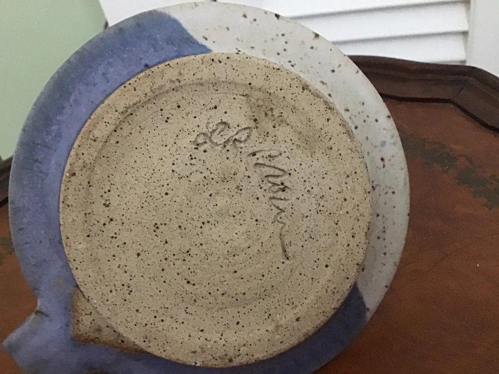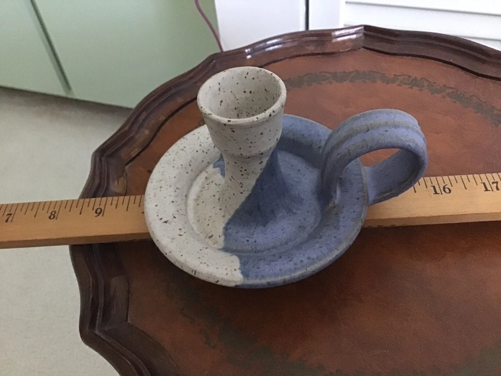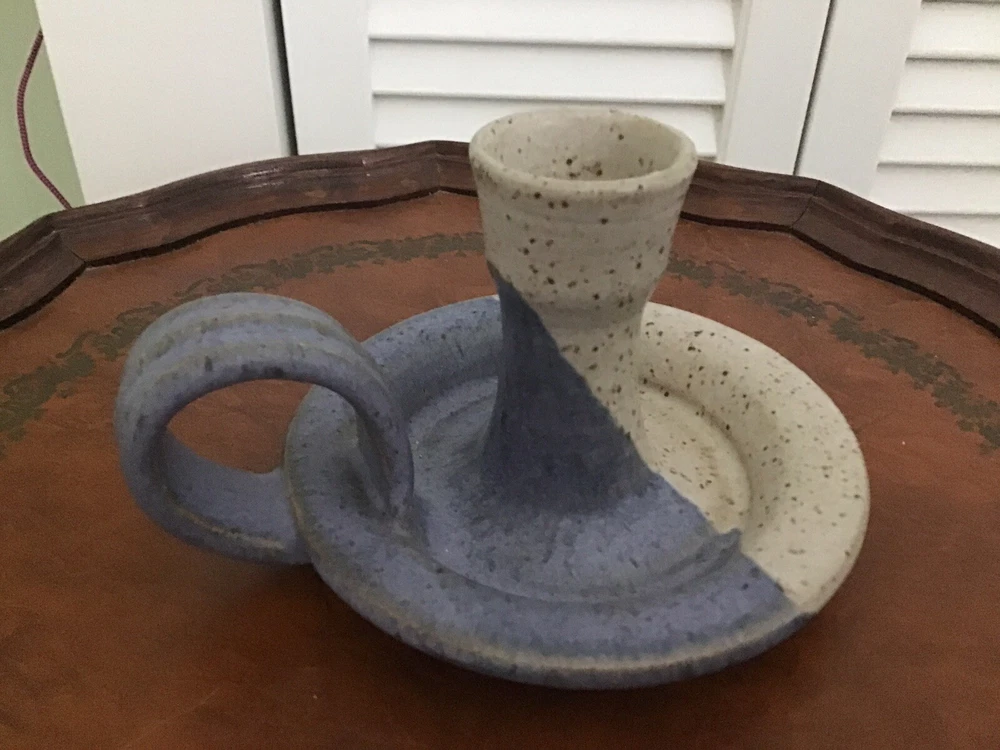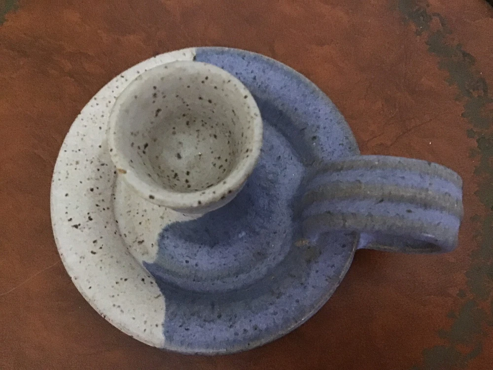 Unusual pottery Candle Holder ,measures approx. 5.50” wide Inc. finger loop x 3.00 high From North Carolina Signed