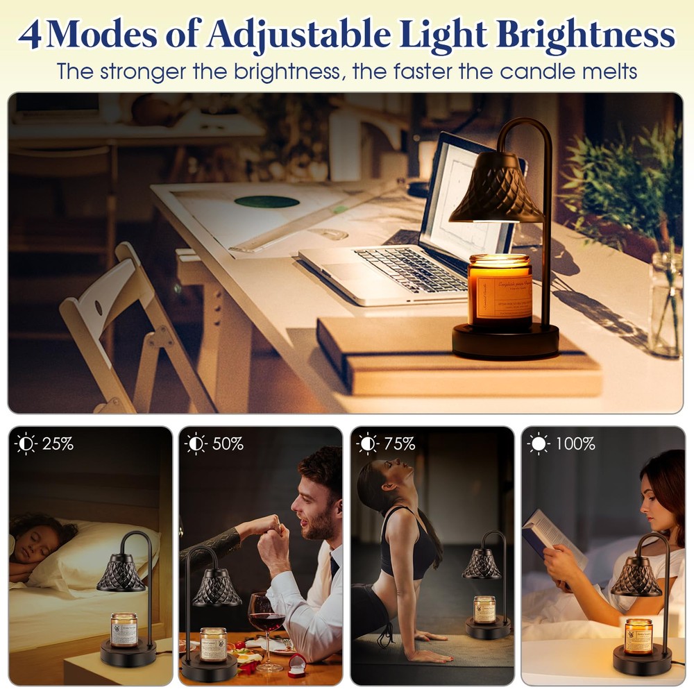 Illuminate Warmth, Relieve Stress: 4-Level Brightness Adjustable Scented Candle Lamp. Our wax warmer for scented wax is thoughtfully designed with 4 brightness levels (25%, 50%, 75%, 100%), allowing you to freely adjust the light intensity according to your mood and occasion. The soft glow paired with delightful aromas instantly creates a soothing and comfortable environment, helping you effectively relieve stress and enjoy every moment Fall Asleep Easily, Enjoy a Quiet Night: Our candle warmer lamp with timer is specifically designed to help you fall asleep faster, featuring smart timer settings (2H, 4H,, 8H,). 2-hour timer, Perfect for short relaxation sessions or pre-sleep reading. 4-hour timer, Provides a continuous comforting atmosphere for extended meditation or deep relaxation. 8-hour timer: Offers all-night companionship, ensuring you sleep soundly in a warm and cozy environment. Using our candle warmer with timer for a long time, the right light and fragrance can help regulate the body clock and promote better sleep Guard Your Family's Safety, Warm Every Moment: Invest in the Safety and Happiness of Your Loved Ones with Our Candle Lamp! Our candle warmer lamp is equipped with two 35W halogen bulbs, providing a safer and more reliable lighting solution for families with children and pets, helping to avoid potential fire risks. Turn it on and it lights up immediately, reaching optimal brightness quickly. Whether you're reading with your child at night or creating a warm ambiance, it meets your needs. Illuminate Your Home, Embellish Your Life:Choose our candle warmer lamp black, and you're not just selecting a lighting tool but adding a beautiful piece of art to your home. The unique rhombus-shaped lampshade adds a touch of fashion and artistry, making it a standout feature in any room.Crafted from durable metal, and treated for anti-oxidation to ensure it remains shiny and new even after prolonged use. The sturdy base design ensures stability and safety, making it perfect for families with children and pets. The Best Present for Candle Lovers: Electric candle warmer lamp for jar candles is an amazing present! A practical and decorative candle warmer with timer. Especially suitable for expressing love to family, lovers or friends on Mother's Day, Father's Day, Valentine's Day, housewarming or other holidays and special occasions. Functional decorative nightlight for bedroom decor, living room decor aesthetics, study, office, yoga room or spa Precision Heating Without Open Flame: No complicated equipment is needed, just a candle warmer can achieve the function of the saucepan. Safely melt chocolates, warm wines, and soften cheeses with adjustable heat settings,eliminating messy stovetop spills while creating ambient lighting for dessert parties or romantic dinners. The candle warmer lamp, with its unique design, ensures even heating and maintains the best taste of food.