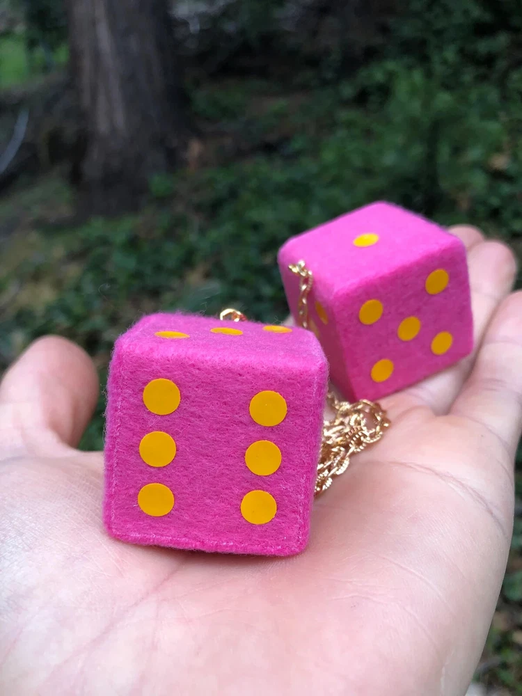 Dot colors available: black, white, medium blue, medium green, purple, orange, red, yellow, golden yellow, pink, hot pink, metallic gold, and metallic silver. Chain or Cord available: silver chain, gold chain, black chain, brass chain, white nylon cord, black nylon cord, blue nylon cord, gray nylon cord, red nylon cord, brown leather cord, beige hemp cord, tan nylon cord, purple nylon cord, Kelly green nylon cord, chocolate brown nylon cord, burgundy nylon cord, turquoise nylon cord, rose pink nylon cord, and yellow nylon cord. Just send us a message is you'd like your choice of dot, chain, or cord color. Item available is a nice new set of Candy Pink Fuzzy Dice mirror hangers. Golden yellow pips (dots). For a car or truck. Strong assembly, attaches to a standard car or truck mirror. Pieces measure approx. 1.38 x 1.38 x 1.38 inches. Made of solid maple wood, metal, and fabric. Approx. 13" long chain or cord. Works great if wrapped twice around mirror. Hand made with pride in U.S.A. You will receive an item in stock. Thanks and good luck on this one!