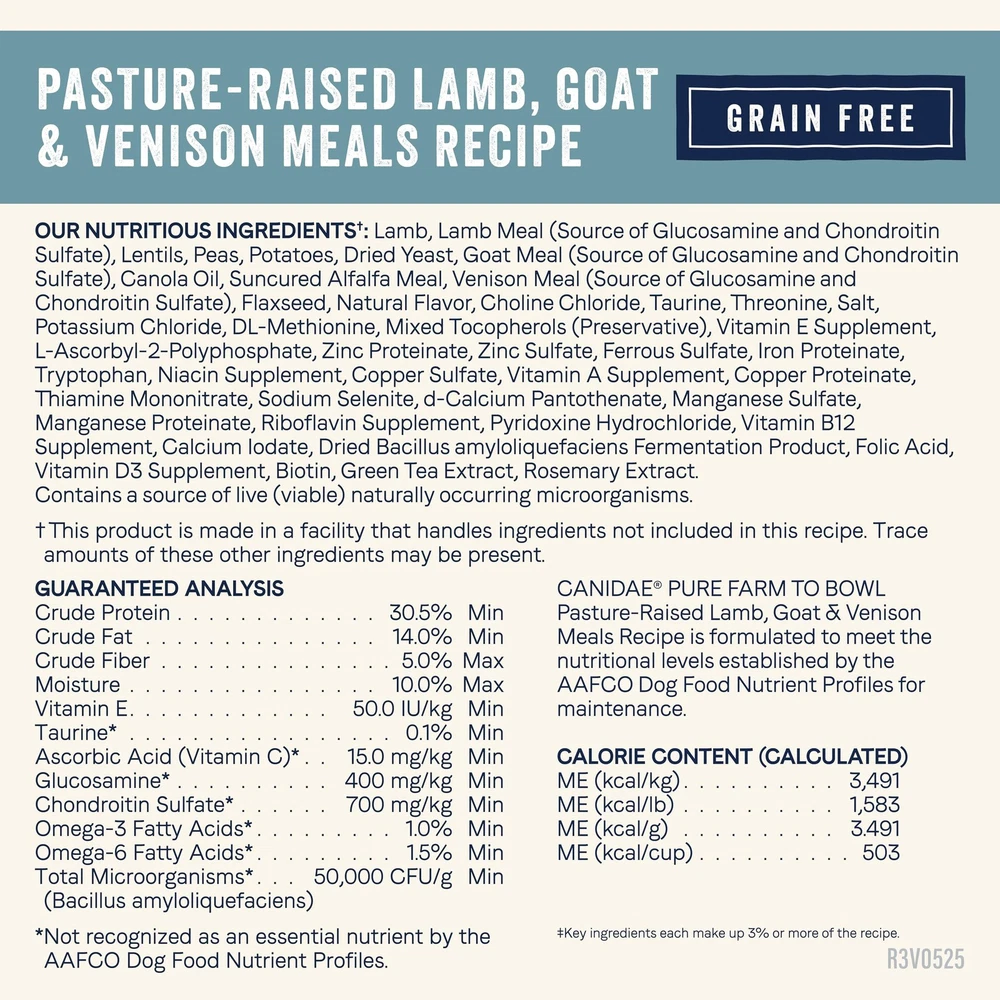 Canidae Pure Farm to Bowl Pasture-Raised 22 Pound (Pack of 1), Dog Food Dry Description Canidae Pure Farm to Bowl Pasture-Raised Lamb with Goat & Venison meals was born from our belief that quality pet food starts long before it reaches the bowl. It starts in the soil, with farmers we trust and through the choices we make. That’s why we use responsibly sourced proteins and regeneratively farmed ingredients that help restore soil and promote biodiversity. Our grain-free dry dog food is cooked in our Brownwood, Texas facility in small batches with leading safety, quality and nutritional standards. Responsibly sourced nutrition from the farm to your dog’s bowl. Features: Pasture-raised lamb is our #1 ingredient, combined with goat and venison meals to support strong muscle development and maintenance. Our nutrient-dense ingredients are sourced from a network of trusted farmers that use regenerative farming to help restore and promote healthy soil and support a healthy ecosystem. Made with 10 or fewer key ingredients, without any corn, wheat, soy, artificial flavors, colors, or preservatives. Our lamb dog food is proudly cooked in small batches at our own facility in Brownwood, Texas with leading safety and quality standards. Product Details: Handling We will ship all orders within 3 business day of payment. Delivery We Do Not Ship Outside of the Continental US. Return Policy All items qualify for returns within 30 days of receipt. Buyer is responsible for return shipping on any item that is not damaged. Feedback We take our reputation seriously, we buy and sell online, so we understand the value of trust. If you are unsatisfied with your order, please contact us and we will work with you to resolve it to your satisfaction.