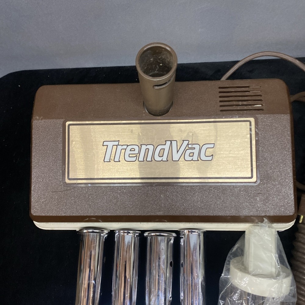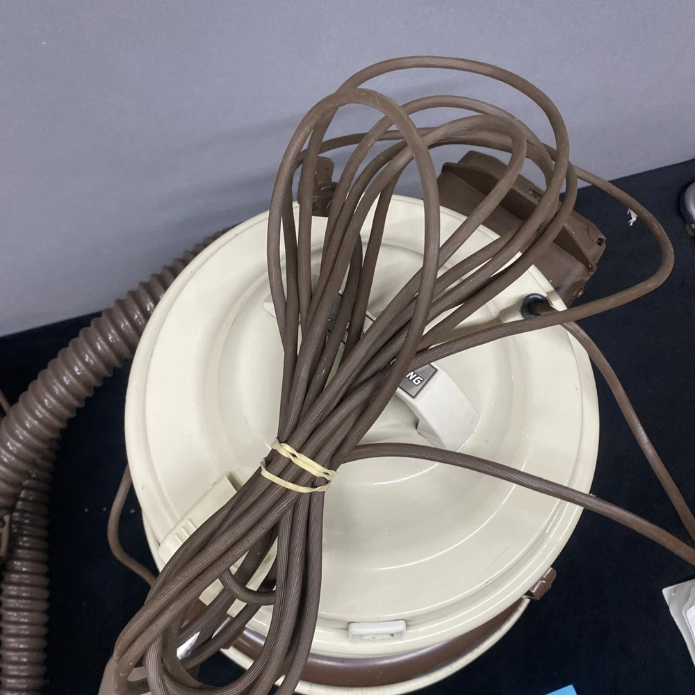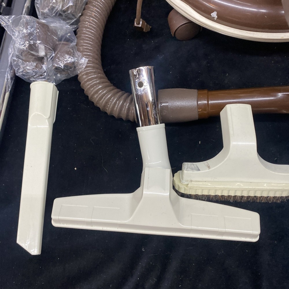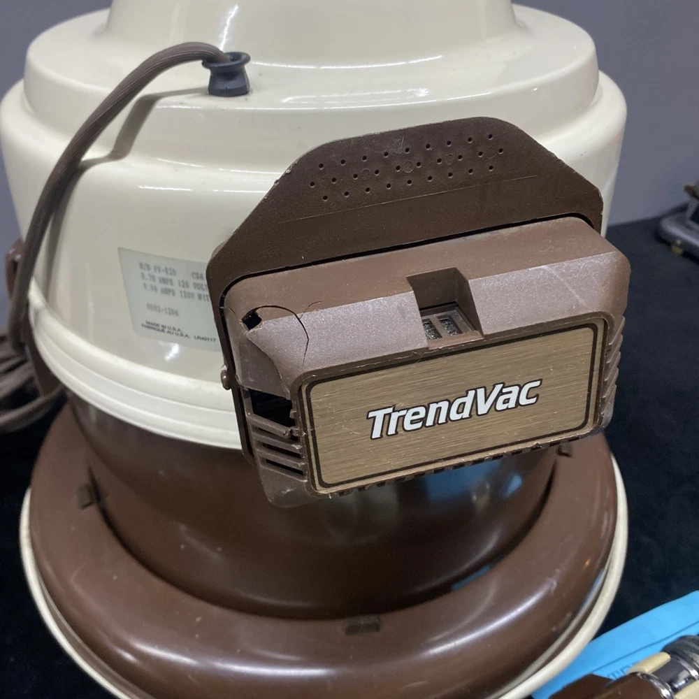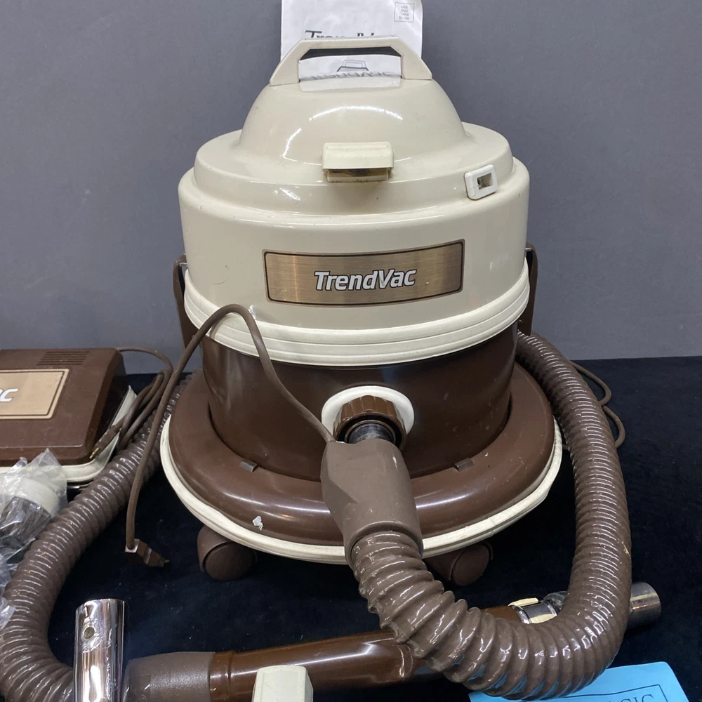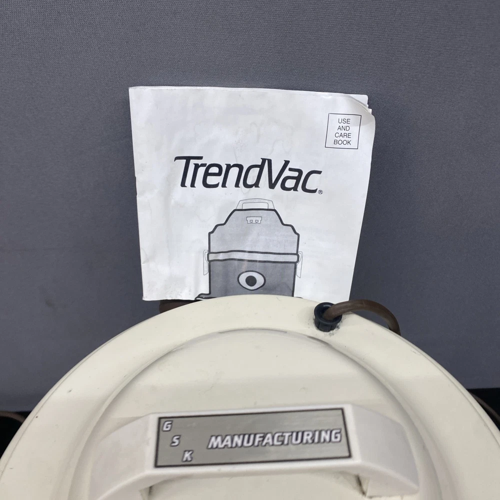 The Vintage TrendVac canister vacuum by GSK Industries is a stylish and functional cleaning tool in a tan brown color. This bagged vacuum cleaner includes a variety of accessories such as a nozzle, filter, extension wand, floor brush, upholstery brush, and crevice tool. With its portable design and rotating brushes, this corded vacuum is perfect for efficiently cleaning your home with ease. COMES WITH ONE PARTIALLY USED FILTER BAG SO YOU CAN REORDER MORE HAS A CRACK ON THE FILTER IZER ATTACHED OVER EXHAUST. WASHABLE FILTER INSIDE IS STAINED BUT STILL REUSEABLE. HAS OTHER SCRATCHES AND WEAR TO THE FINISH. STILL WORKS GREAT. EXCELLENT SUCTION. Instructions are damaged and half of book is missing.