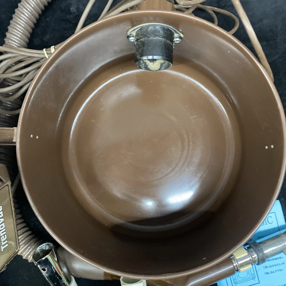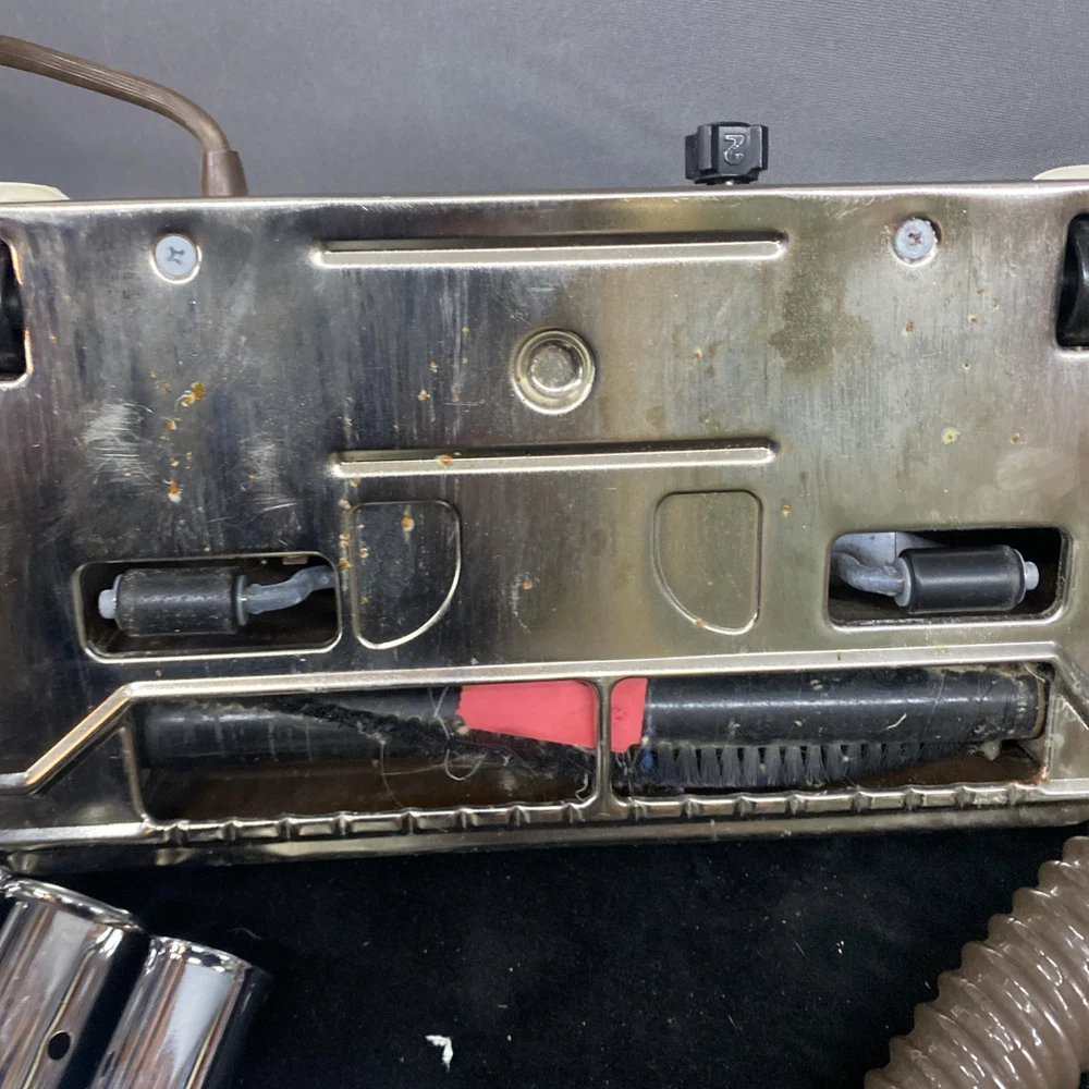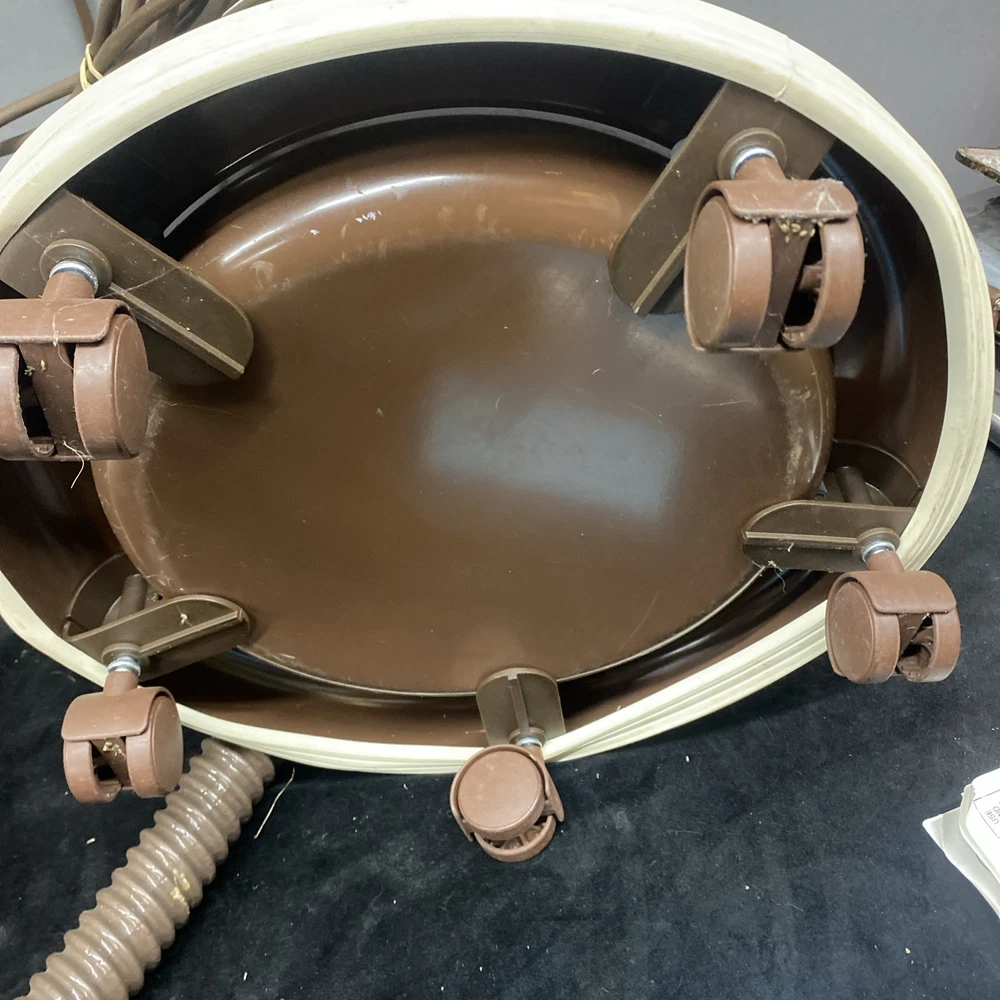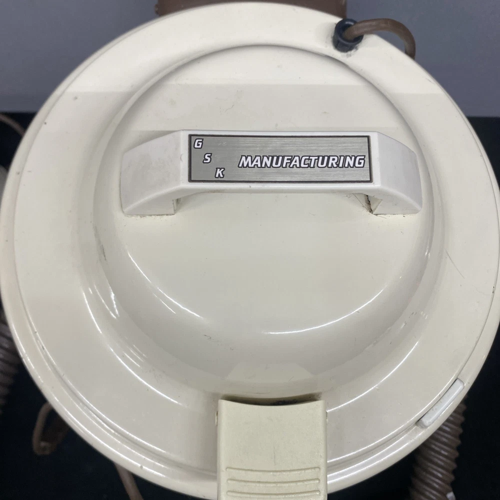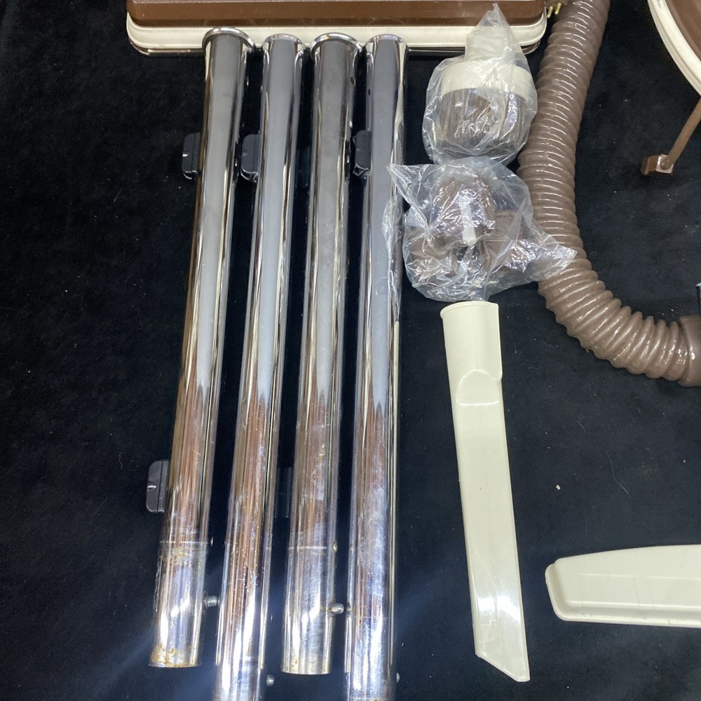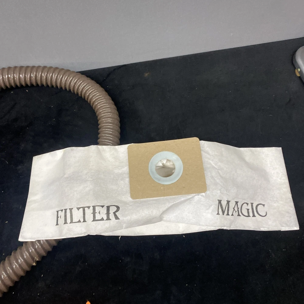 The Vintage TrendVac canister vacuum by GSK Industries is a stylish and functional cleaning tool in a tan brown color. This bagged vacuum cleaner includes a variety of accessories such as a nozzle, filter, extension wand, floor brush, upholstery brush, and crevice tool. With its portable design and rotating brushes, this corded vacuum is perfect for efficiently cleaning your home with ease. COMES WITH ONE PARTIALLY USED FILTER BAG SO YOU CAN REORDER MORE HAS A CRACK ON THE FILTER IZER ATTACHED OVER EXHAUST. WASHABLE FILTER INSIDE IS STAINED BUT STILL REUSEABLE. HAS OTHER SCRATCHES AND WEAR TO THE FINISH. STILL WORKS GREAT. EXCELLENT SUCTION. Instructions are damaged and half of book is missing.