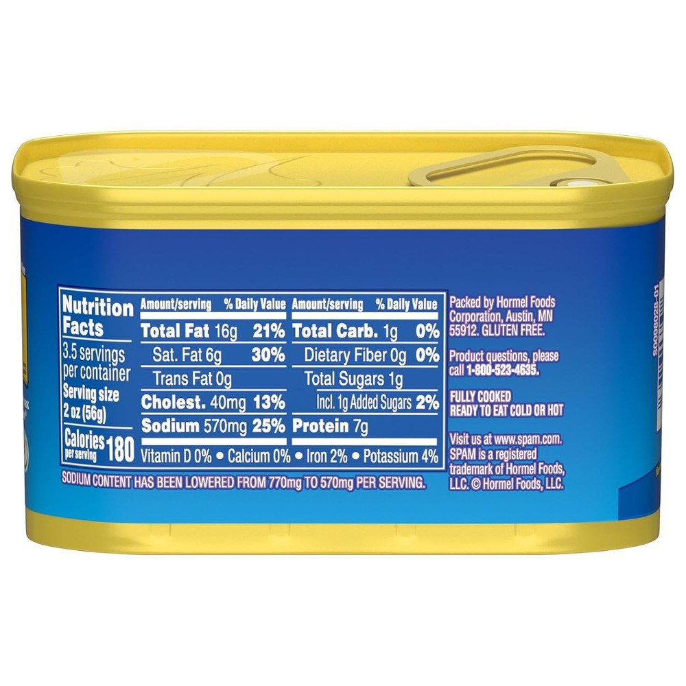 Canned Pork 7oz Less Sodium 12-Pack for Breakfast Lunch Dinner ‹ › ‹ › ‹ › ‹ › ‹ › ‹ › ‹ › ‹ › Discover the Deliciousness of SPAM Less Sodium - Flavor with Less Sodium! SIZZLE, PORK AND MMM! SPAM Less Sodium offers a mouthwatering taste that elevates any breakfast, lunch, or dinner. With 25% less sodium than the classic, this iconic, fully cooked, shelf-stable meat is perfect for adding a burst of flavor to your favorite dishes like omelets, mac & cheese, burgers, tacos, pasta, or eggrolls. Great for Every Meal – Enhances breakfast, lunch, dinner, and snacks with meaty goodness. Versatile Usage – Ideal for sandwiches, casseroles, bbqs, and more. Convenient & Long-lasting – Fully cooked, shelf stable, with twelve 7 oz cans included. Healthier Choice – Enjoy the same great taste with 25% less sodium. Stock up now! A taste everyone loves, but supplies are limited. Add some meaty goodness to your pantry and enjoy delicious meals any time of day with SPAM Less Sodium. Trust in a Global Icon – Fully cooked, shelf-stable, and loved worldwide for quality and flavor. Don't wait — add deliciousness to your cart today! Shipping Free & Fast Shipping - We offer free shipping to most of the USA with a normal delivery time of 3-7 days. However, due to the current situation, additional delivery time (up to 3 weeks) may be required for some items. Alternative Carriers - We may use alternative carriers (e.g. USPS, FedEx, UPS, etc.) to ensure your package arrives safely and on time. Due to the use of multiple carriers, we are unable to provide a tracking number automatically. Handling Time - Orders are processed and shipped within 1-2 business days of receiving cleared payment. Shipping Restrictions - Shipping to Alaska, Hawaii, Puerto Rico, Guam, and other US territories may incur shipping charges or delivery restrictions. Please contact us before ordering, or your order can be refunded/cancelled. State Restrictions - There may be restrictions based on your state of purchase. For example, certain items may not be shipped to California due to state regulations. Contact for Tracking Updates - If you require tracking updates or have any concerns about the delivery of your order, please feel free to contact us, and we will be happy to assist you. Return 30-Day Hassle-Free Returns - We want you to be completely satisfied with your purchase. If you are not, you can return the item within 30 days of receiving it for a full refund or exchange. Easy Return Process - To start a return, simply contact us and we will provide you with a prepaid return shipping label and detailed instructions. Restocking Fee - There are no restocking fees for returns. However, the buyer is responsible for return shipping costs if the return is not due to a seller's error. Refund Processing Time - Refunds will be processed within 5 business days of receiving the returned item in its condition. Payment We accept all major credit cards, PayPal, and Apple Pay for your convenience. Your payment information is secure and encrypted to ensure a safe and seamless transaction. Please complete your payment within 3 days of purchase to avoid any delays in shipping. Feedback Your feedback is extremely important to us. We strive to provide the best products and customer service possible. If you are satisfied with your purchase, please take a moment to leave us a positive review. If you have any concerns or issues with your order, please contact us before leaving negative feedback. We are committed to resolving any problems and ensuring your satisfaction. Contact Us If you have any questions or concerns, please feel free to out to our customer support team. You can contact us through the eBay messaging system. We are available Monday to Friday, 9:00 am to 5:00 pm EST, and we will do our best to respond to your inquiry within 24 hours. Buy it now and enjoy a pleasant shopping experience! Course: Breakfast Number in Pack: 12 Style: Less Sodium Unit Quantity: 7 oz Food Specifications: Gluten Free Allergens: None Product: Deli & Preserved Meat & Poultry Type: Pork Form: Spam Calories per Serving: 100 Number of Servings: 12 Serving Size: 1 Can Item Weight: 7 oz